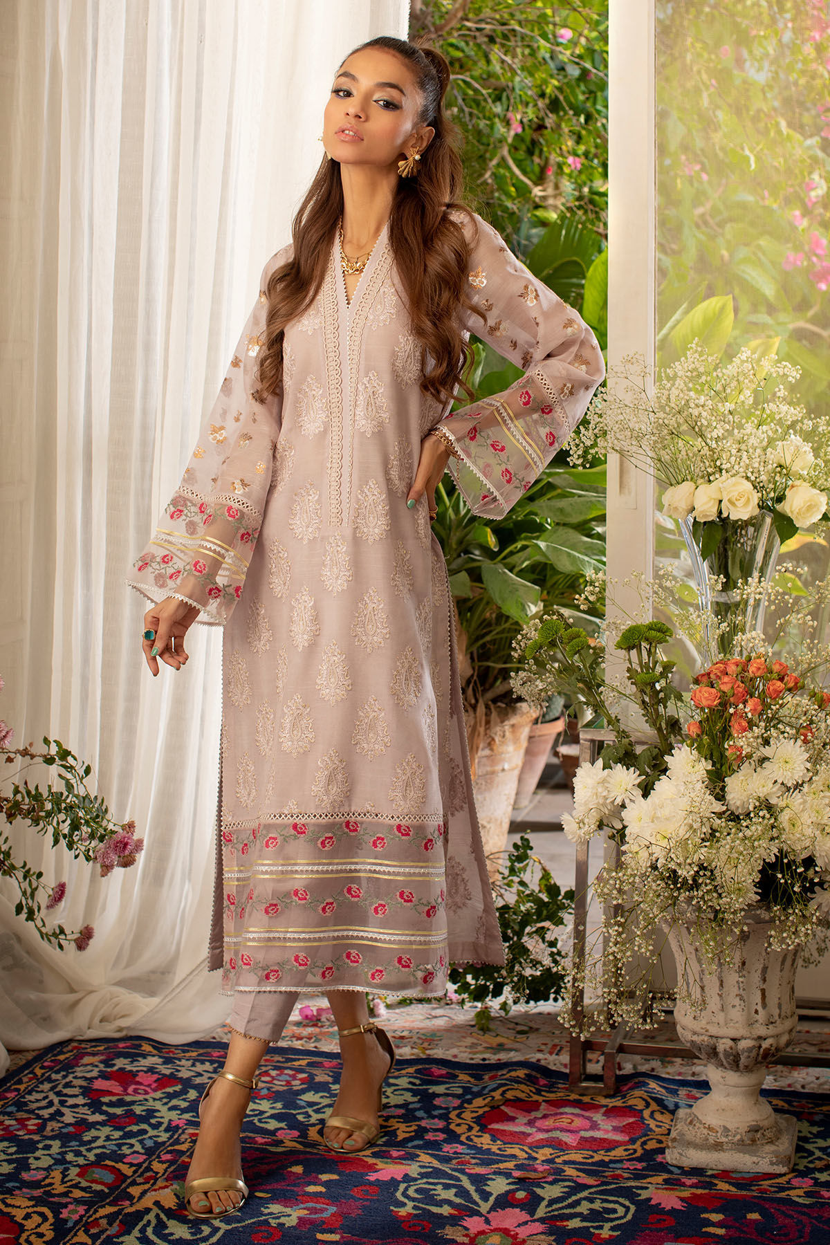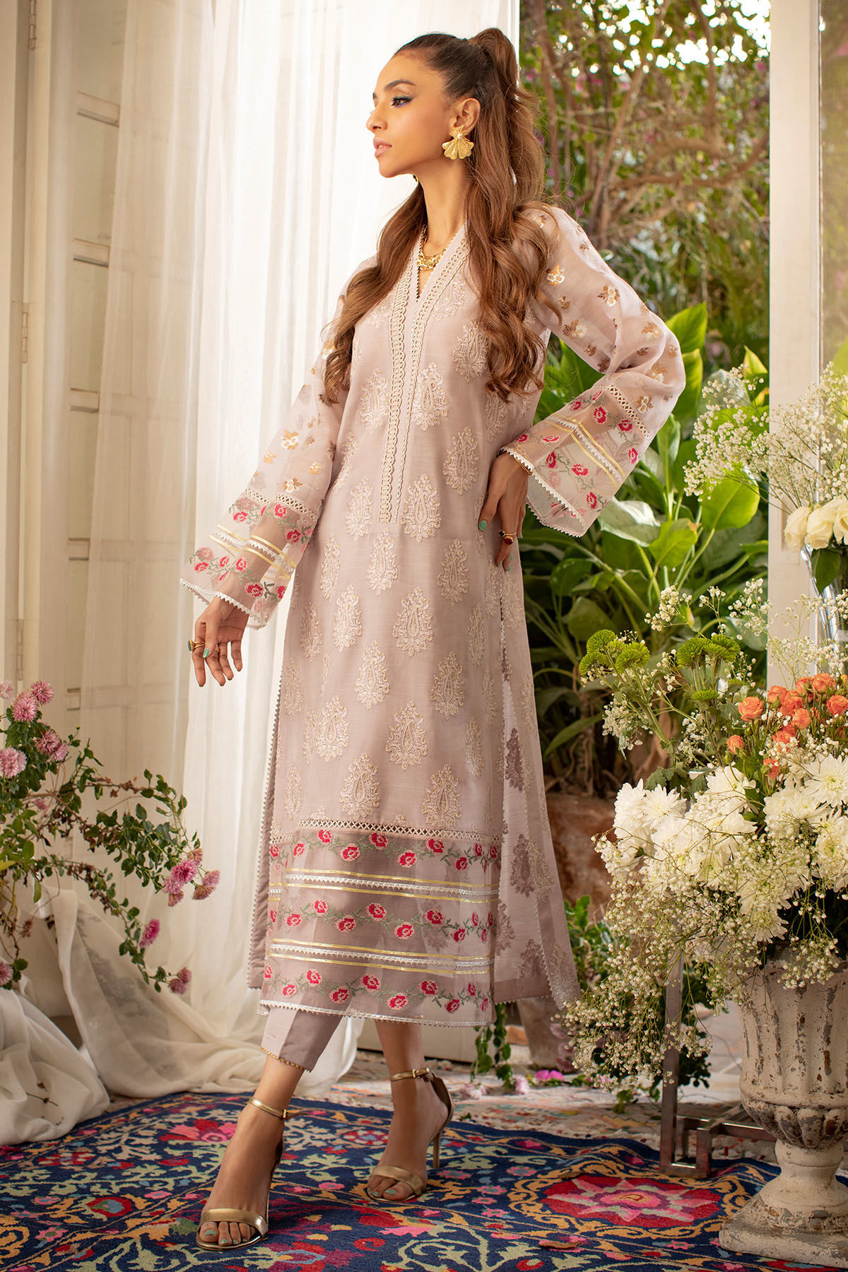 Long silhouette shirt on lilac embroidered raw silk canvas featuring cross stitch embroidered details enhanced with silver and gold gota details on the hemline.