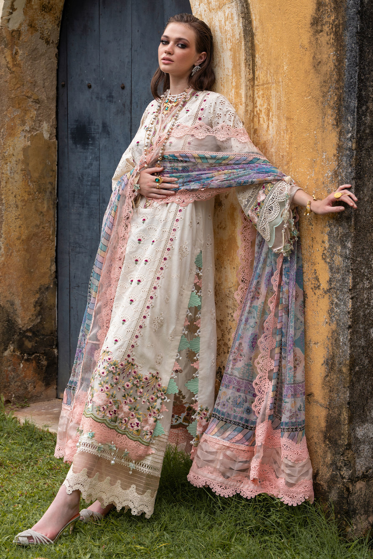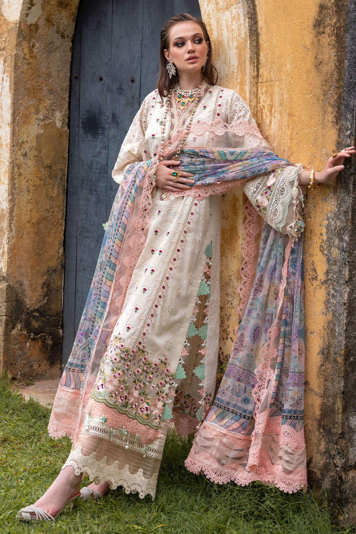 Showcasing a surreal symphony, 'Amal' features subtle minimalism on a dreamy powder pink canvas, the centre front showcases intricate schiffli details. The sheer organza panel on hem with bold silk thread floral details and scalloped embossed borders add an artistic finesse to the ensemble. Bold composed dupatta with floral and geometric details is sure to set you apart this summer season.