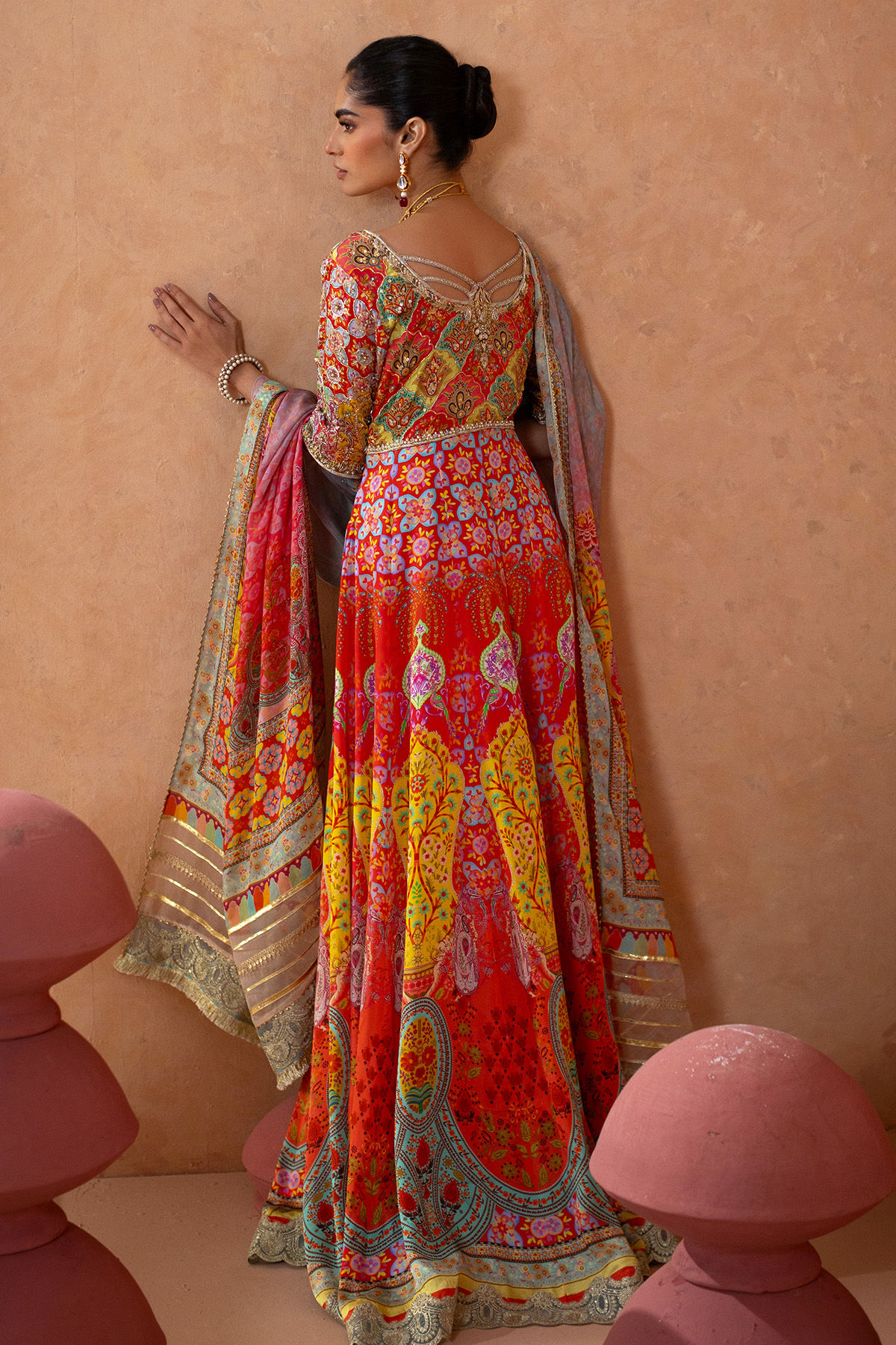 The floor-length Kalidar is presented in captivating shades of coral, sea green, and ochre, crafted from silk canvas. It showcases intricate zardozi embellishments on the bodice and sleeves. The centre back of the Kalidar is elegantly adorned with exquisite zardozi accents, highlighted by a deep-cut neckline. Accompanying the Kalidar is a silk printed dupatta, detailed with gota work on the panels. This Kalidar may be tastefully paired with matching straight-cut raw silk pants.