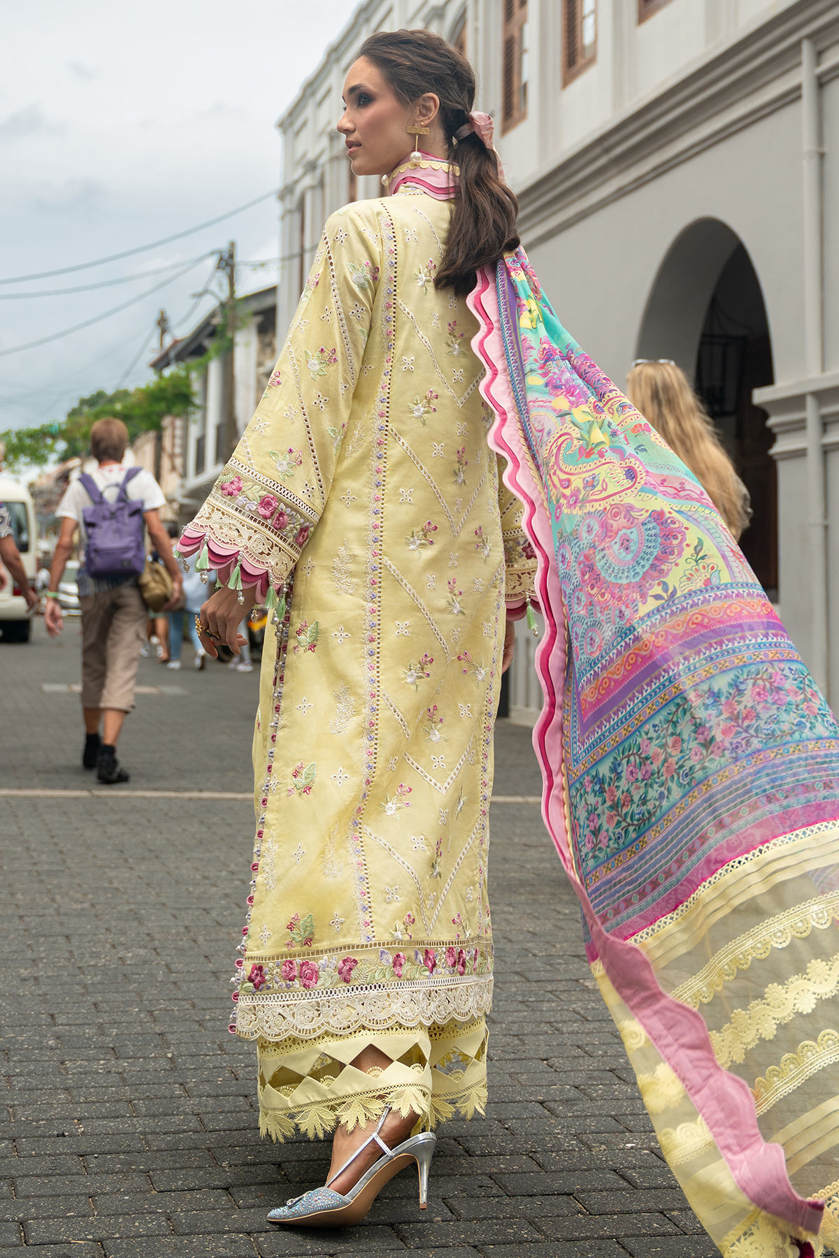 Designed on a vibrant floral canvas, 'Baneera' showcases artful schiffli craftsmanship enhanced with soft thread highlights along the front and sleeve borders. The neckline is framed with delicate detailing, while organza trims finished with laser accents add dimension to the silhouette. Paired with lightweight lawn trousers and a chiffon dupatta in complementary shades, it embodies effortless summer elegance.