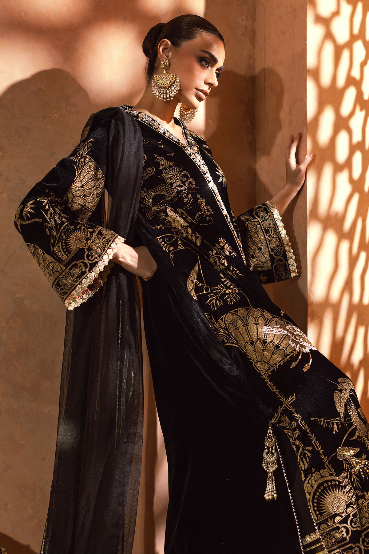 A-line shirt crafted from a black velvet fabric, adorned with intricate floral and fauna imagery rendered entirely in gold. This exquisite imagery is further enhanced with meticulously handcrafted zardozi embellishments. The elegantly overlapping neckline is designed to perfection, featuring light-catching crystals and zardozi detailing. The side slits are accentuated with elegantly dangling handcrafted tassels. This outfit is complemented by a net dupatta, which is embellished with gota accents and embroidered organza chandbali motifs on each pallu. The ensemble is accompanied by an izaar embellished with gota accents, setting you apart this festive season.