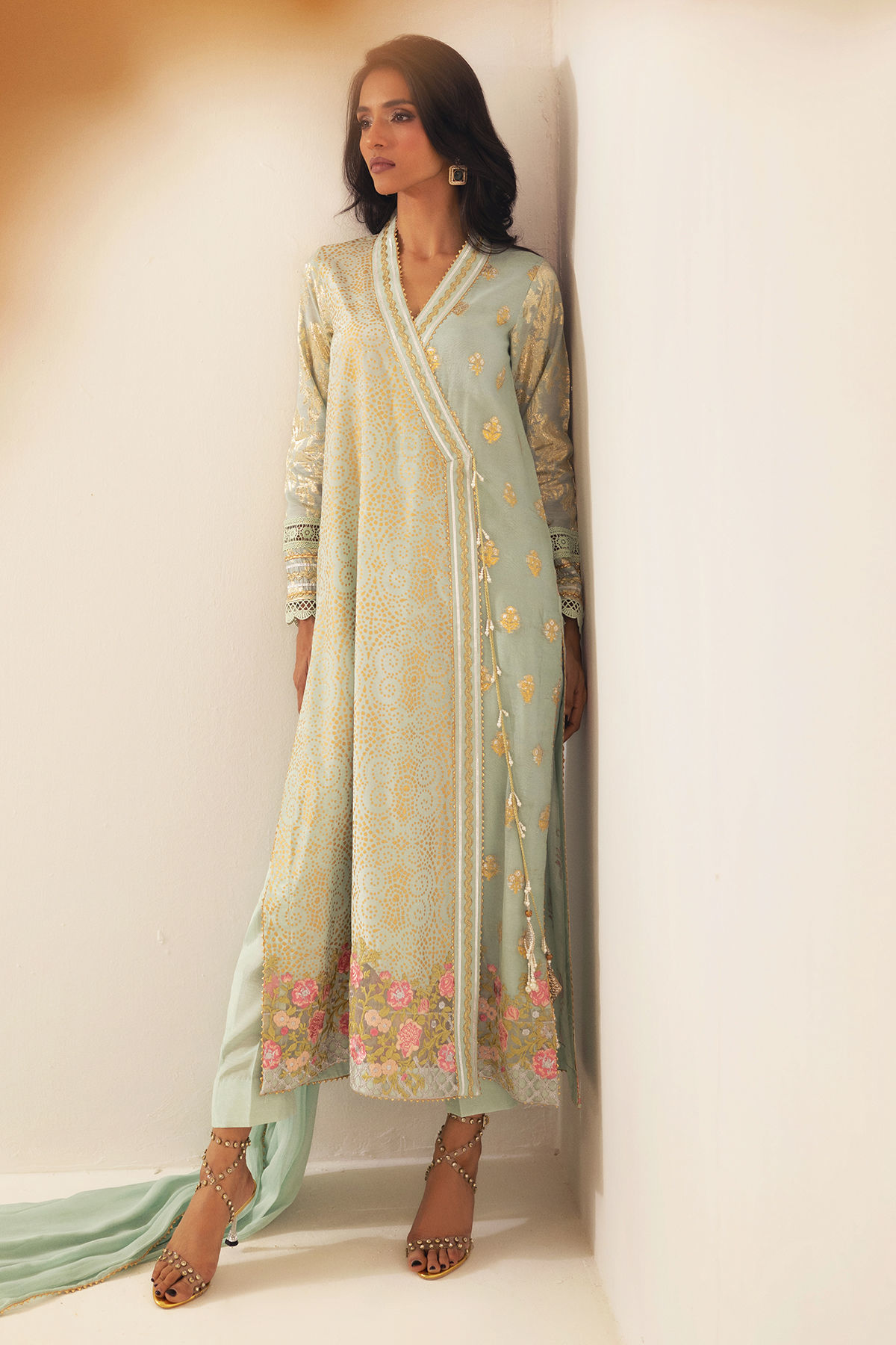 Long silhouette angharka crafted from raw silk and lorex canvas, featuring intricate embroidered details along the hemline. The center front is meticulously designed with elegant dangling tassels. This angharka is accompanied by matching raw silk pants and a chiffon dupatta, which is exquisitely finished with gota lace, ensuring you stand out during this festive season.