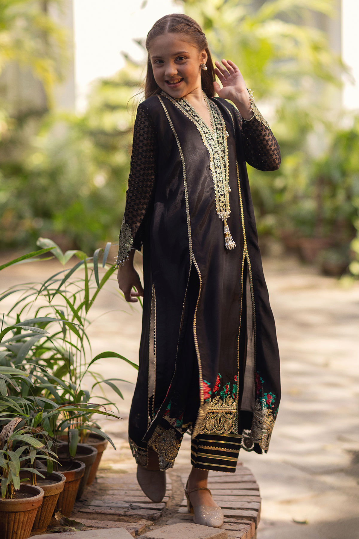 A long-silhouette shirt crafted in classic black silk, elegantly detailed with delicate pearl embellishments along the neckline for a subtle, refined shimmer. The sleeves are fashioned in lustrous Lurex and adorned with intricate pearl accents, adding a contemporary touch. The hem is finished with rich gold zari work and embroidered borders, enhancing the silhouette with artisanal depth. The ensemble is paired with a silk azaar featuring refined gota detailing and is completed with a chiffon dupatta, adorned with graceful hand block–printed details for a polished, sophisticated finish.