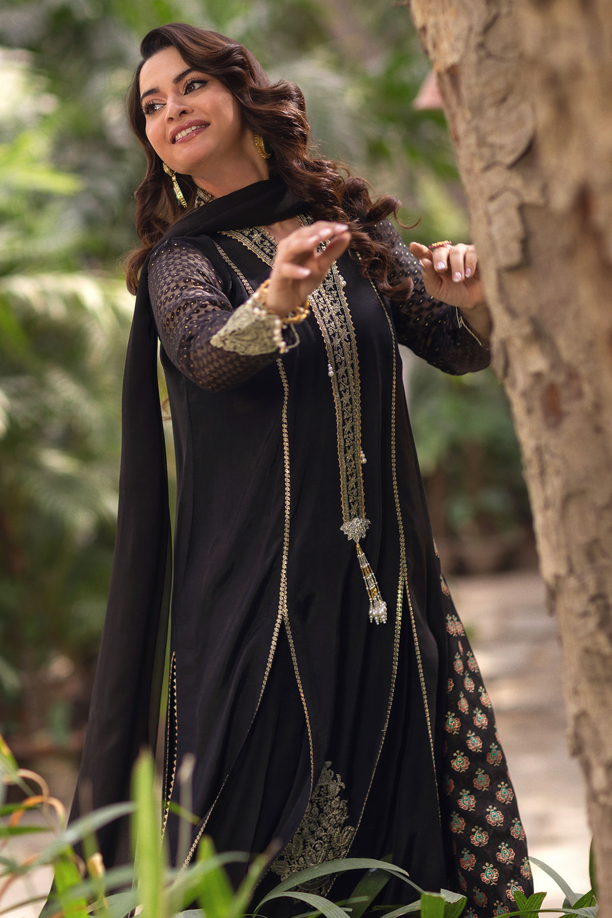 A long-silhouette shirt crafted in classic black silk, elegantly detailed with delicate pearl embellishments along the neckline for a subtle, refined shimmer. The sleeves are fashioned in lustrous Lurex and adorned with intricate pearl accents, adding a contemporary touch. The hem is finished with rich gold zari work and embroidered borders, enhancing the silhouette with artisanal depth. The ensemble is paired with a silk azaar featuring refined gota detailing and is completed with a chiffon dupatta, adorned with graceful hand block–printed details for a polished, sophisticated finish.