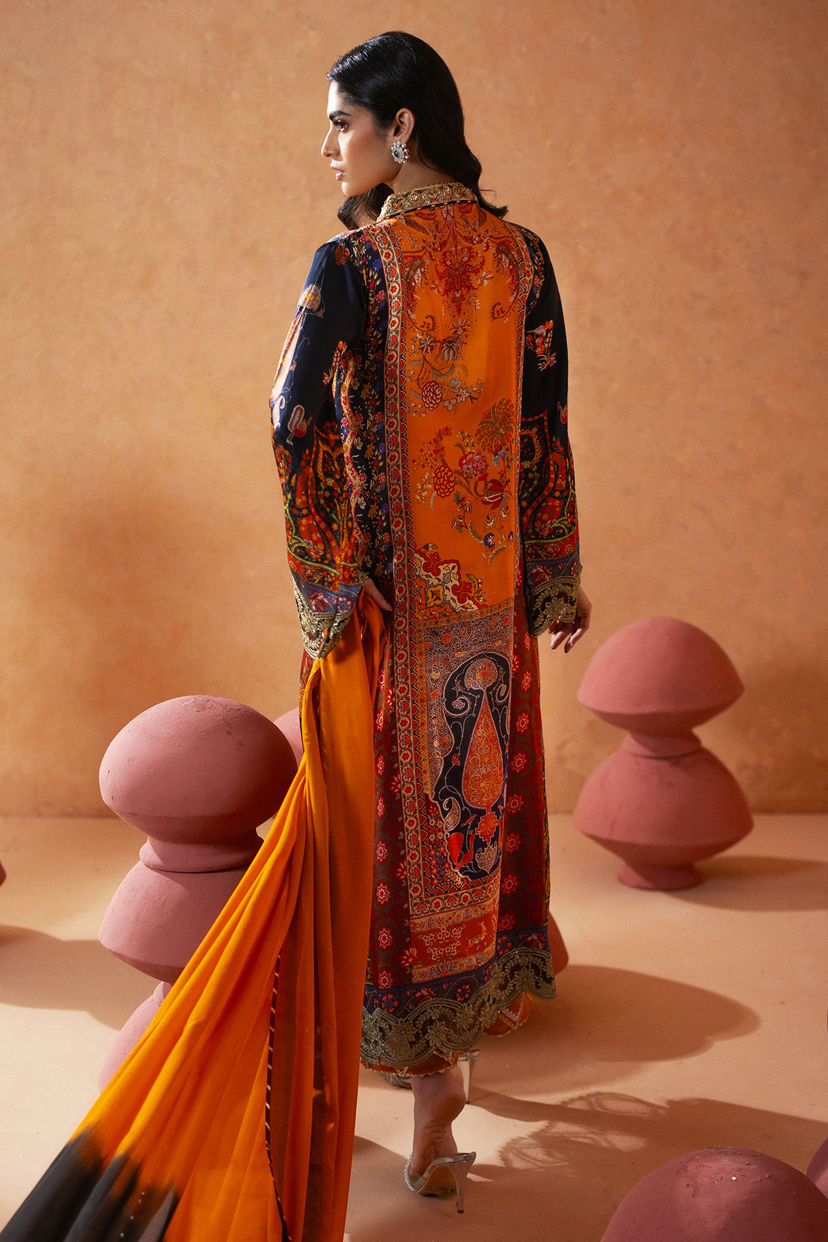 Long silhouette A-Line shirt in deep rust, black, and maroon, inspired by intricate Kashmiri embroidery details. The center front is adorned with aari and zardozi embellishments in silver, gold, and antique finishes. The neckline is richly embellished with traditional dabka and kora techniques. The hem features an accentuated zari border. This outfit is complemented by an ombre dupatta and can be paired with matching raw silk pants, ensuring a striking presence this festive season.