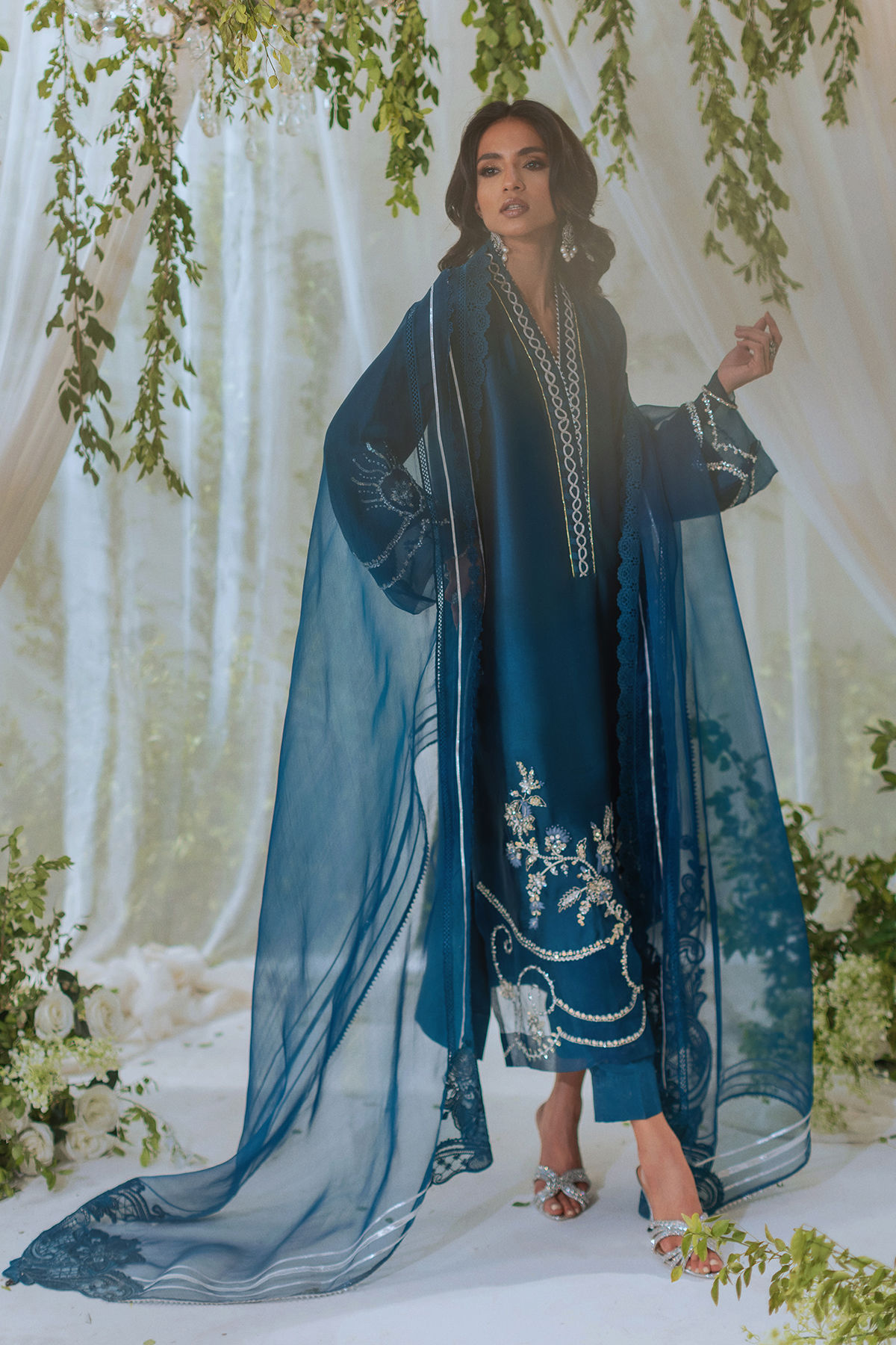 Long silhouette shirt on silk canvas in stunning laips blue featuring all silver zardozi and resham details on hemline and sleeves. The shirt comes with matching straight pants and an organza dupatta featuring delicate appliqué motifs on each pallu further adorned with gota accents.