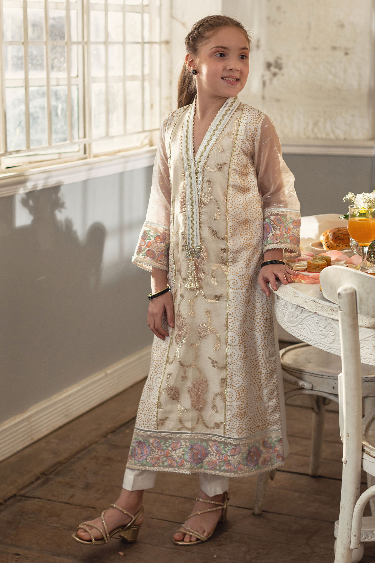 An elongated A-line shirt in pristine white, subtly highlighted with hints of gold, features a lustrous Lurex panel at the center front . The sleeves are crafted in shimmering Lurex, adding a contemporary contrast to the silhouette. Intricate hand block–printed detailing further enhances the side panels, while the neckline is enriched with delicate gota work, handcrafted zardozi And pearl embellishments. The hem and sleeves are finished with refined embroidered borders. The ensemble is completed with coordinated straight pants and an ombre chiffon dupatta, adorned with hand block–printed details and finished with a touch of shimmering gota.