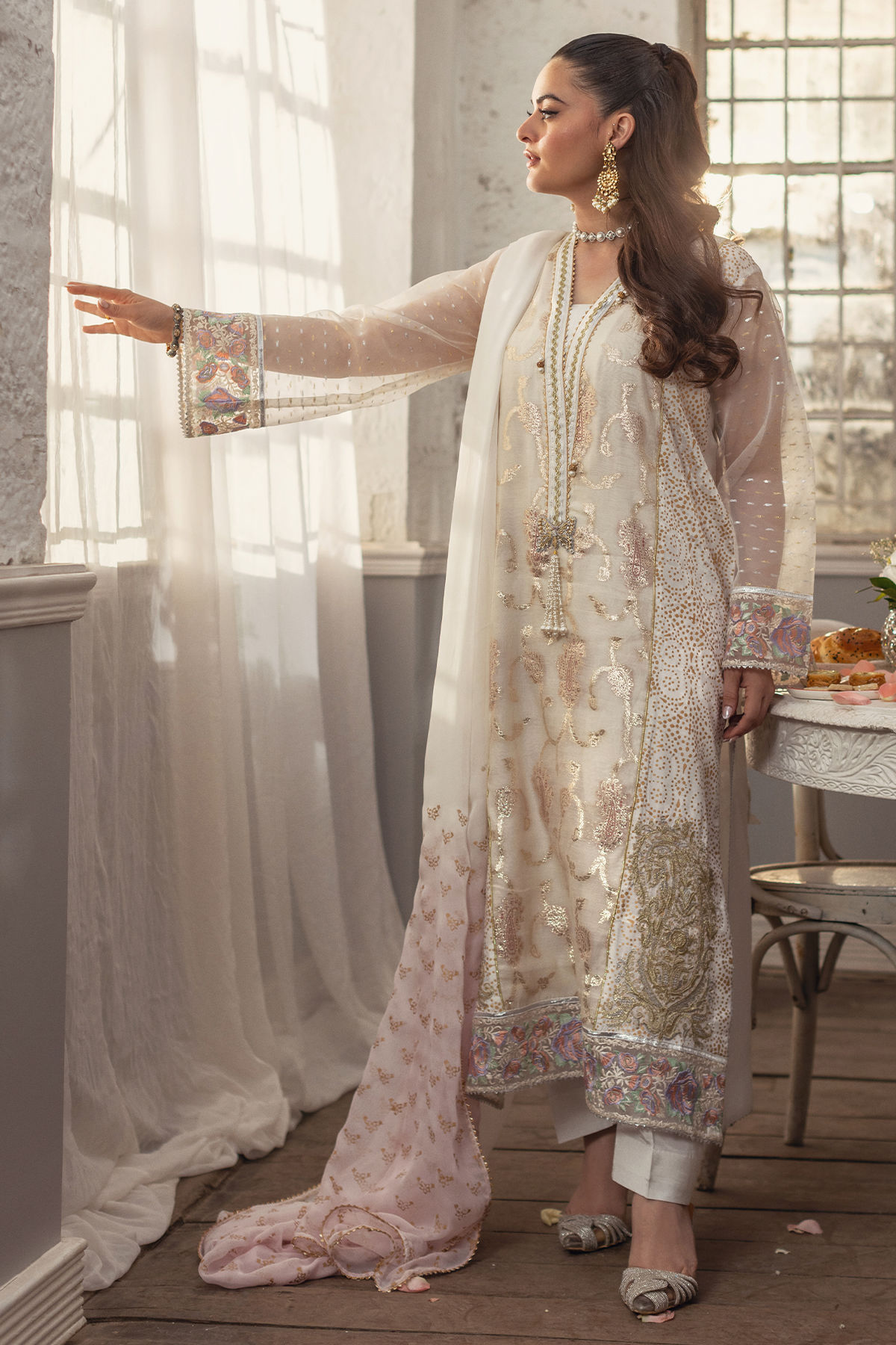An elongated A-line shirt in pristine white, subtly highlighted with hints of gold, features a lustrous Lurex panel at the center front . The sleeves are crafted in shimmering Lurex, adding a contemporary contrast to the silhouette. Intricate hand block–printed detailing further enhances the side panels, while the neckline is enriched with delicate gota work, handcrafted zardozi And pearl embellishments. The hem and sleeves are finished with refined embroidered borders. The ensemble is completed with coordinated straight pants and an ombre chiffon dupatta, adorned with hand block–printed details and finished with a touch of shimmering gota.
