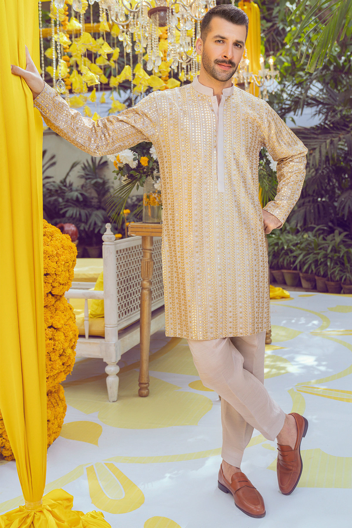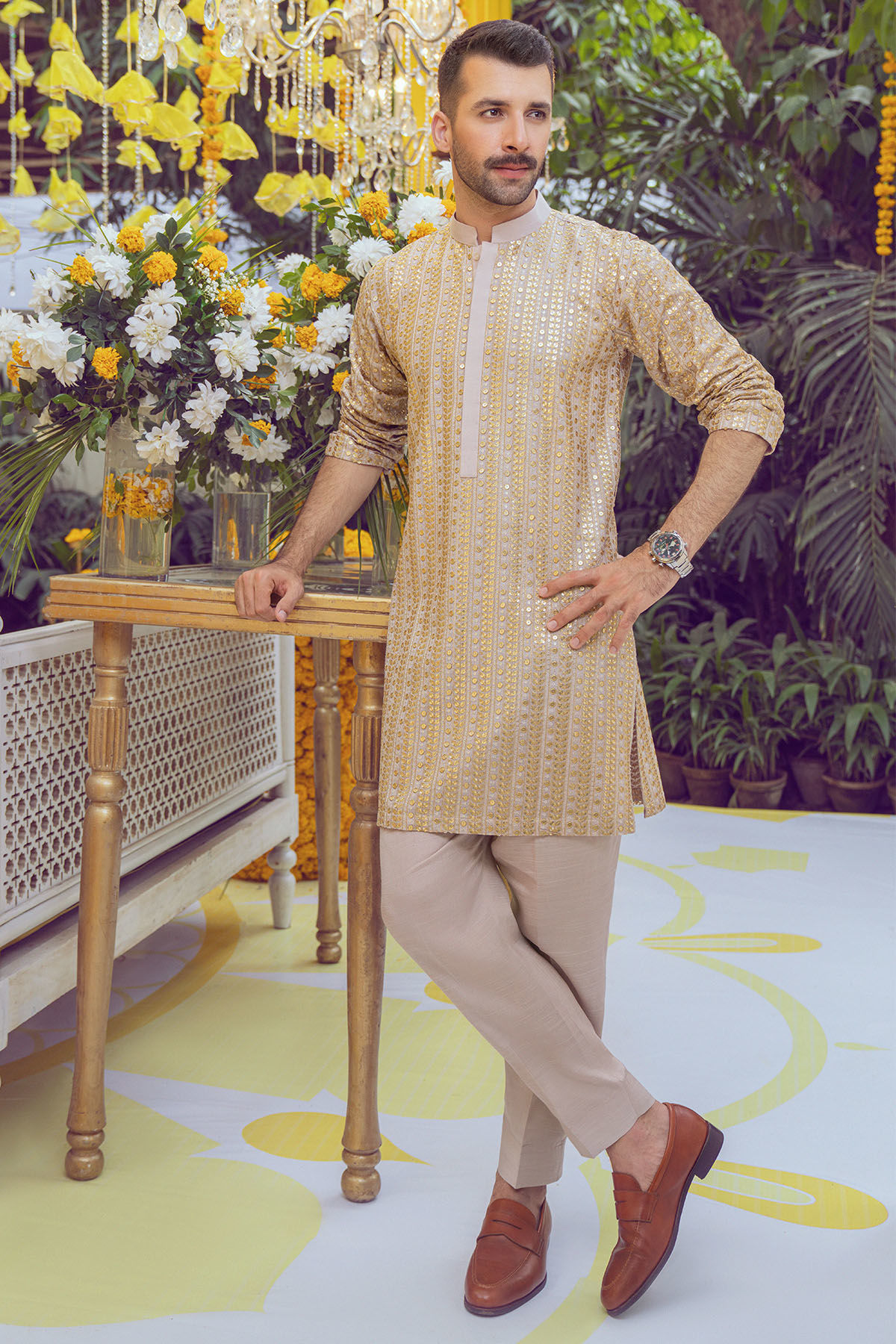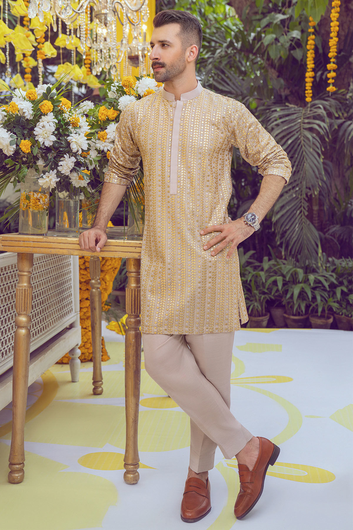 Short length kurta on raw silk canvas in subtle sand shade featuring zari and sequins details on front back and sleeves. The kurta is paired with straight raw silk matching pants.