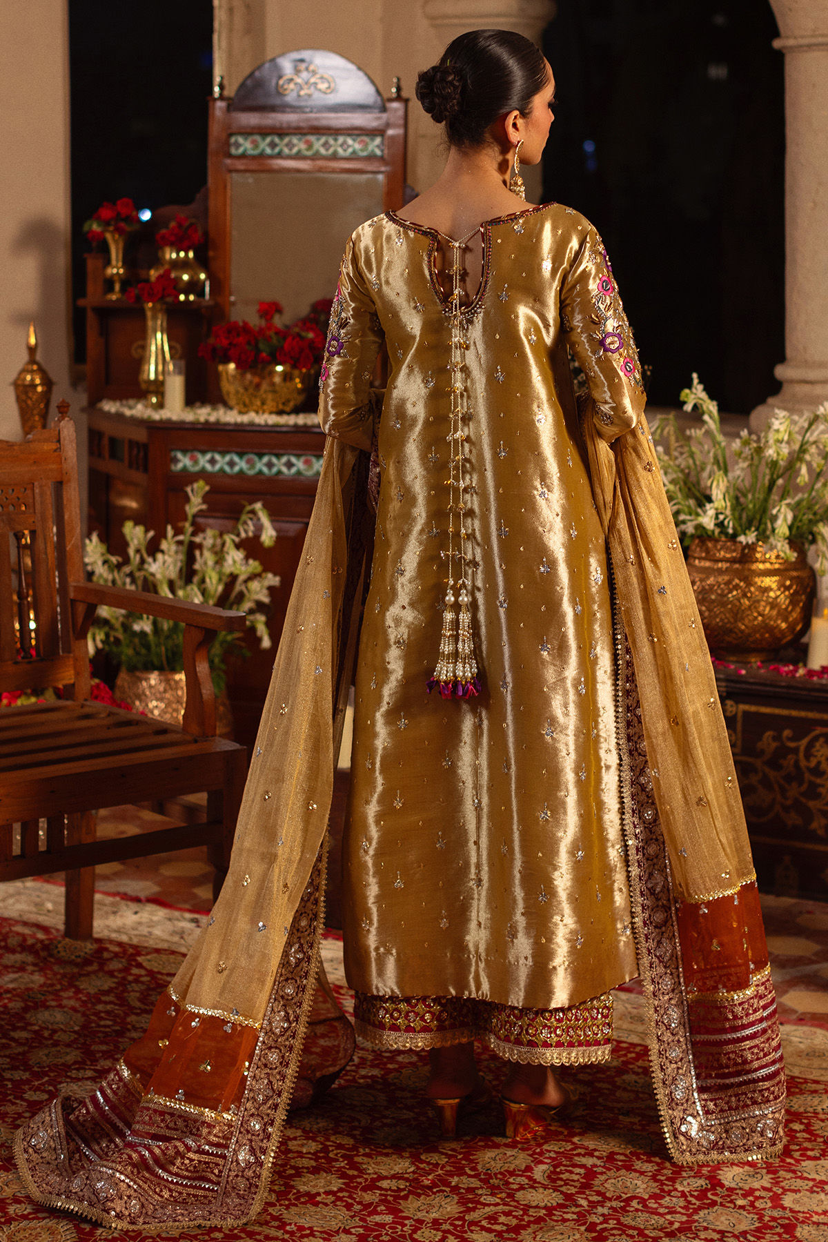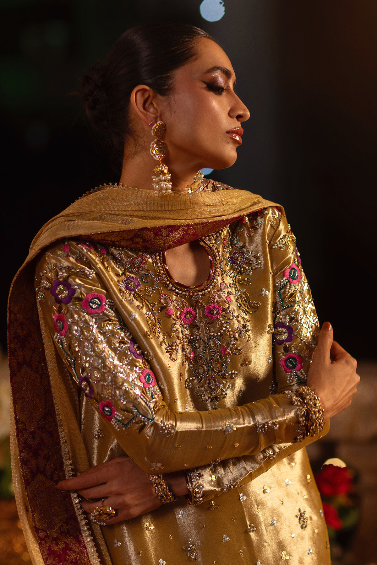 An exquisite A-line shirt in a captivating ochre gold lamé canvas, intricately adorned with traditional zardozi embellishments. The distinctive Hyderabadi neckline showcases antique and gold zardozi accents, complemented by elegant silk thread rosettes in shades of pink and lilac. The appliquéd hemline features detailed Kashmiri embroidery in a striking arrangement. This ensemble is paired with a two-legged izaar embellished with classic gota work. Completing the look is a color-blocked dupatta crafted from shimmering zari canvas, accentuated by aari borders and a delicate spray of light-catching sequins, finished with refined lace details.