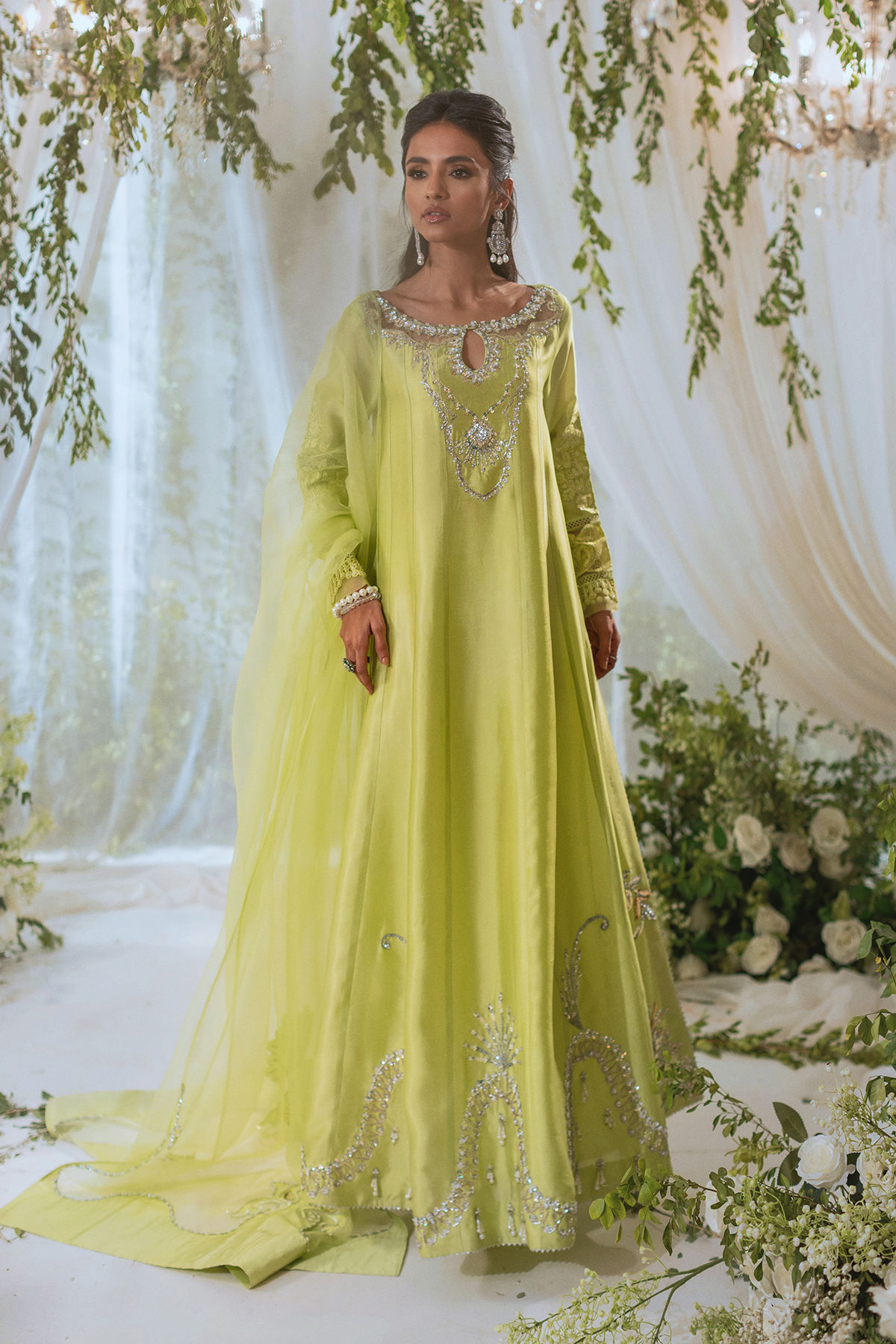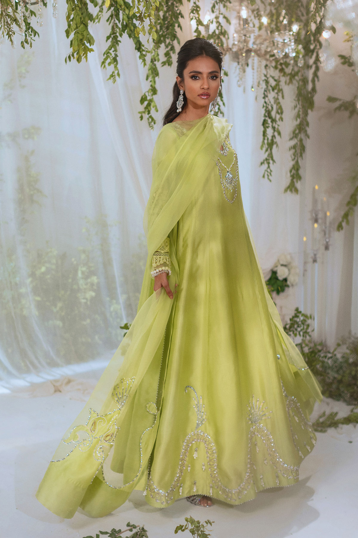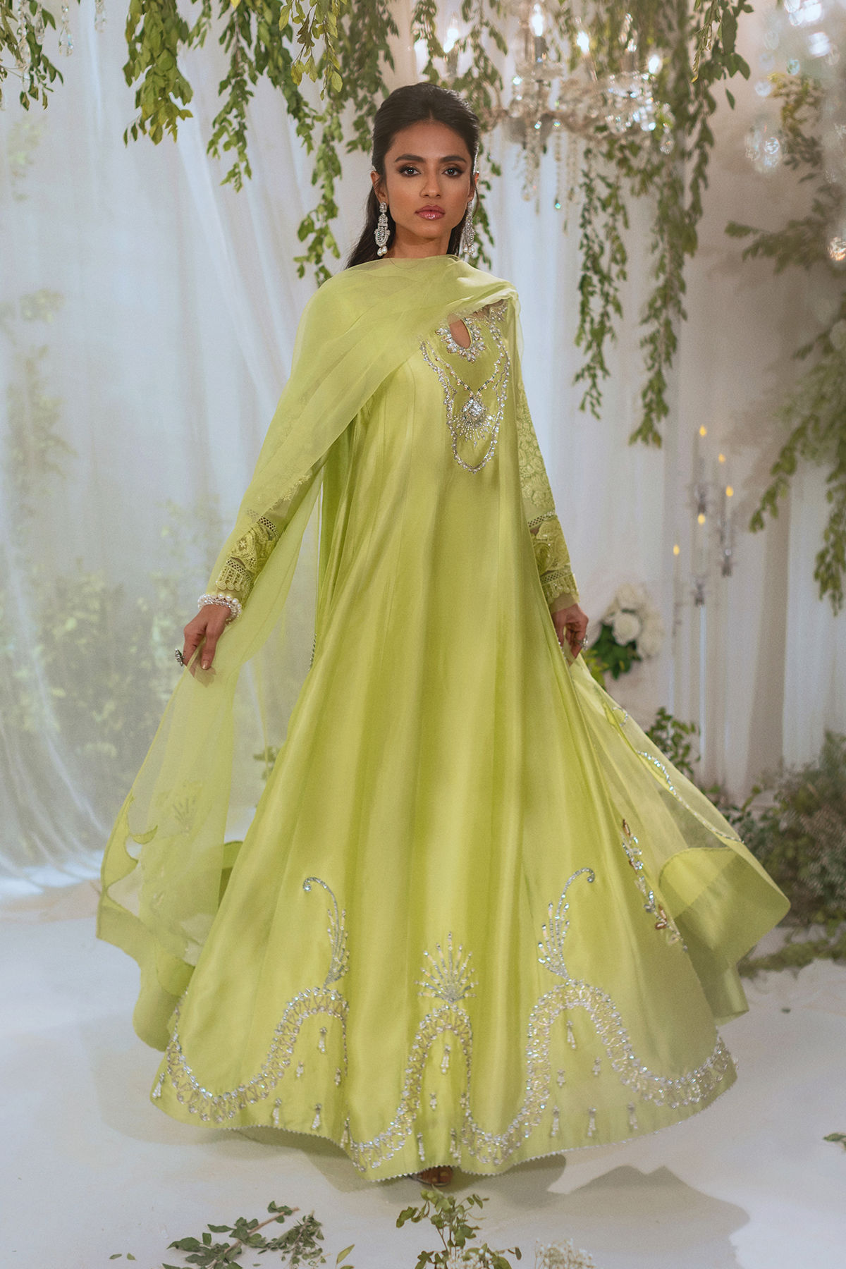 Floor length kalidar in gorgeous kiwi green featuring all silver zardozi details on neckline and hem. The kalidar is adorned with dangling pearls and light catching crystal details on hemline. The outfit is paired with organza dupatta featuring silk appliqué details adorned with handcrafted zardozi work. The outfit is paired with matching straight pants to complete the look.