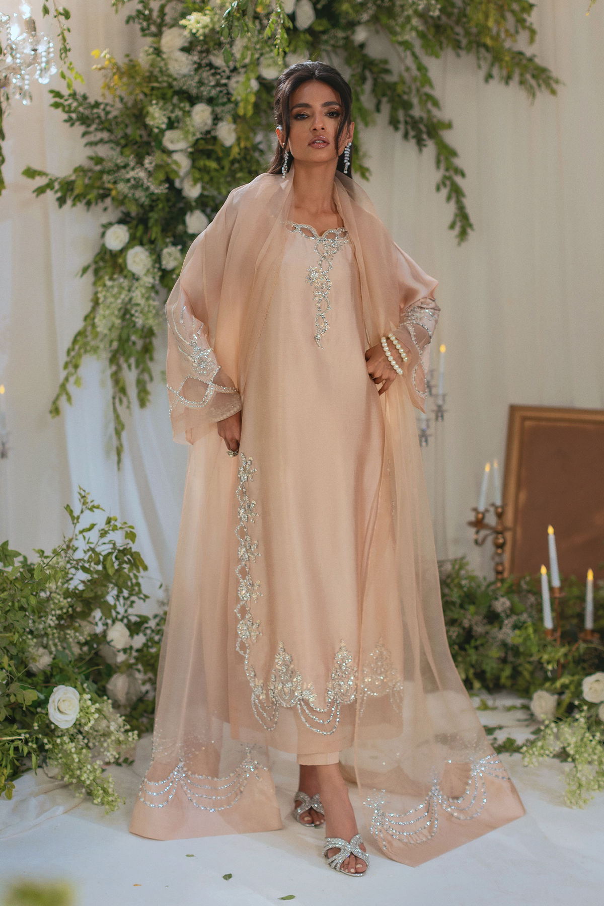 Long silhouette shirt on silk canvas in subtle nude gold features all silver embroidered details on neckline and side slits. The shirt is paired with matching raw silk pants and an organza dupatta featuring silk panels on each pallu further decorated with handcrafted embroidered details of sequins and pearls.