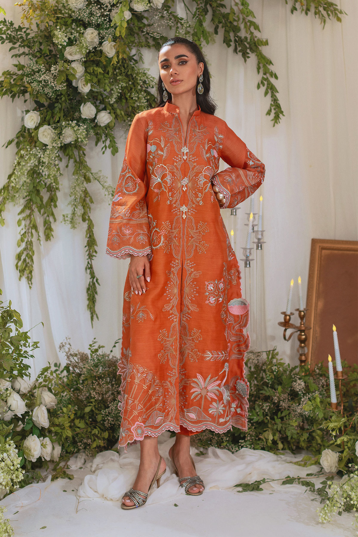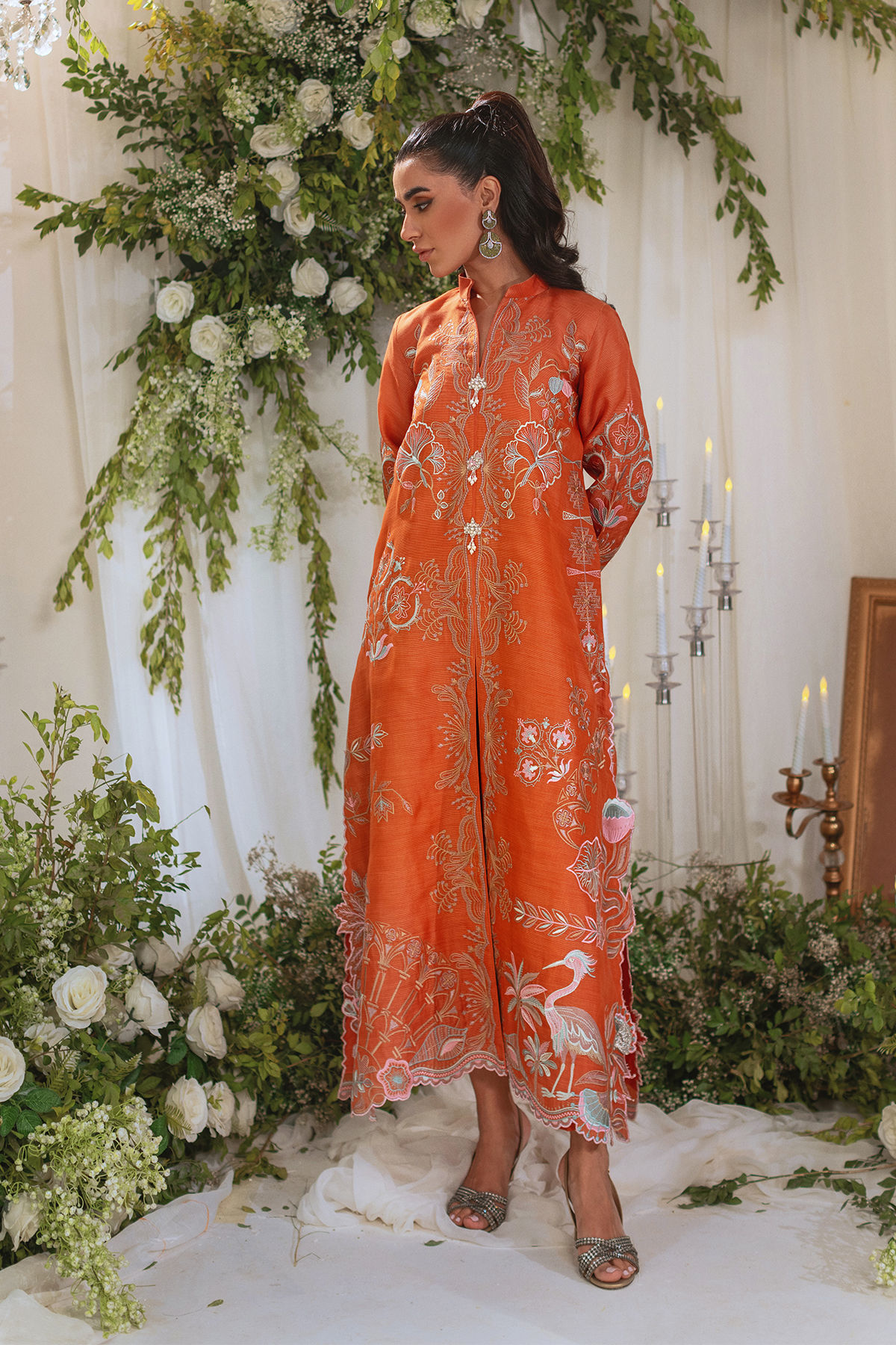 Long silhouette front open shirt in gorgeous rust shade on stripped organza canvas featuring floral and fauna details on centre front and back. The hemline is adorned with handcrafted zardozi 3d details in all silver. The side slits are enhanced with dangling resham and pearl tassels. The shirt comes with matching straight pants to complete the look.