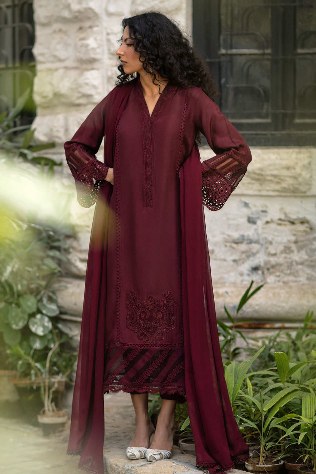 A long-silhouette shirt crafted in luxurious silk, presented in a rich oxblood hue. The design features delicate lace detailing along the neckline, while the centre panel is accentuated exclusively with refined embroidered motif, adding subtle artisanal interest. The hem is enhanced with elegant organza fabric manipulation, and the sleeves are finished with graceful Schiffli detailing. Presented as a complete three-piece ensemble, it is paired with coordinating bottoms and a chiffon dupatta, beautifully finished with lace accents to complete the look.