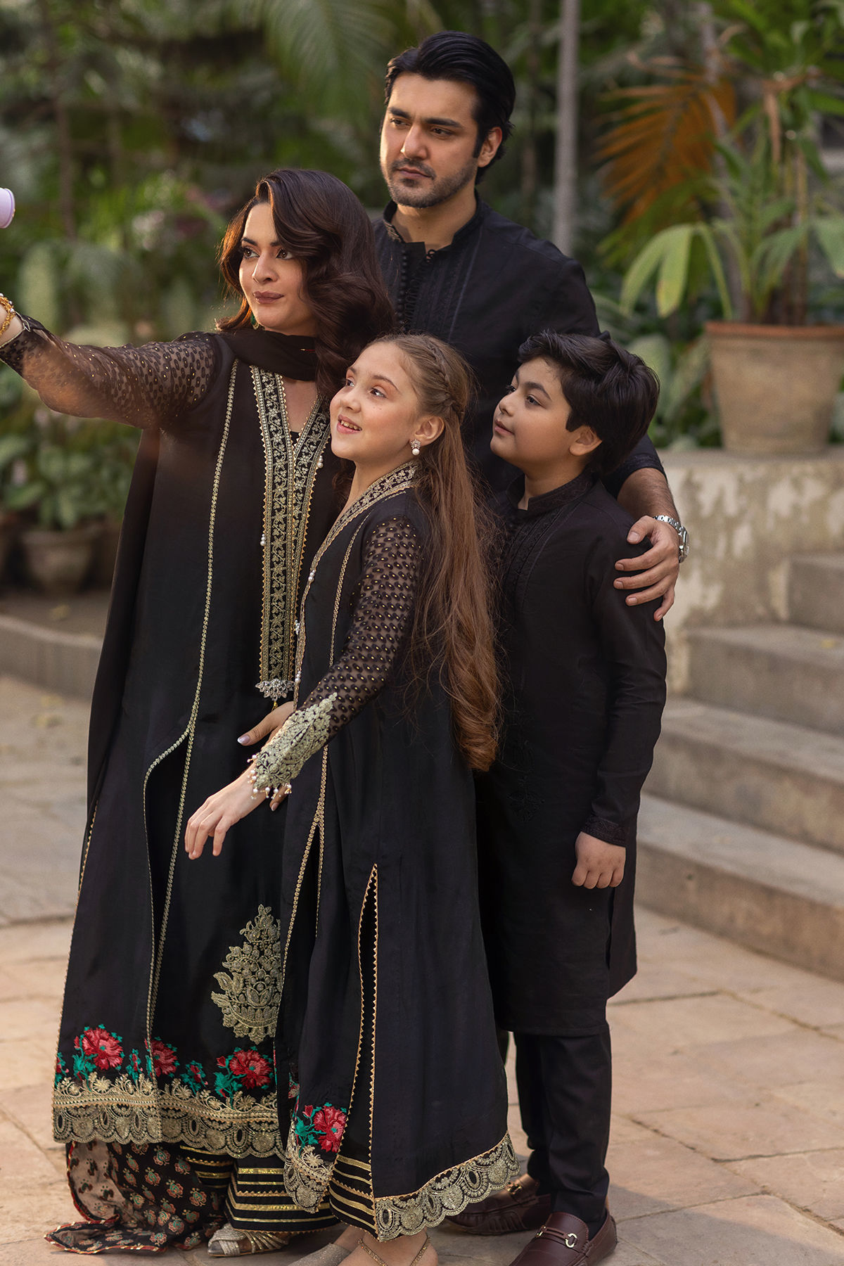 Cotton net kurta in a classic black hue, showcasing intricate self-embroidery on the neckline and sleeves. The neckline is gracefully accentuated with loop button details, and this kurta can be elegantly paired with black pants to create a striking ensemble that commands attention.