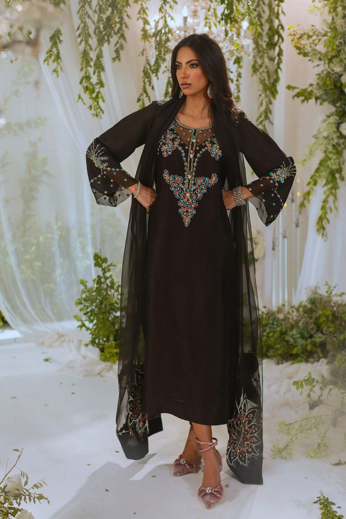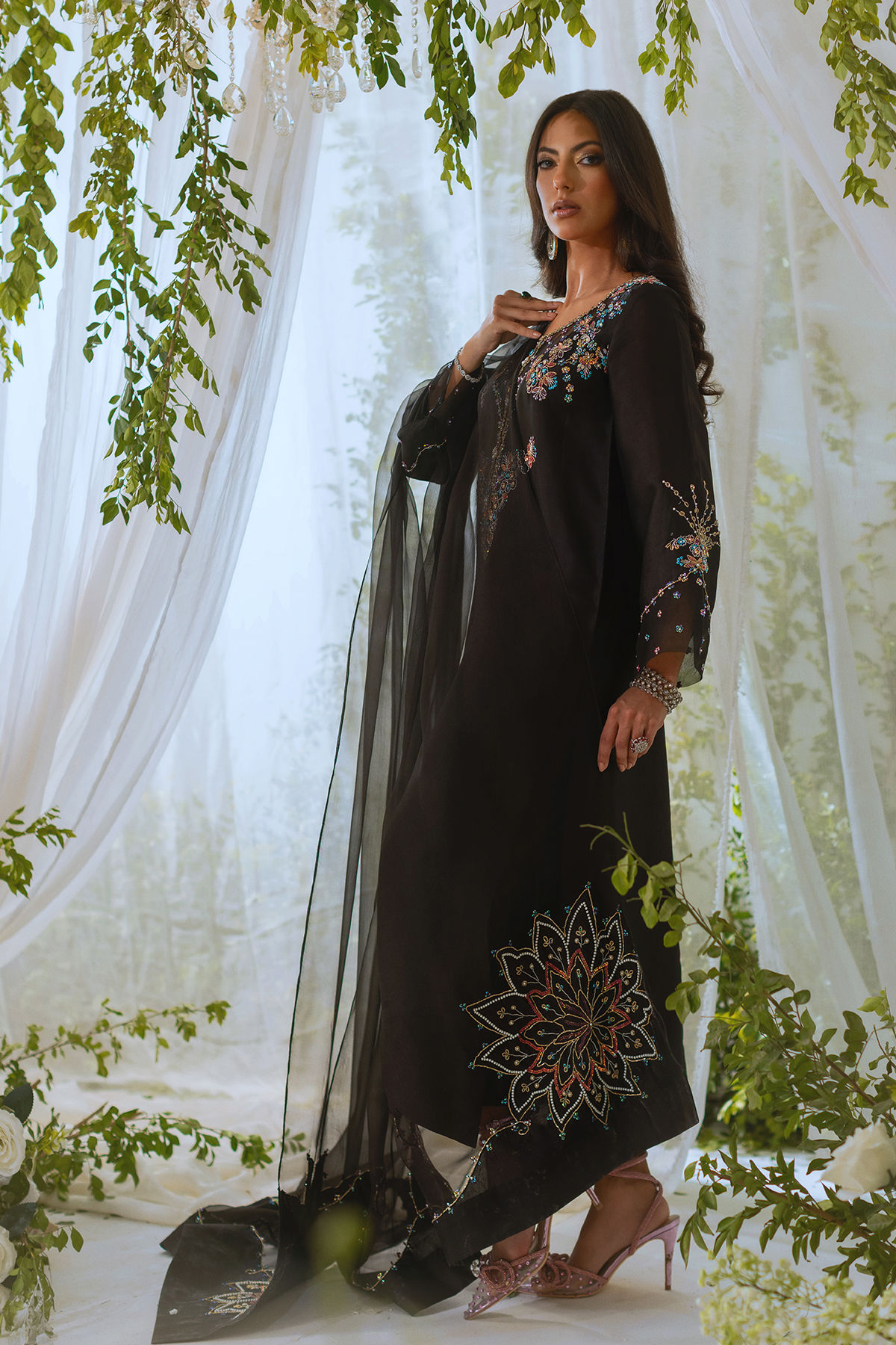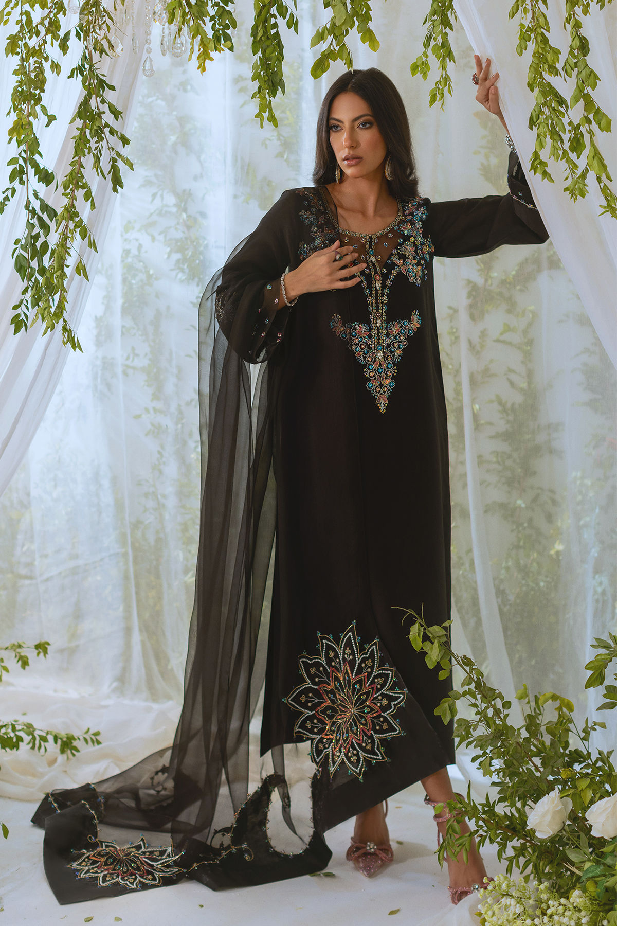 Long silhouette shirt on silk net in deepest shade of black featuring multicoloured sequins zardozi details on the neckline and sleeves. The outfit is paired with signature AA dupatta featuring silk appliqué detailed rosettes which are adorned with multicoloured light catching sequins and pearls details to create a festive look.