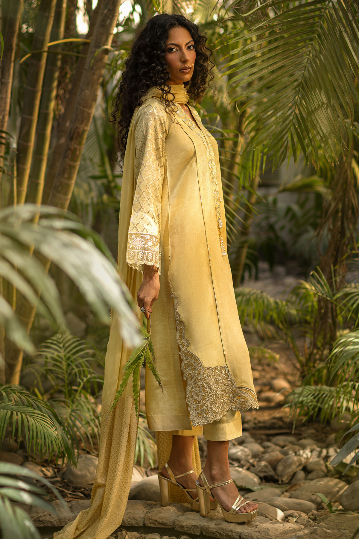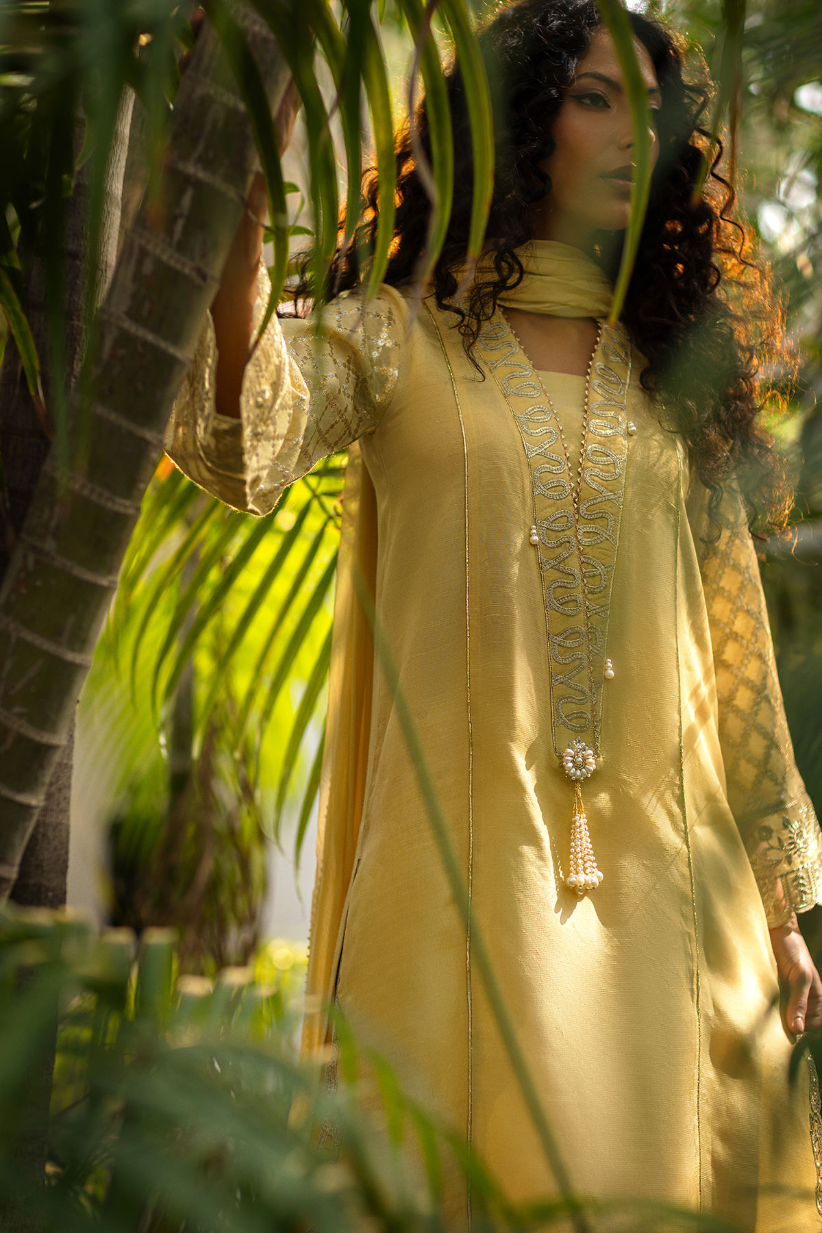 This elegant buttery yellow silk shirt radiates understated luxury. The hem is beautifully adorned with intricate zari appliqué embroidery, adding a rich artisanal finish. The sleeves are crafted from shimmering lurex fabric and detailed with a refined zari border, lending a subtle festive glow. The neckline is framed with a delicate zari border and further enhanced with exquisite handworked tassels for a statement finish. Completing the ensemble is a complimentary dupatta featuring timeless block print detailing, paired with matching complimentary pants—perfect for elevated festive and formal occasions.