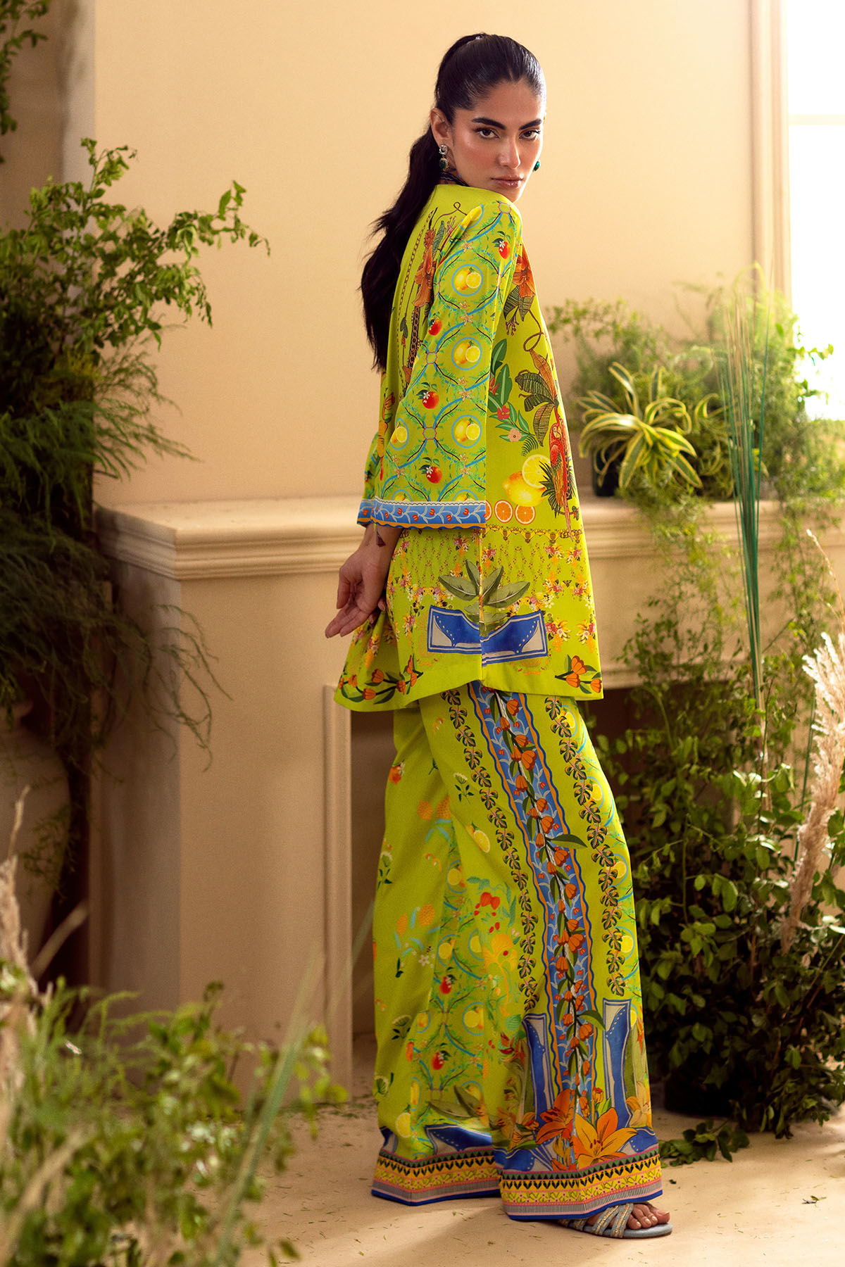 Co-ordinating set crafted from crepe silk, adorned with whimsical floral printed details. This ensemble includes a knee-length shirt characterized by a loose silhouette, embellished with floral and fauna printed accents. The shirt is elegantly paired with loose-fitting coordinating trousers.