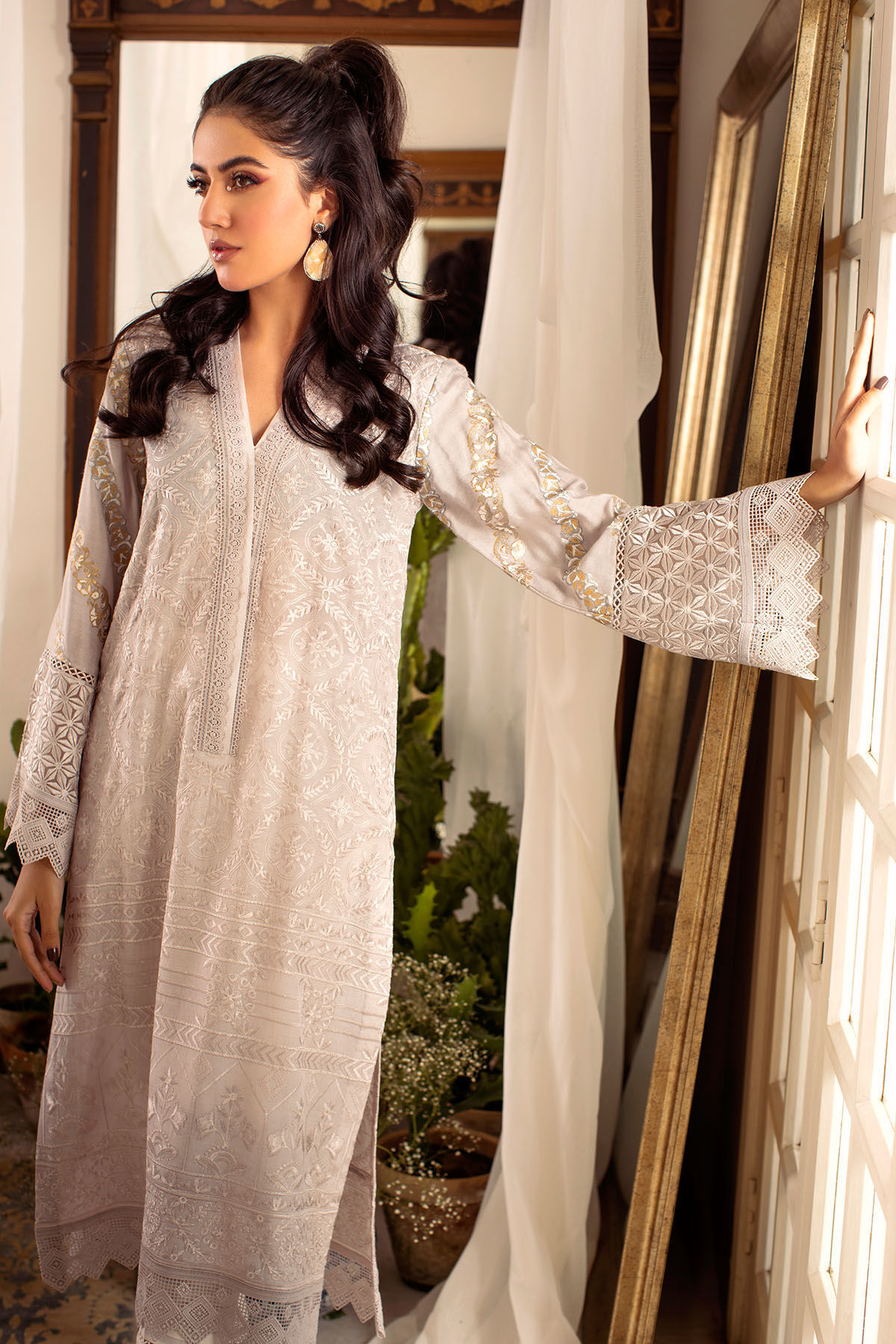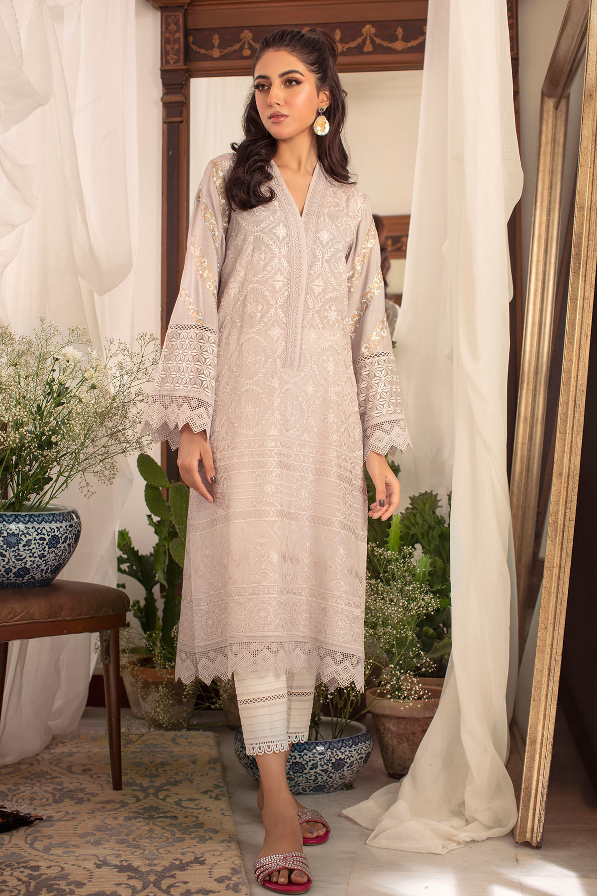Self-embroidered raw silk shirt in steel grey shade featuring hand block printed sleeves and lace details, the neckline is enhanced with lace details.