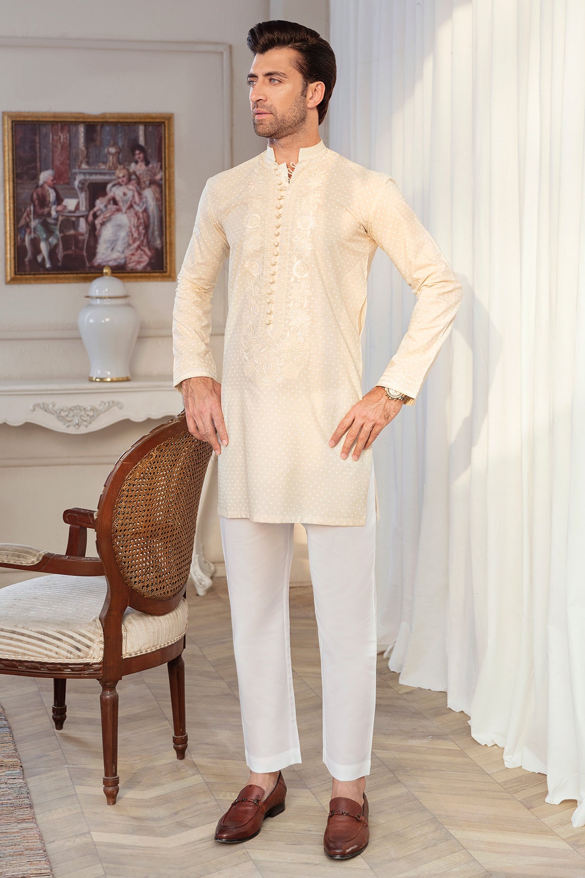 Short length pure cotton kurta on beige canvas with hand block printed details incorporated with subtle self-embroidered details of resham and anchor on neckline and sleeves. The neckline of the kurta is enhanced with loop buttons. The kurta is paired with cotton trousers.