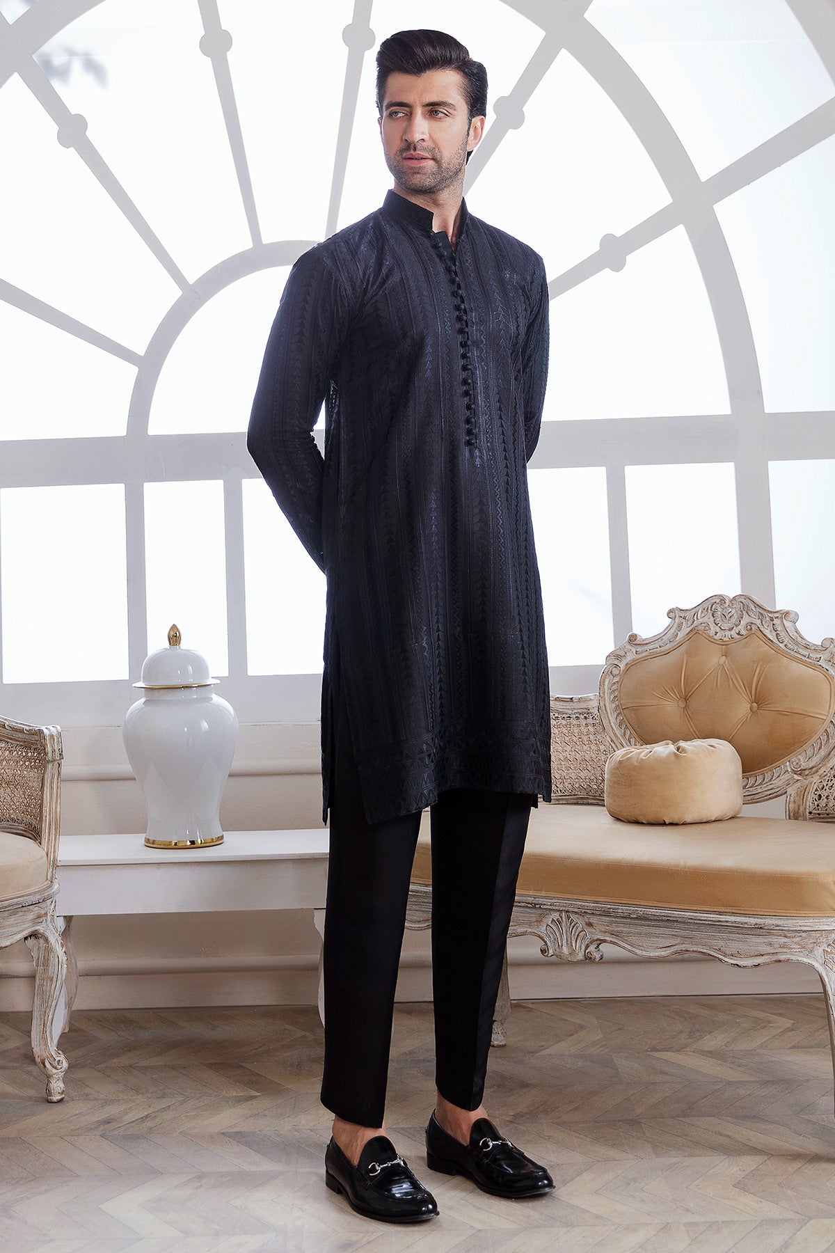 Short length raw silk kurta with subtle self-embroidered details on front and back. The neckline of the kurta is enhanced with loop buttons. The kurta is paired with pure raw silk trousers.