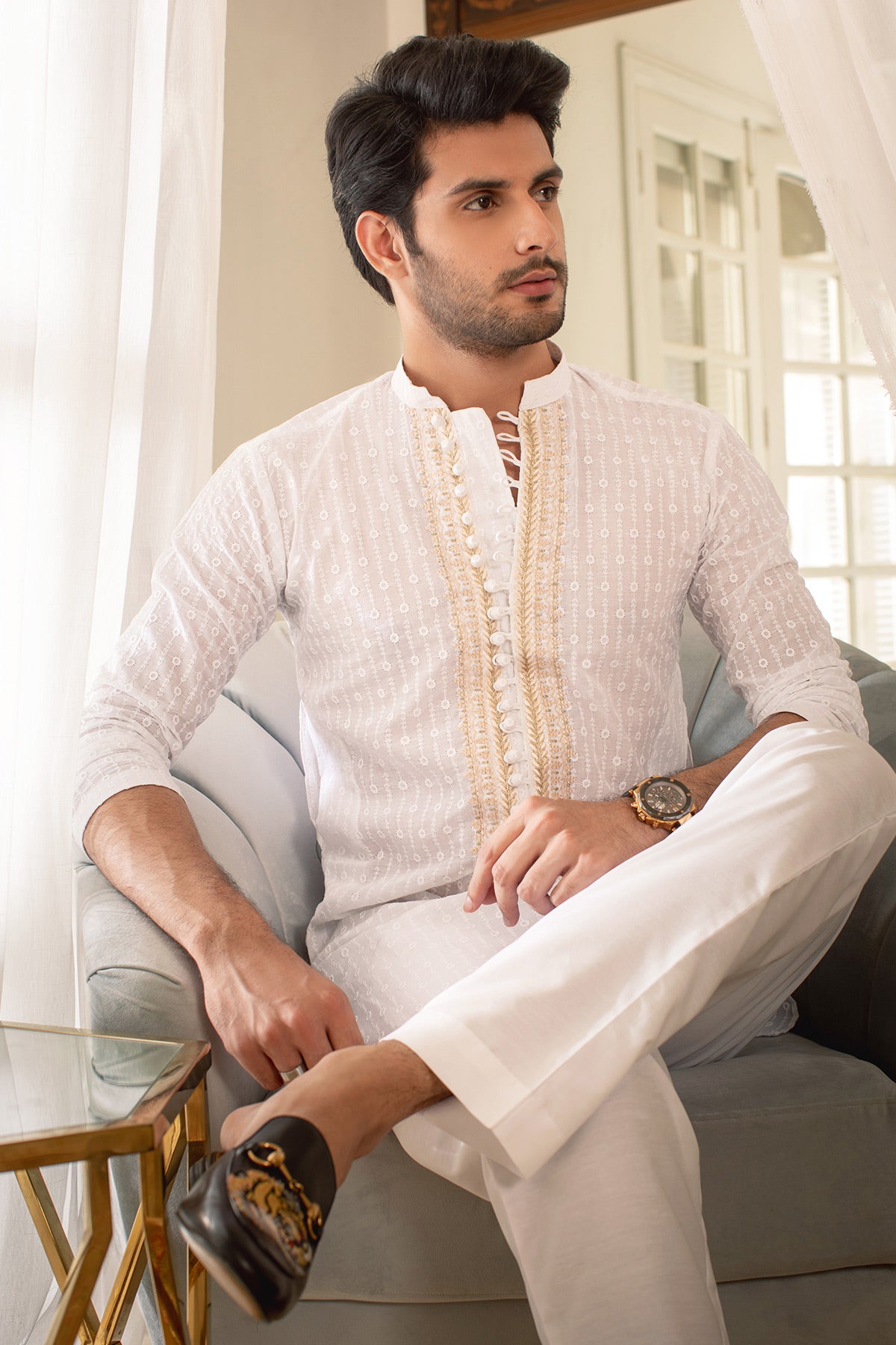 White cotton chikan kurta with intricate silk embroidery details on neckline sewn to perfection with loop buttons neckline.