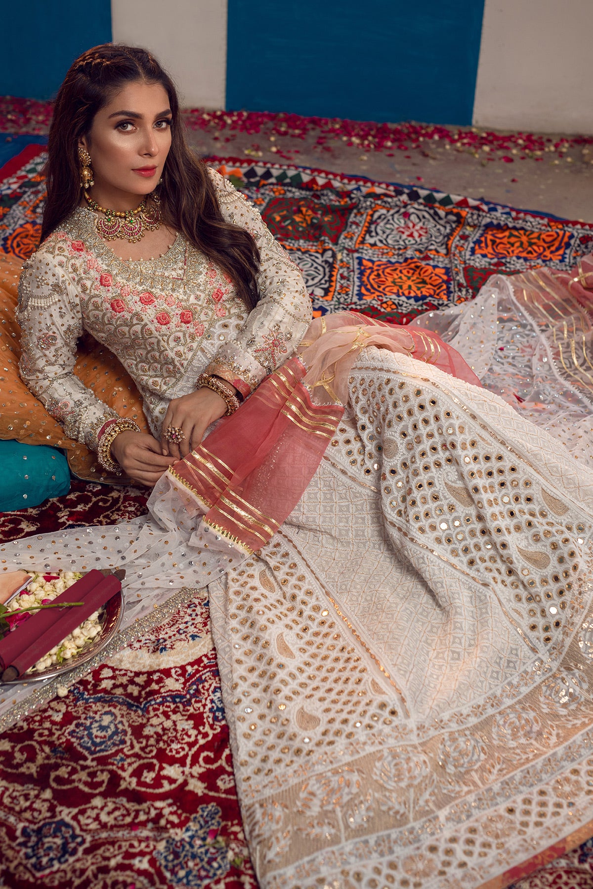 Pristine white chikankari kalidar with light catching mirror details merged together with silk thread rosettes on bodice which are adorned with kora, dabka and rhinestone. The kalidar is paired with color blocked dupatta with gota finishing's and layered over a two legged dhaka.