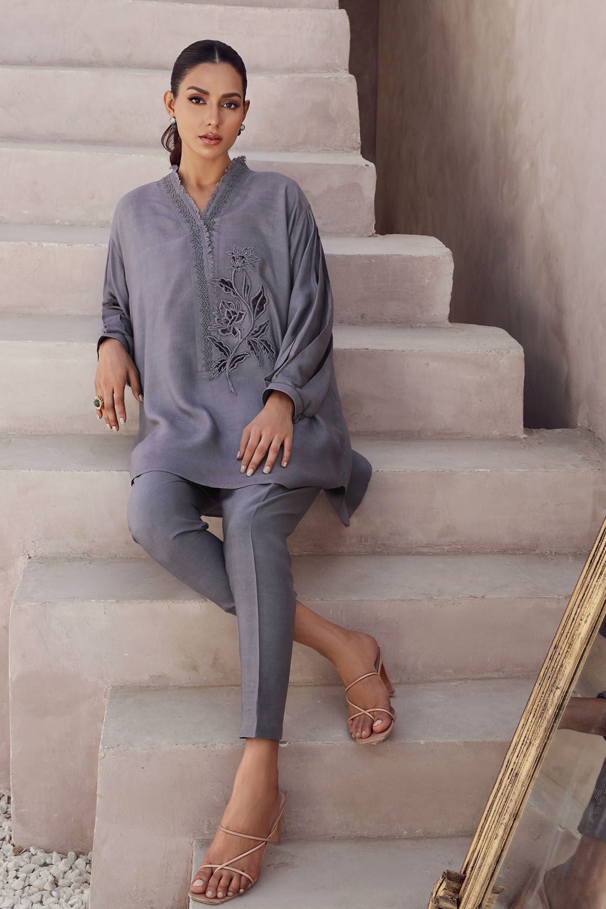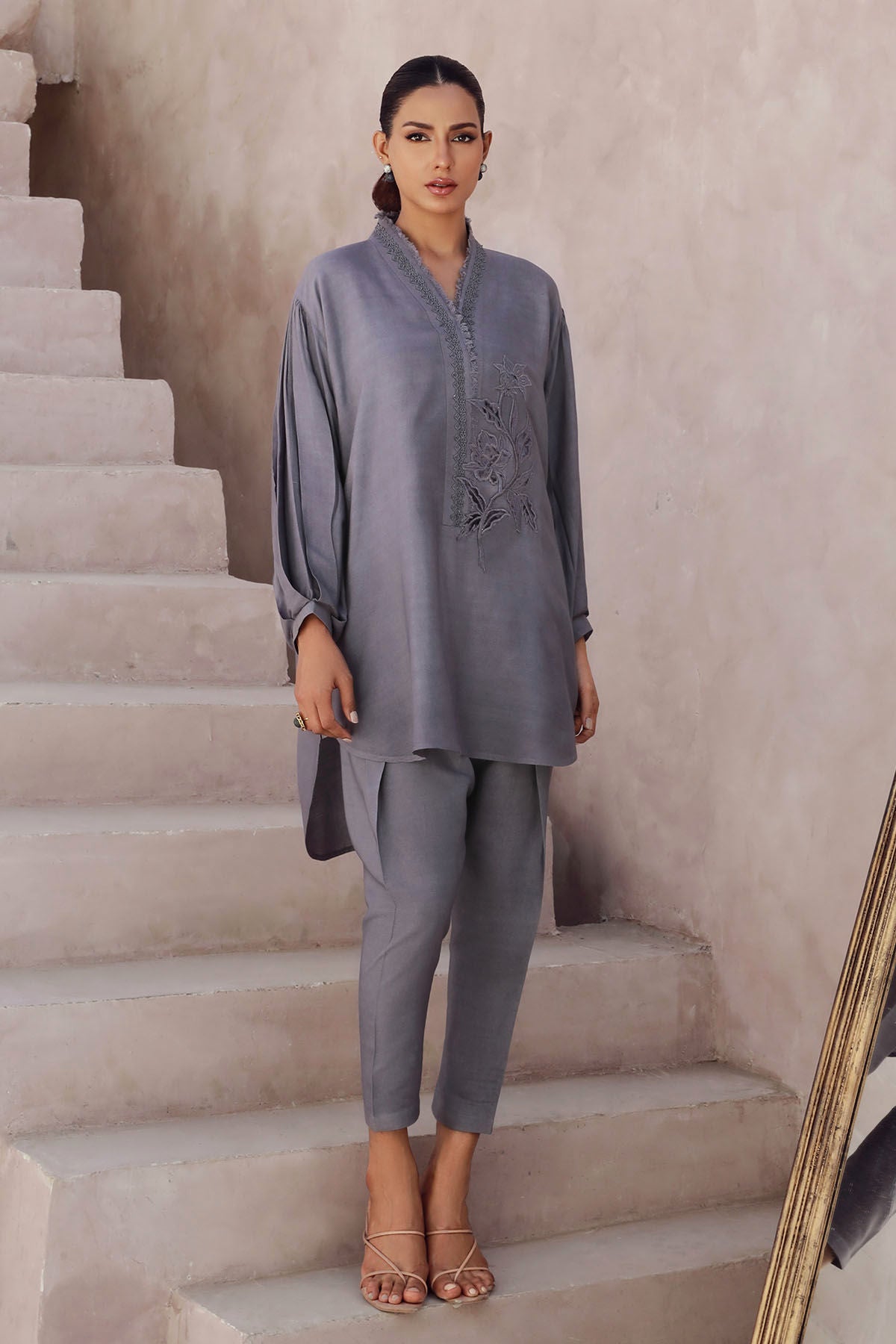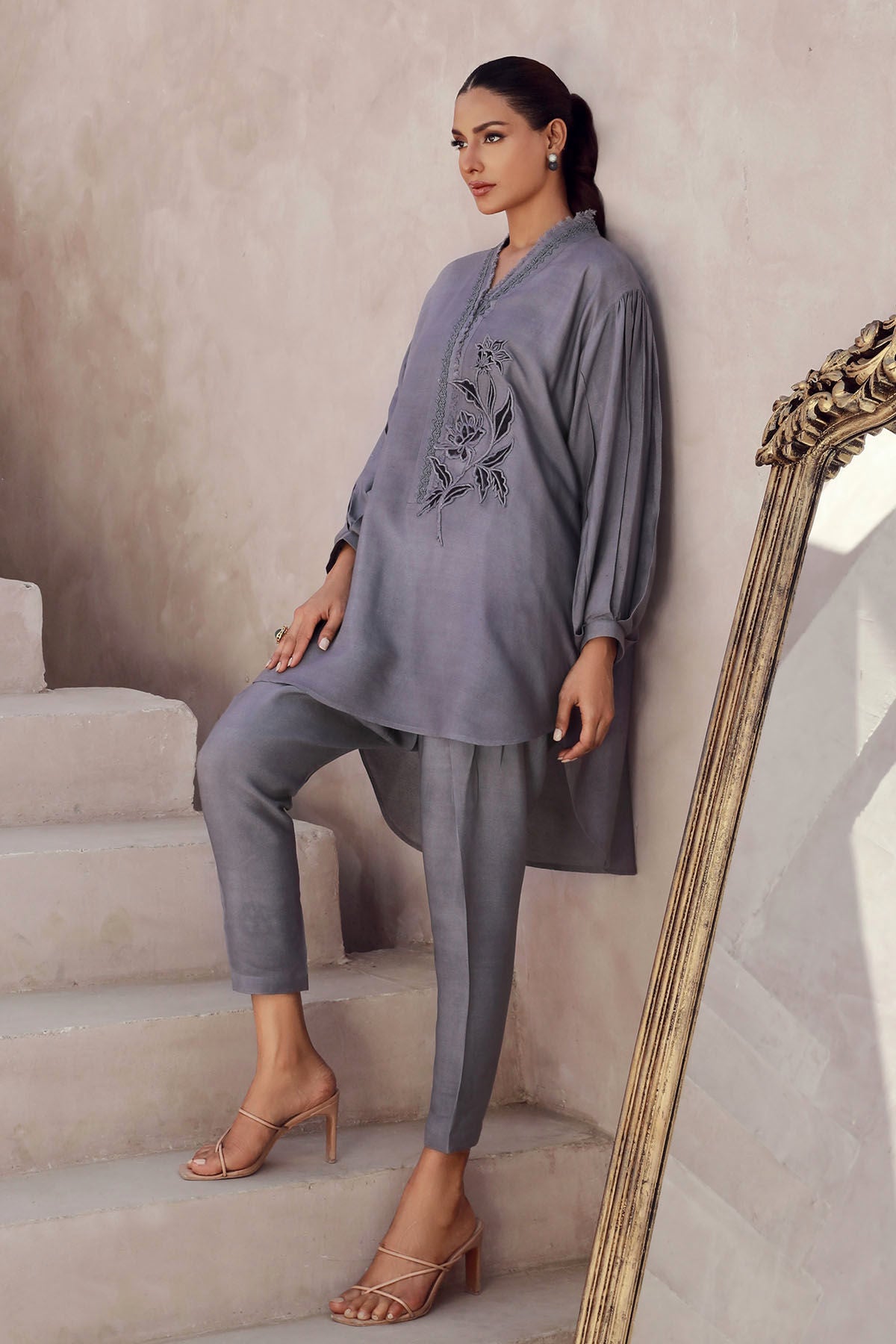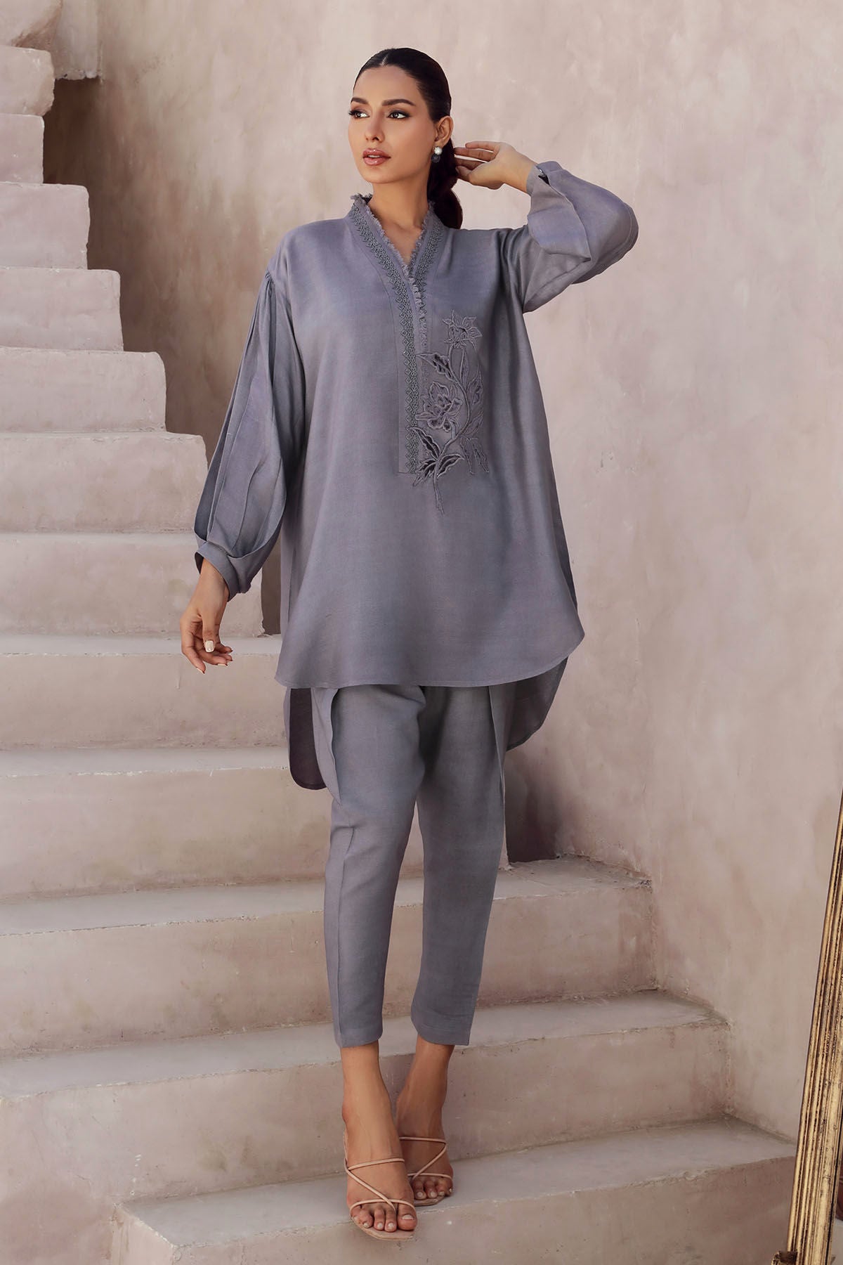 High low co-ord in oversized silhouette featuring velvet appliqué motifs on center front, the neckline is enhanced with lace and fringe details. The top is paired with matching shalwar for a sleeker look.