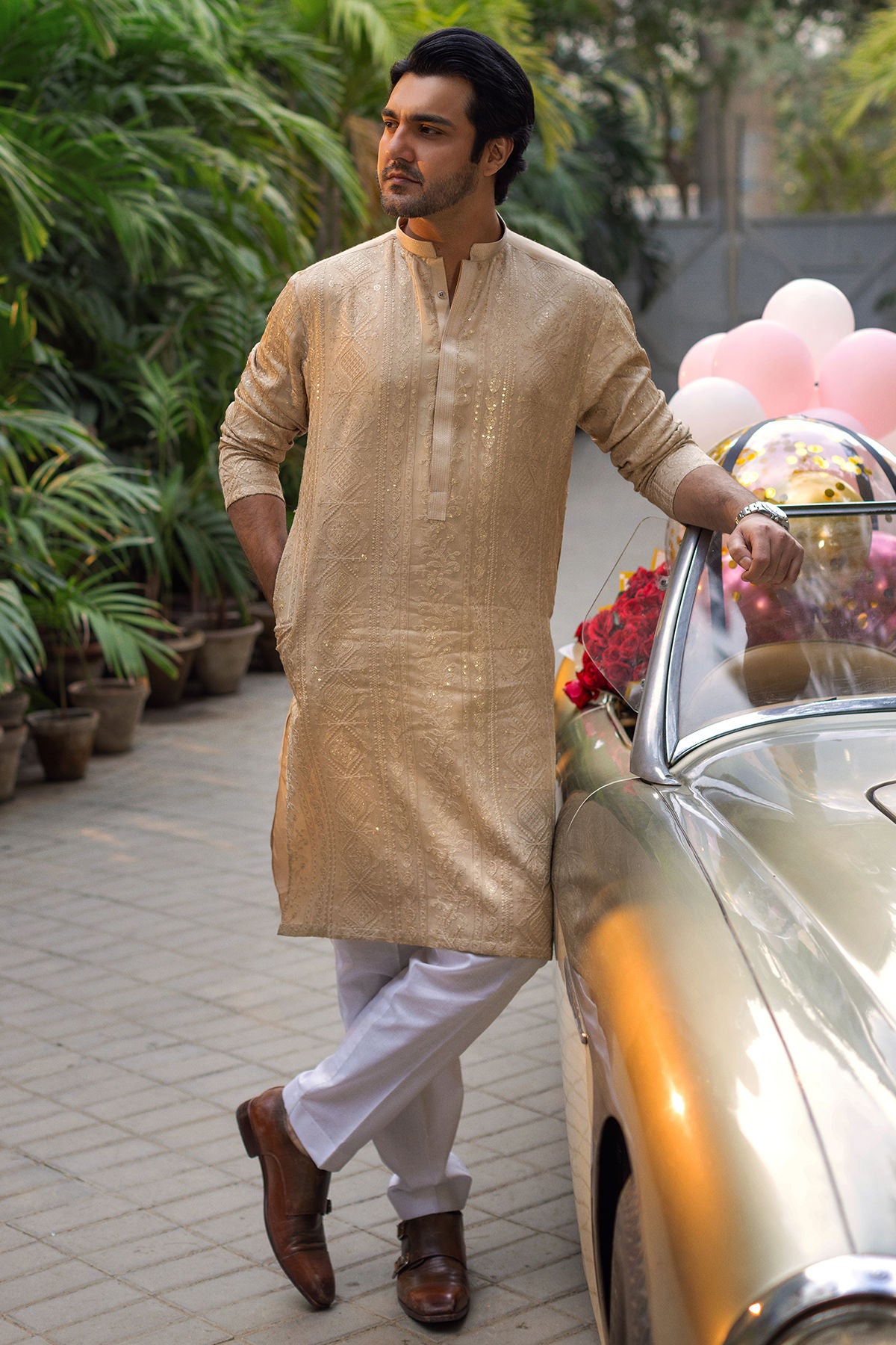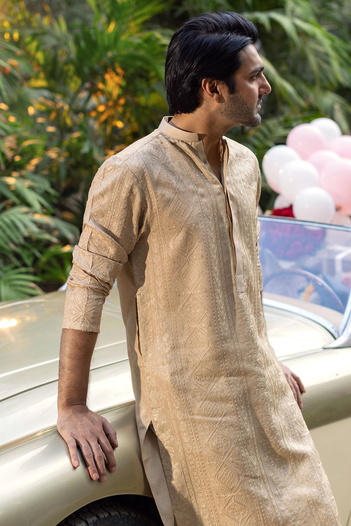 Embroidered raw silk kurta in subtle sand shade featuring self-pattern details adorned with light catching sequins.The neckline is accentuated with a placket, and the kurta can be elegantly paired with straight white pants to complete the ensemble.