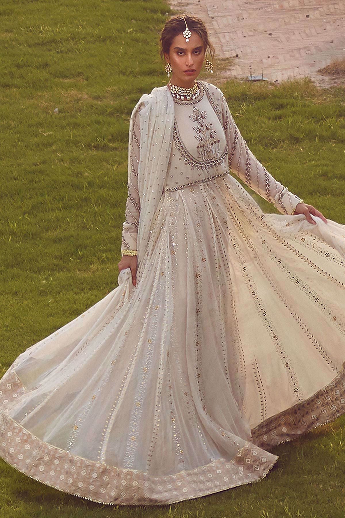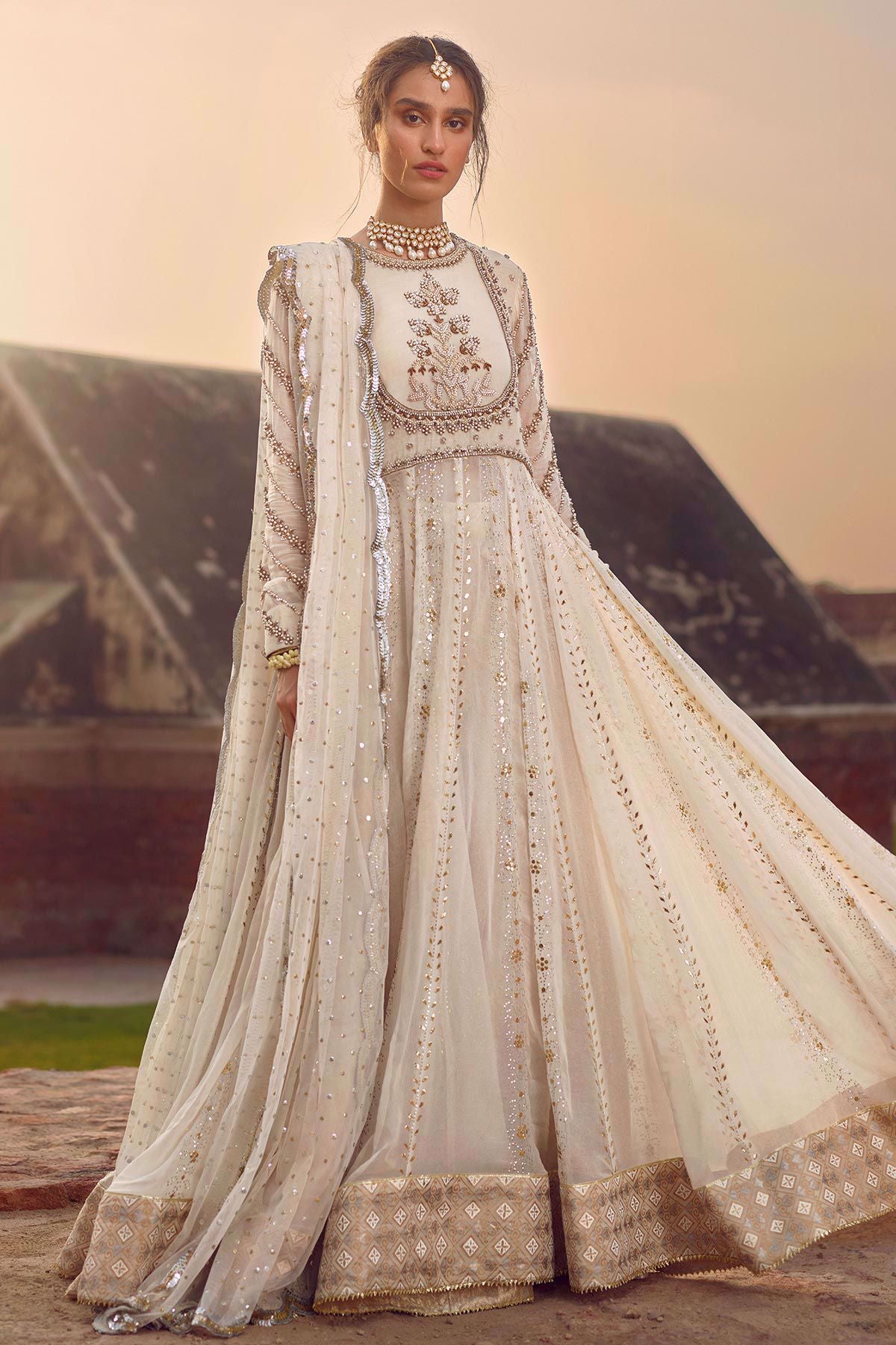 Stunning ivory chiffon pishwas featuring pearls, antique dabka and lots of shimmering crystals to take your breath away. The bodice of the pishwas is heavily embellished with kora, dabka and light catching crystals. The chiffon flare of the pishwas is further enhanced with different kaamdani patterns which is finished with hand block printed hemline. The outfit comes with net scallops’ dupatta.