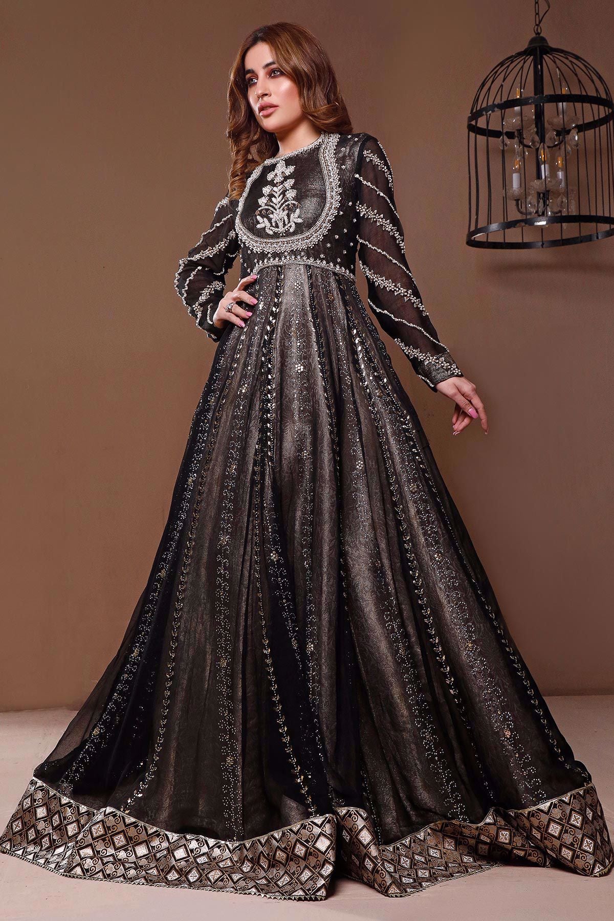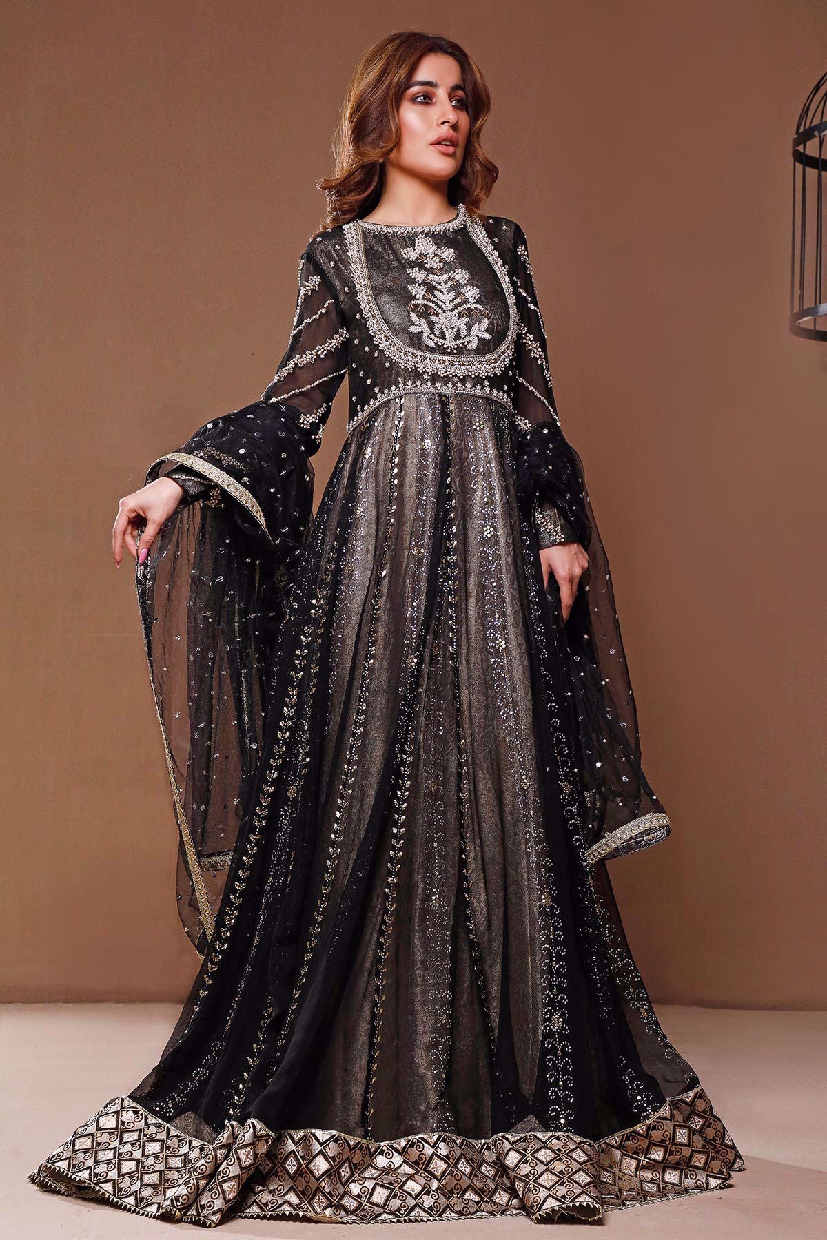 Stunning black chiffon pishwas featuring pearls, antique dabka and lots of shimmering crystals to take your breath away. The bodice of the pishwas is heavily embellished with kora, dabka and light catching crystals. The chiffon flare of the pishwas is further enhanced with different kaamdani patterns which is finished with hand block printed hemline. The outfit comes with net scallops’ dupatta.