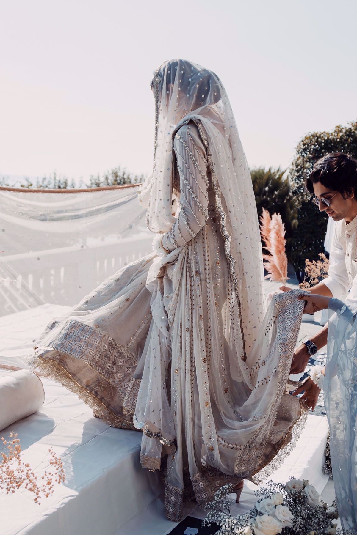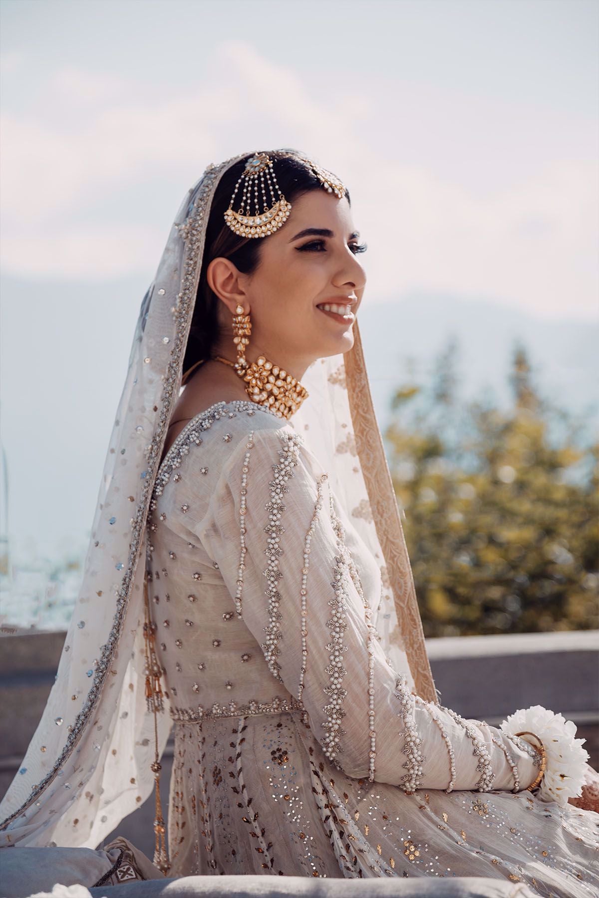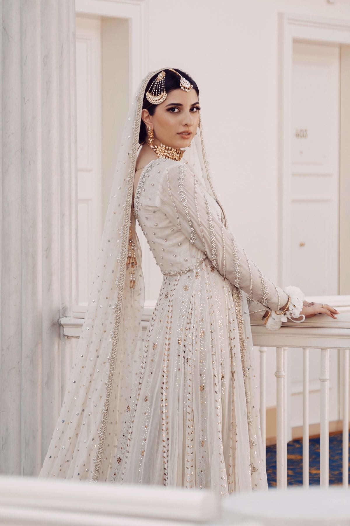 Stunning ivory chiffon peshwas featuring pearls, antique dabka and lots of shimmering crystals to take your breath away. The bodice of the peshwas is heavily embellished with kora, dabka and light catching crystals. The chiffon flare of the peshwas is further enhanced with different kaamdani patterns which is finished with hand block printed hemline. Complete the look with our signature Dhaka and Net scallops’ dupatta; adorned with our heirloom embroideries, exquisite craftsmanship, and attention to detail.
