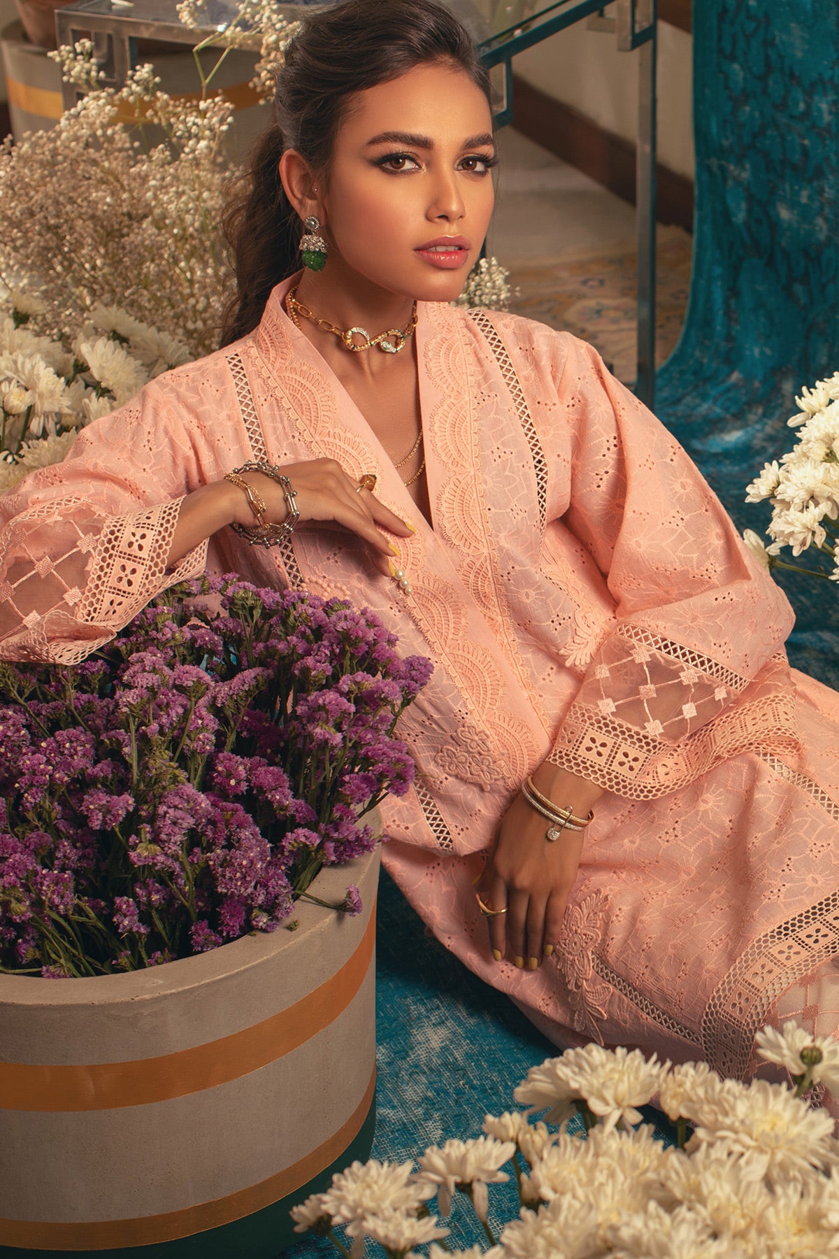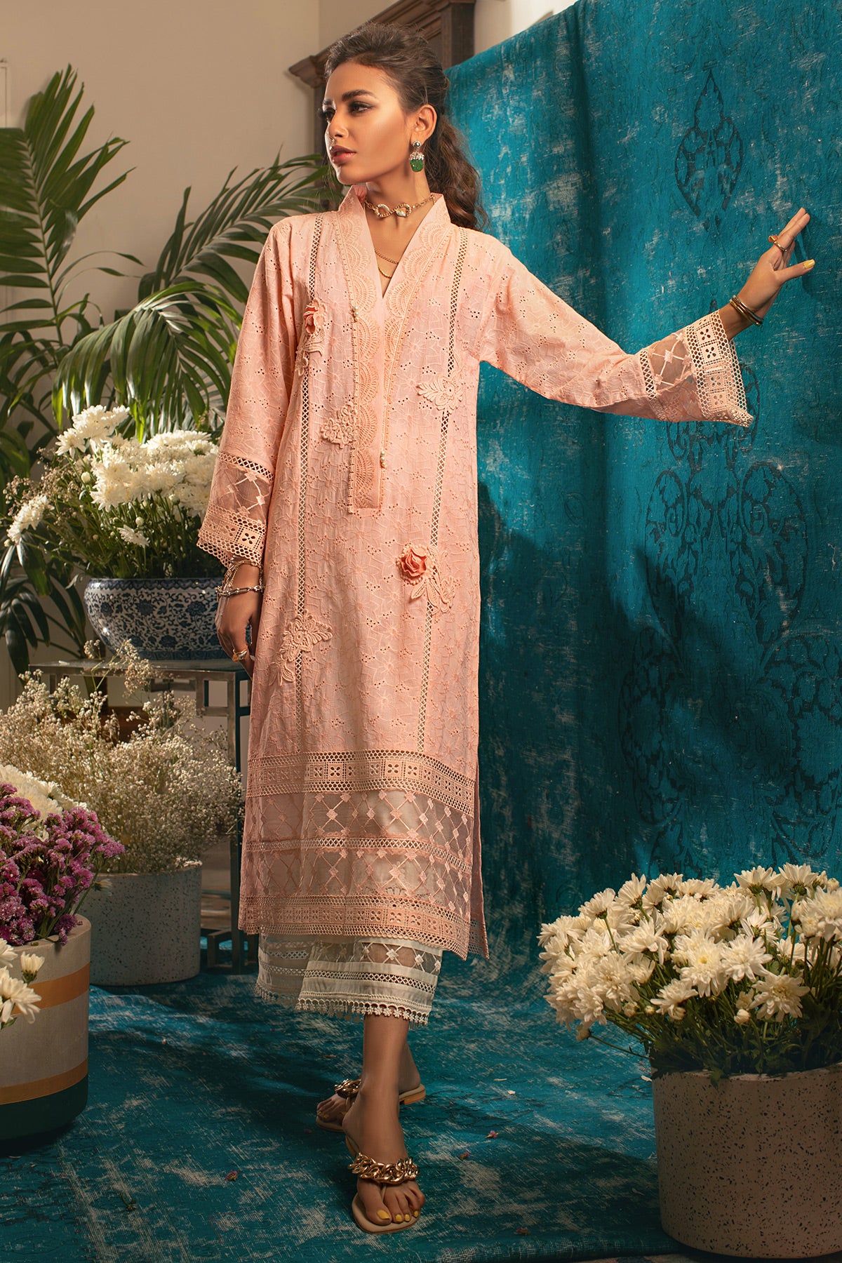 Straight silhouette chikan shirt in cool shade of peach featuring crochet laces, organza panels and Pearl embellishments on neckline. The center front of the shirt is adorned with applique details.