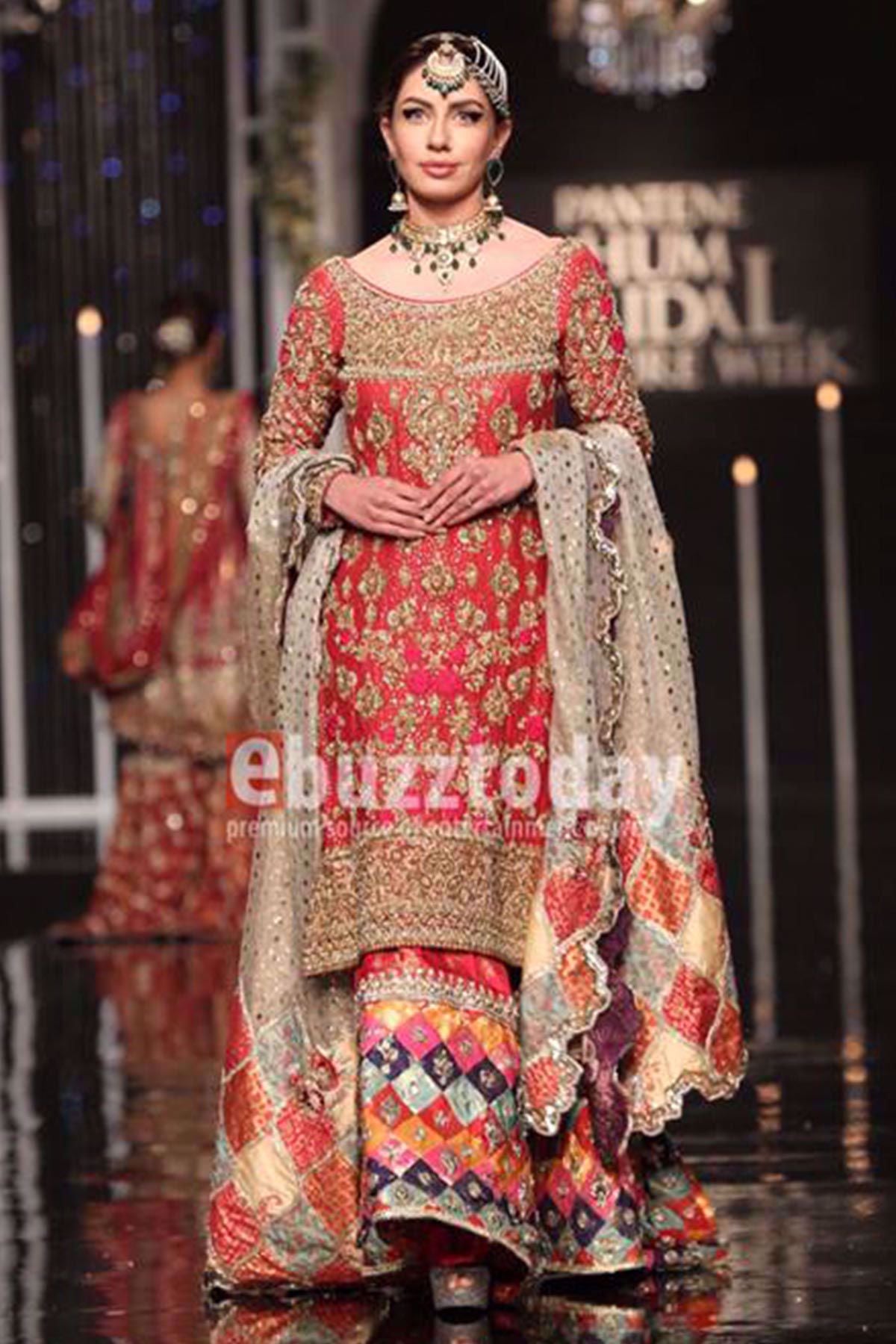 Crimson A line straight with antique gold embroidery with kaamdani details featuring old school hand embroidered details with silk thread resham rosettes. The shirt is paired with chatta patti dhaka pajama with antique and gold handwork border and botis all over. Shimmer net dupatta with scallop’s border and sequins incorporated with chatta patti and silk thread rosettes make this ensemble head turning