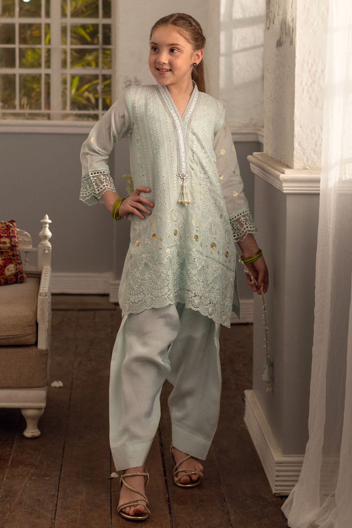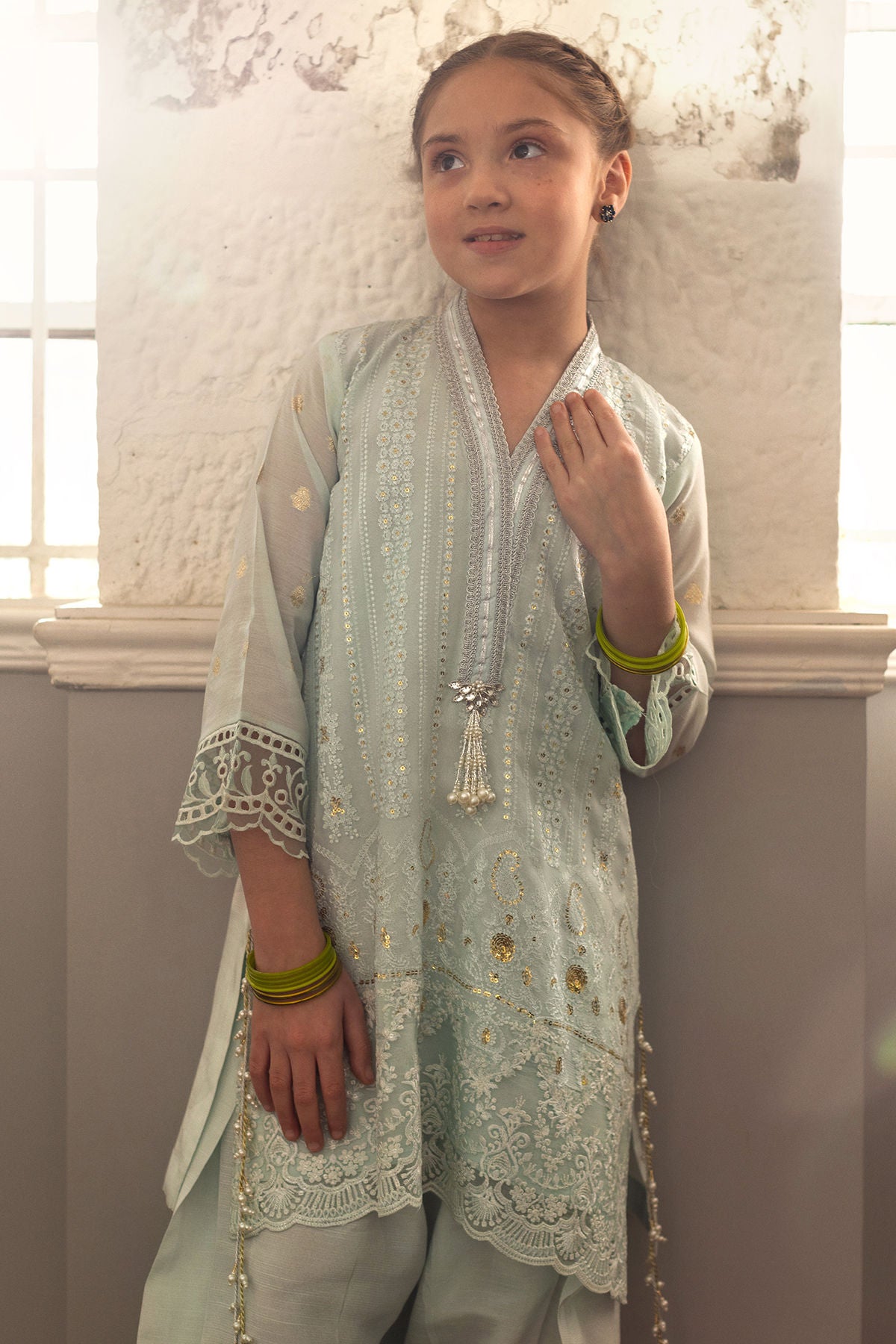 A knee-length shirt in a serene shade of ice blue, crafted from delicate chikankari fabric and subtly embellished with sequins for a soft shimmer. The neckline is elegantly finished with gota manipulation and meticulously handcrafted embellishments. Paired with a classic raw silk shalwar, the ensemble is completed with a solid chiffon dupatta featuring hand block–printed details, enhanced with refined gota finishing. Handcrafted dangling tassels, intricately adorned with pearls and beads, accent the side slits, adding an artisanal touch.