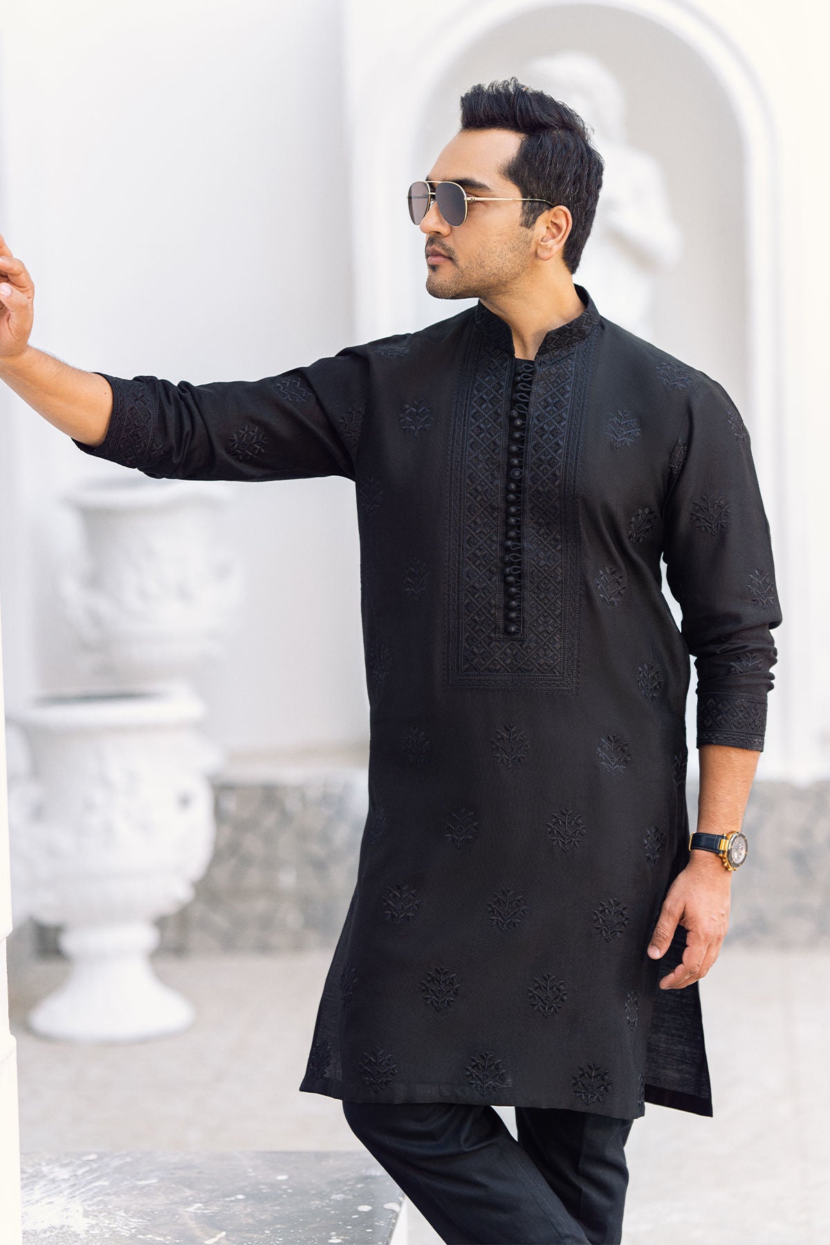 Pristine black kurta featuring self-embroidered details on the neckline. The neckline of the kurta is adorned with loops and handcrafted buttons. The kurta can be paired with straight cotton pants.