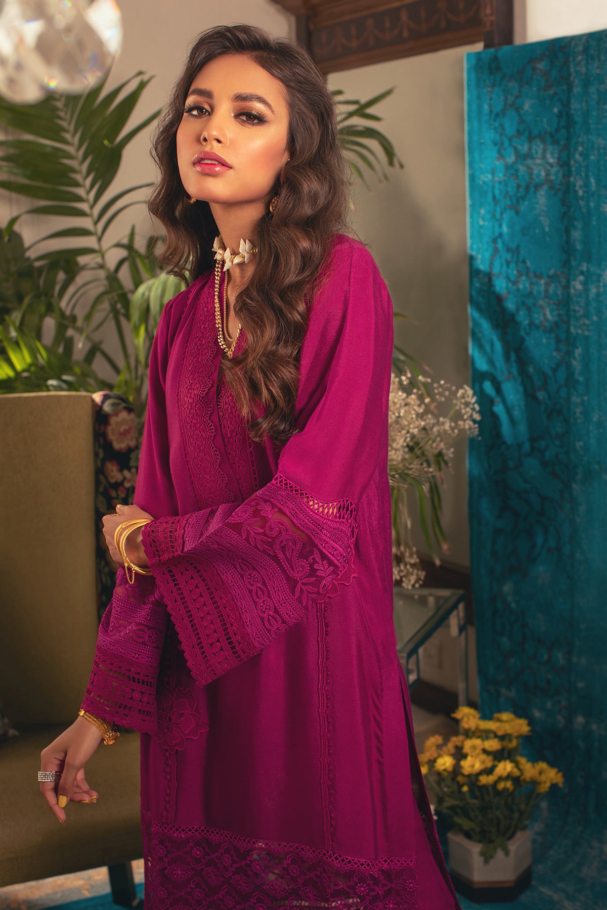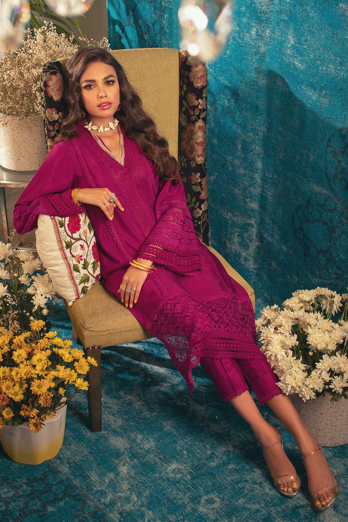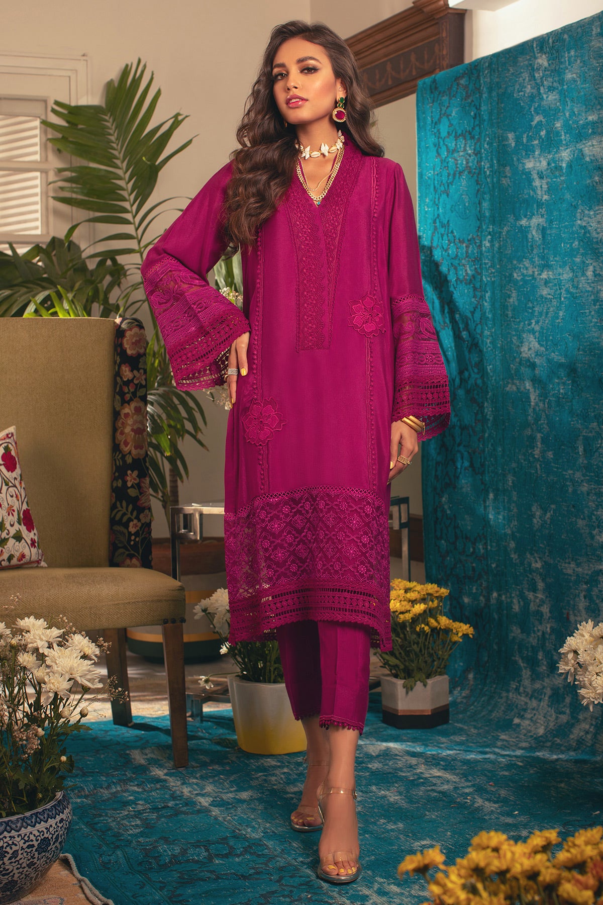 Pure cotton net shirt in head turning deep burgundy pink color featuring matching crochet laces and embroidered organza panel on the hemline. The shirt is further adorned with embroidered applique rosettes on center front. The shirt is paired with matching pants.