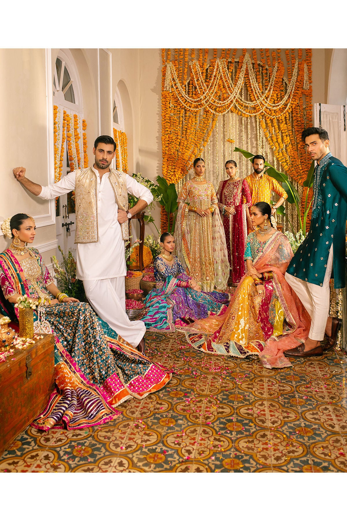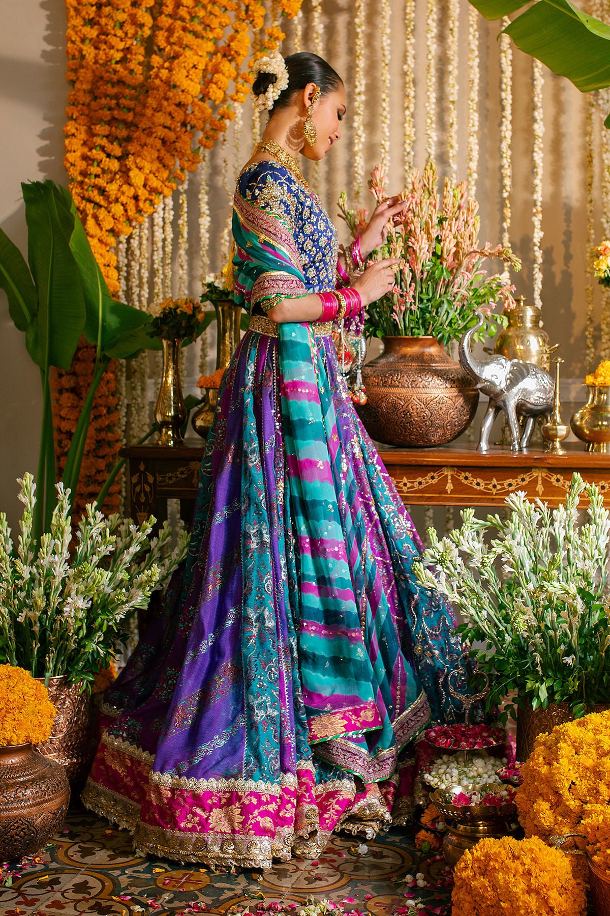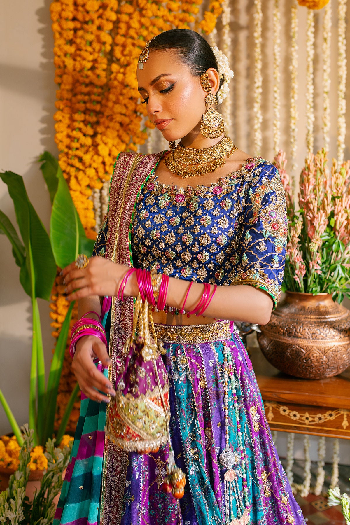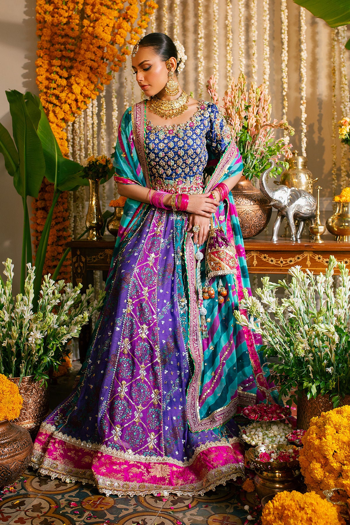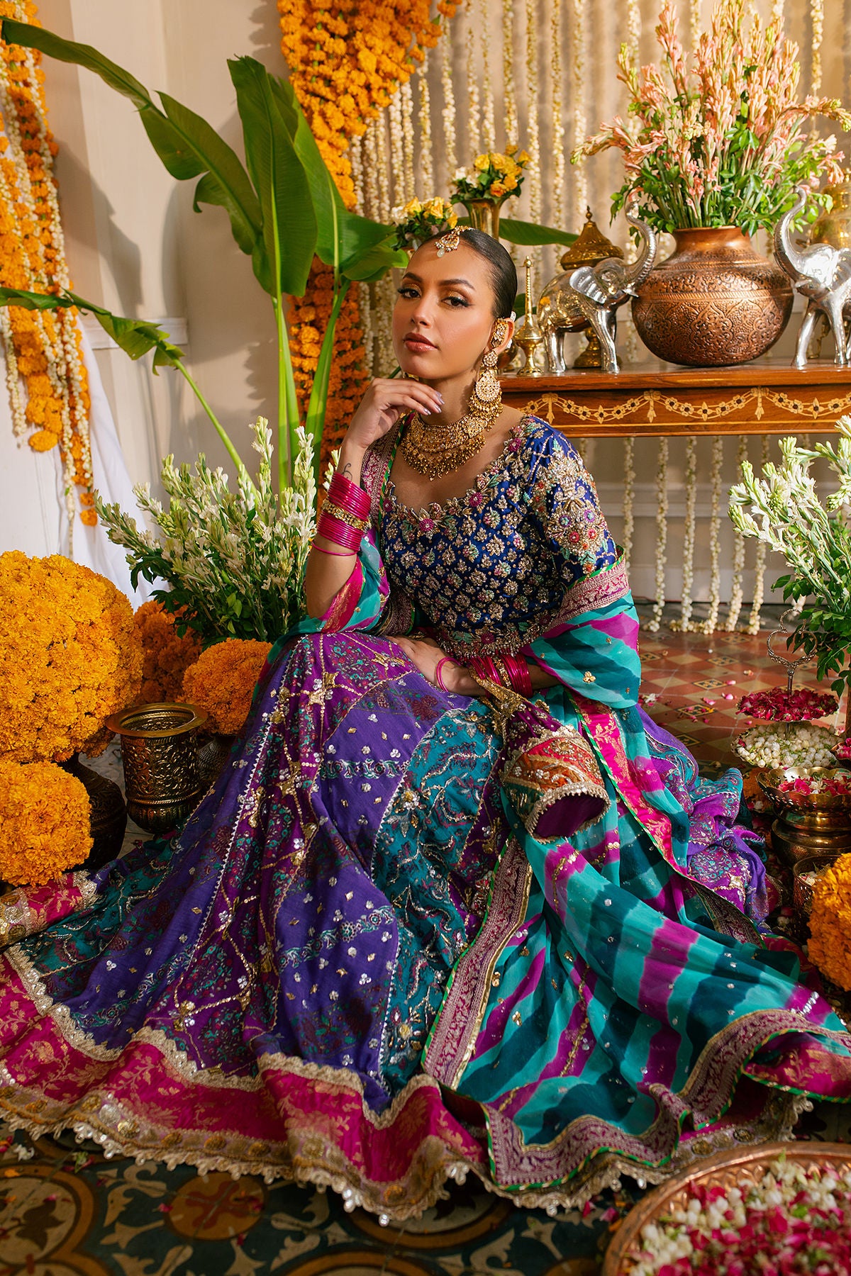 A multicolored lehnga in shades of violet, fuchsias and emerald scattered with gota and light catching crystals and sequins paired with indigo blue zardozi choli and a tye and dye dupatta.