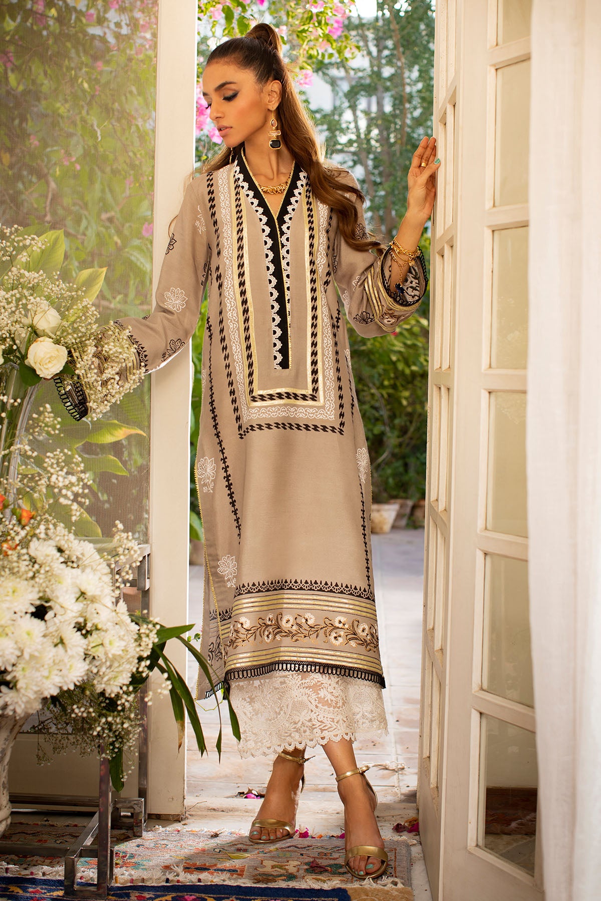 Long silhouette cotton net shirt on grey canvas featuring hand block printed details in gold, silver and whites which are further enhanced with crochet laces and gota details.