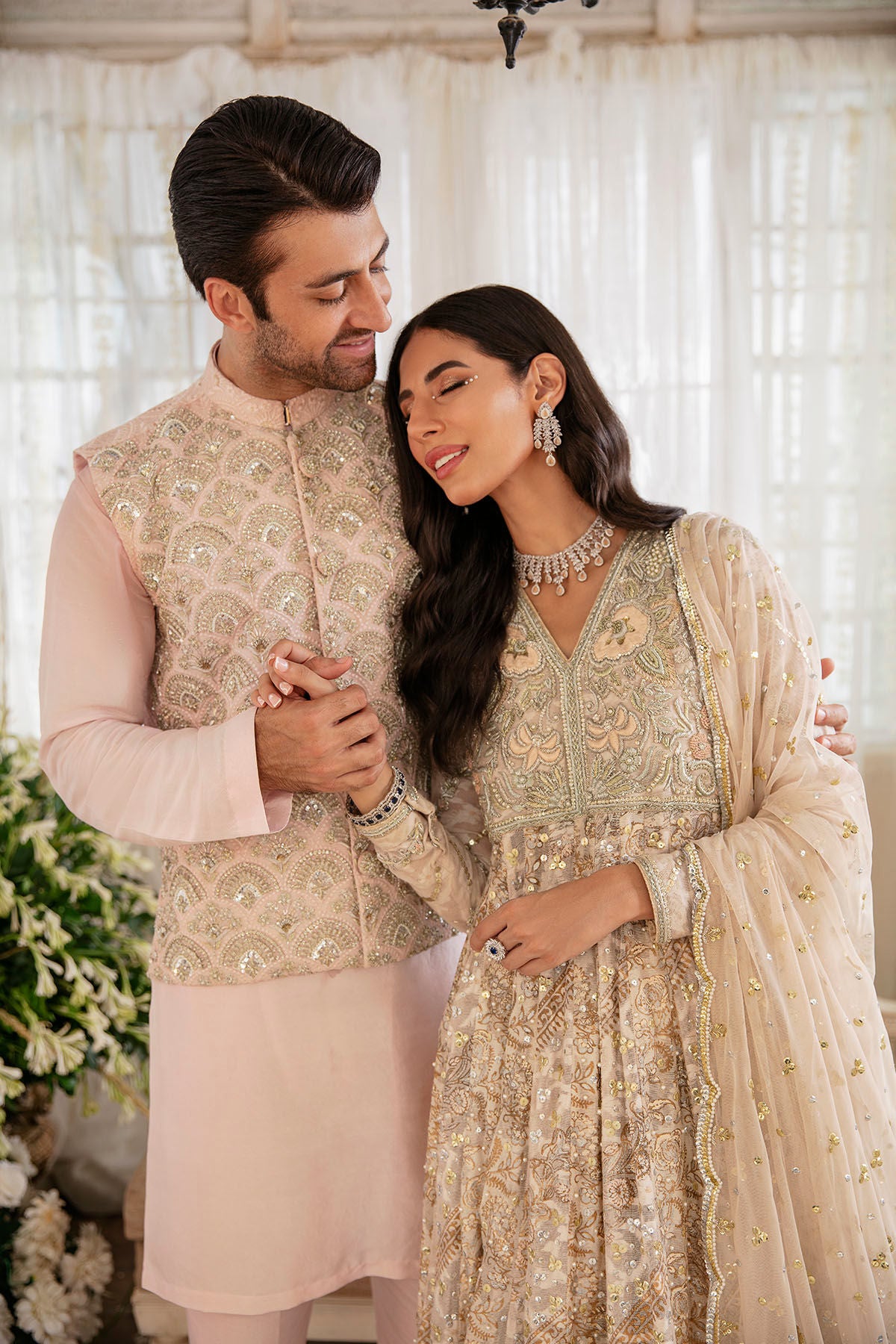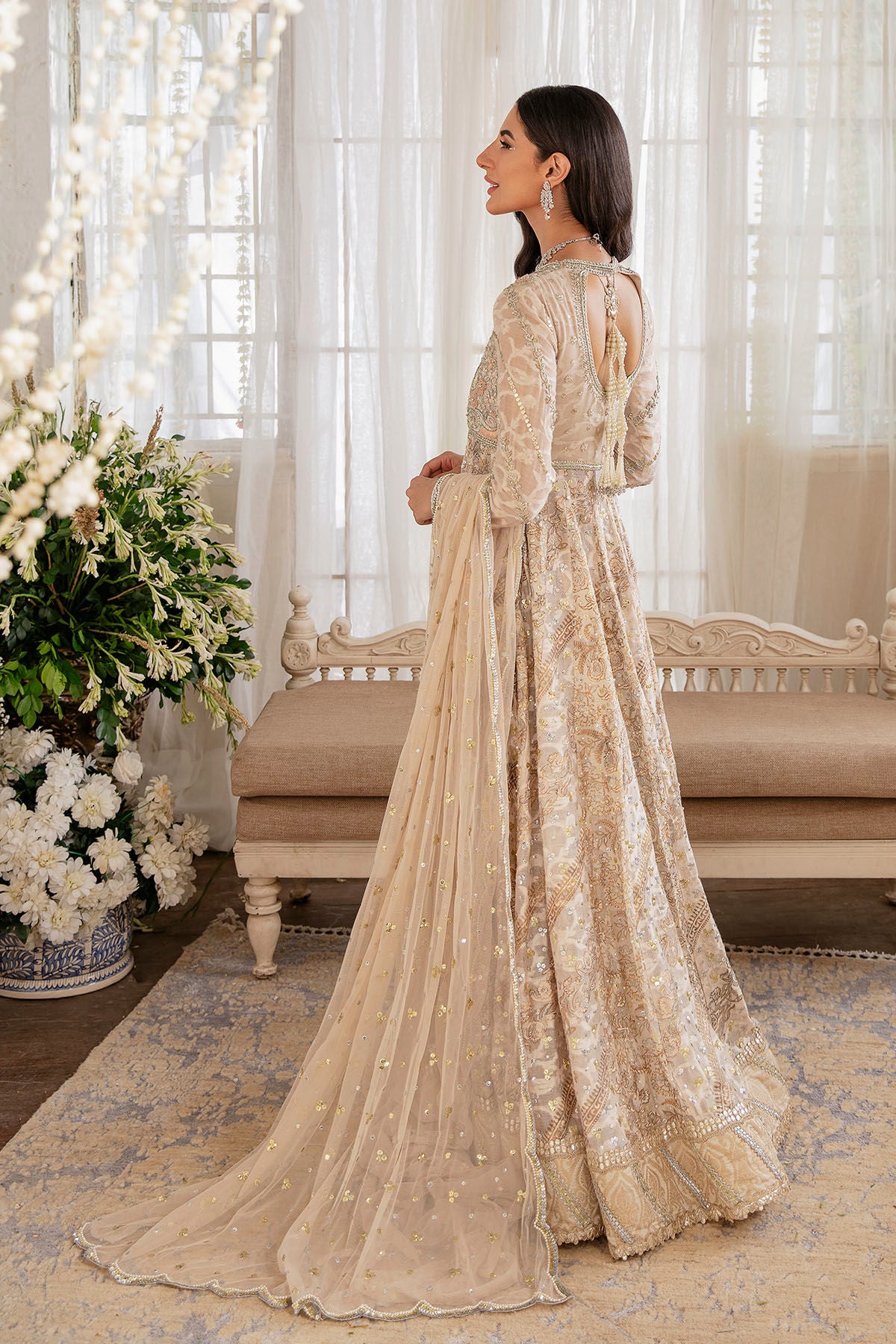 Flared silhouette floor length pishwas in baby pink and peach shades featuring silk thread embroidered bodice which is adorned with zardozi details, sequins and light catching crystals. The multi shaded panels featuring block printed details in silver and gold which are adorned with sequins and light catching crystals, the centre back is adorned with handcrafted pearls tassels and the kalidar is paired with dhaka pajama and net scalloped dupatta featuring pearls and sequins spray.