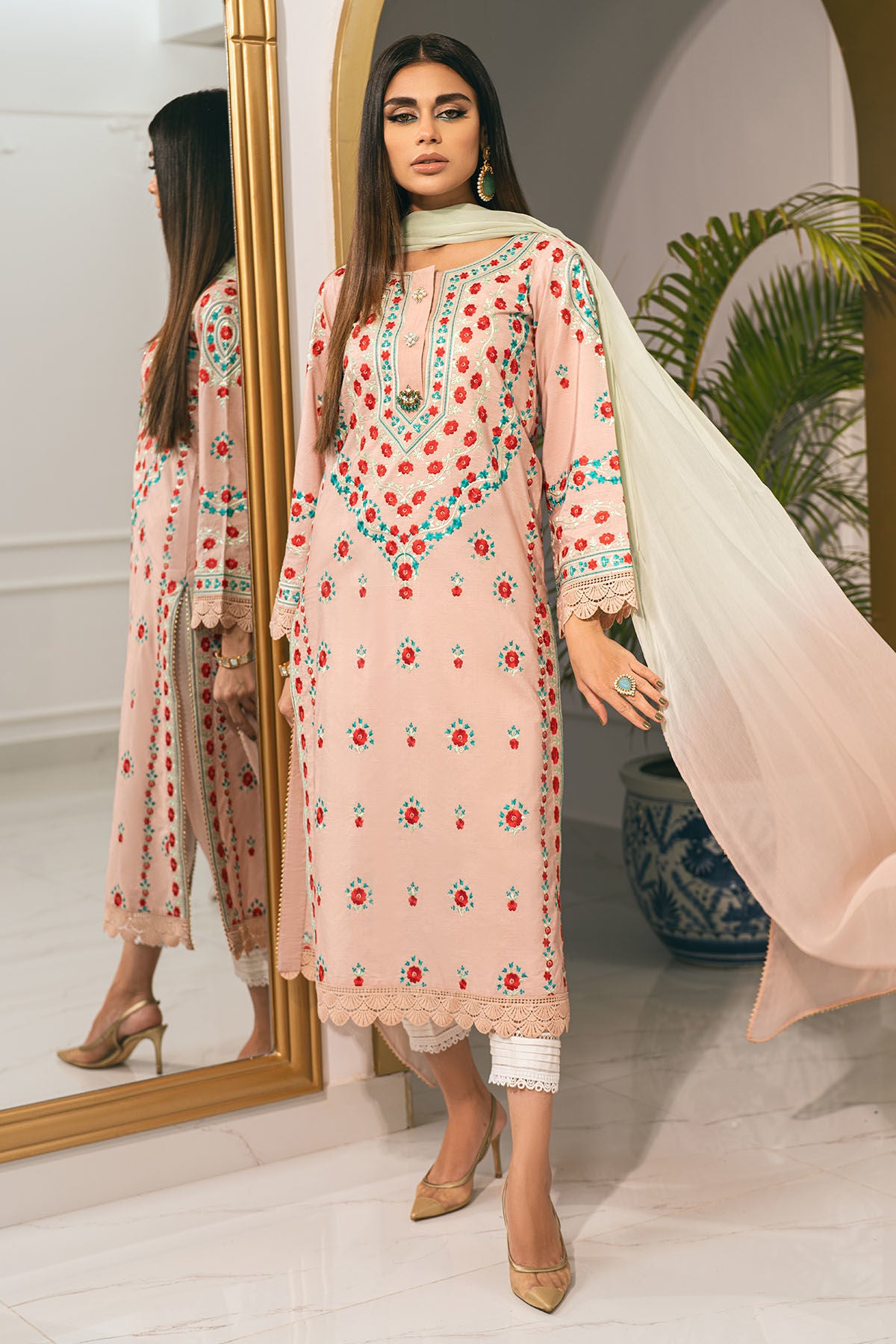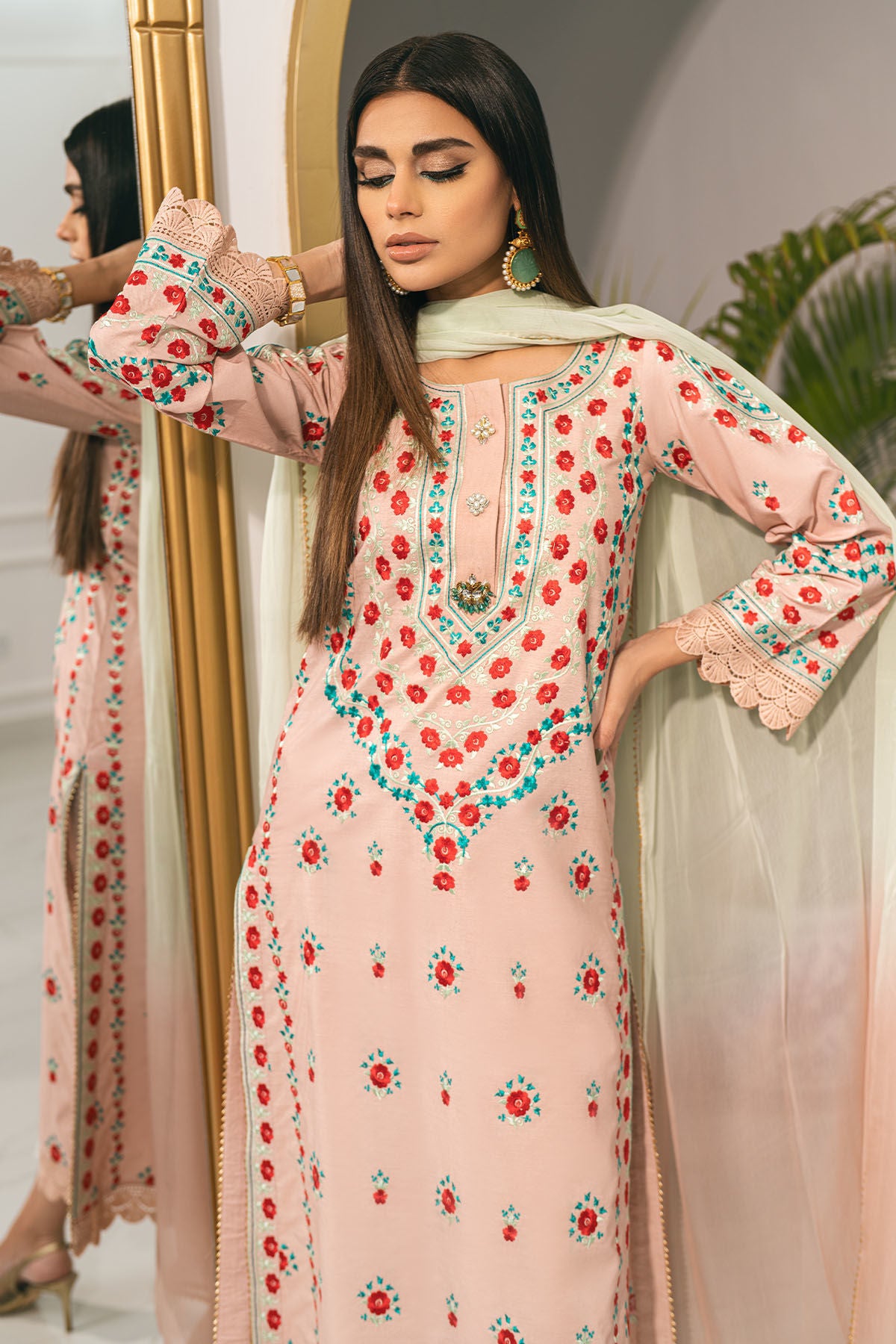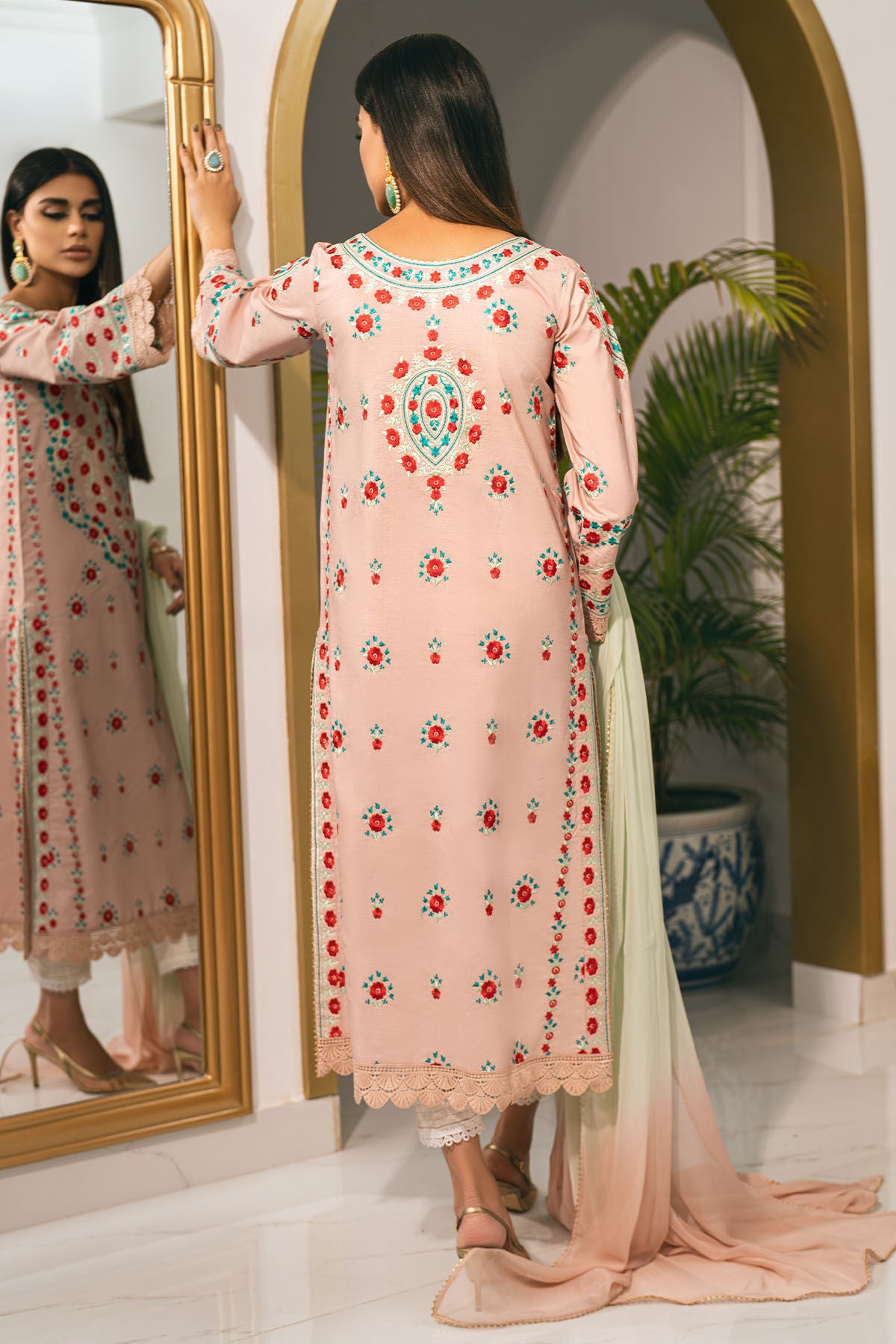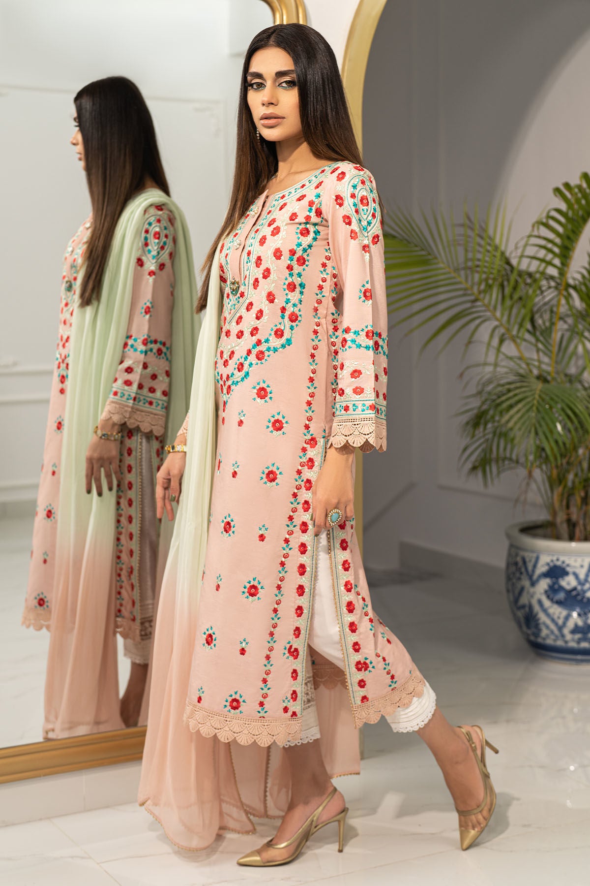 Long silhouette shirt in shade subtle peach enhanced with silk thread rosettes in shades of reds and sea greens. The neckline is enhanced with handcrafted embellishments. The shirt can be paired with zuri pants featuring pleats and embroidered organza panel finished with lace and chiffon ombré dupatta.