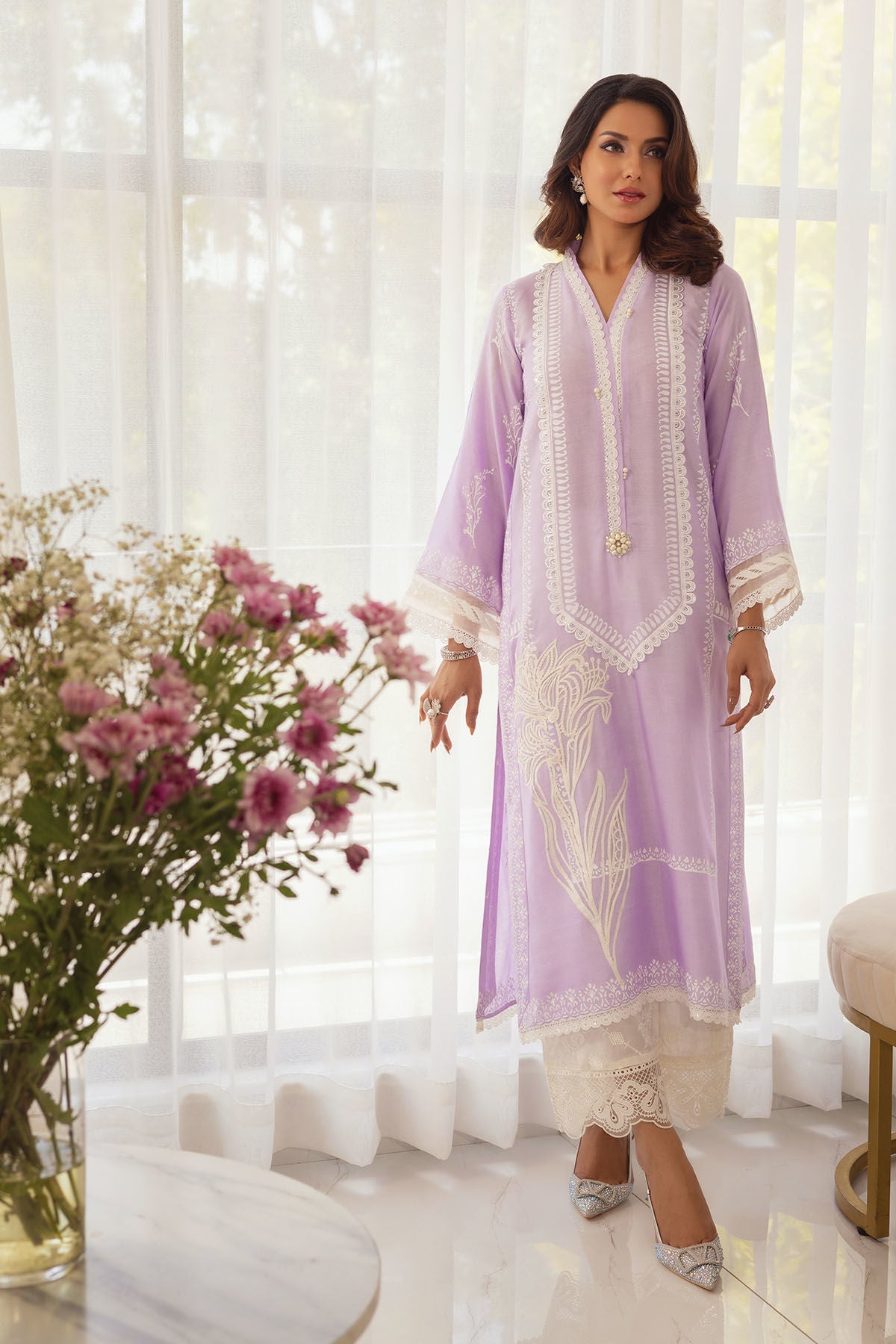 Long silhouette cotton net shirt on dreamy lilac canvas featuring block printed details. The block printed details are adorned with shimmering laces and applique motifs to create a timeless look. The neckline is adorned with handcrafted motifs. The shirt can be paired with Surrina embroidered Izaar featuring schiffli details on hem.