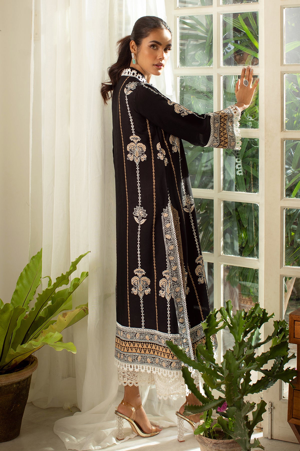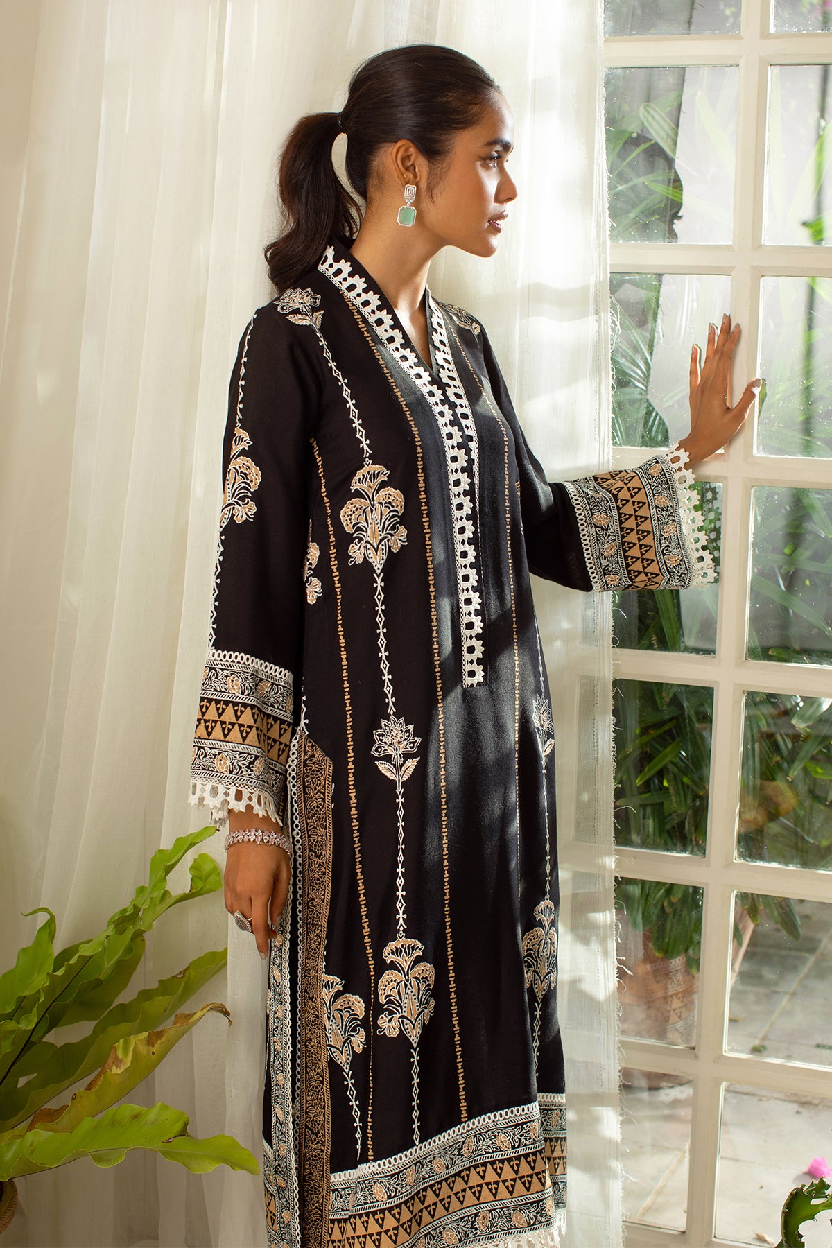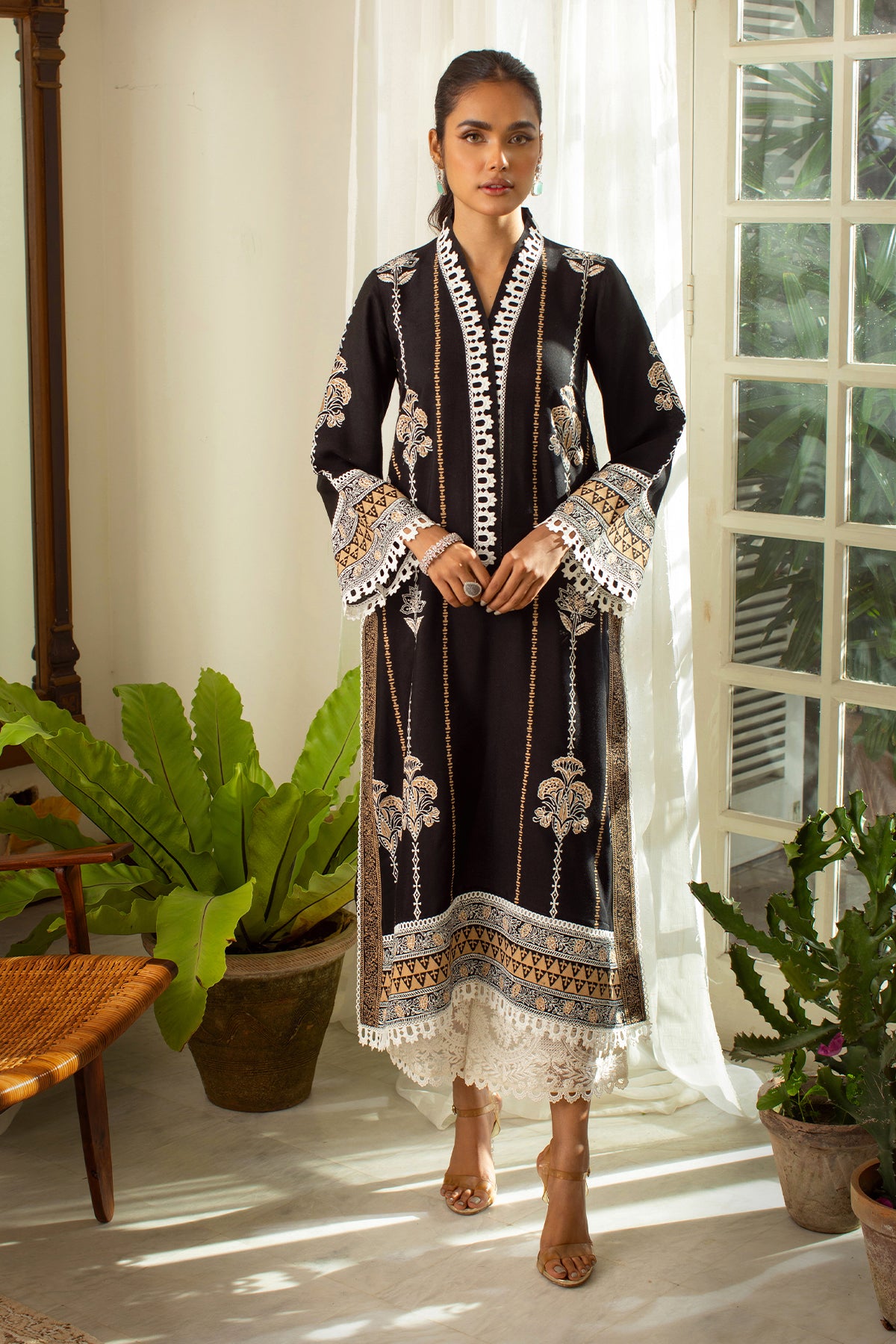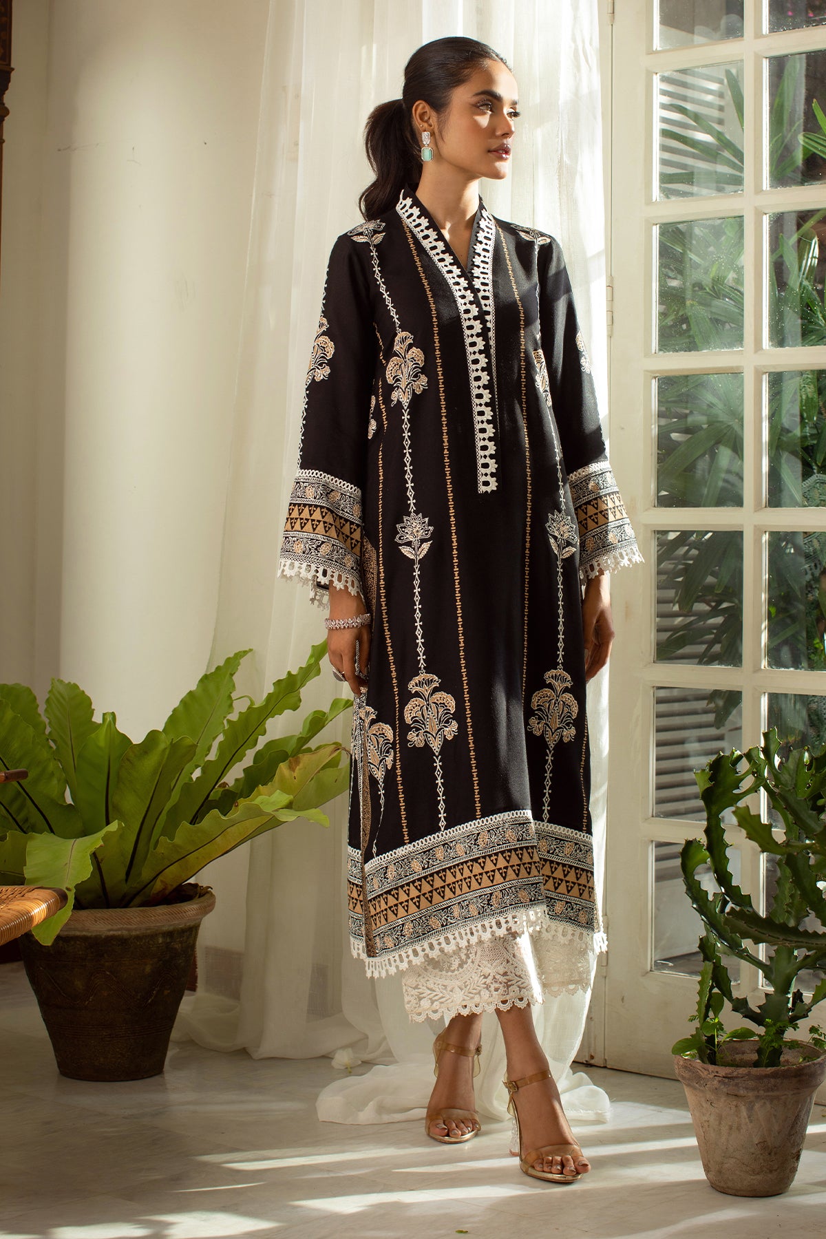 Long silhouette cotton net shirt featuring intricate block printed details in whites and bronzes, the shirt is adorned with white crochet laces and is paired with Azeela cotton izaar featuring pure embroidered organza and laces on hem.