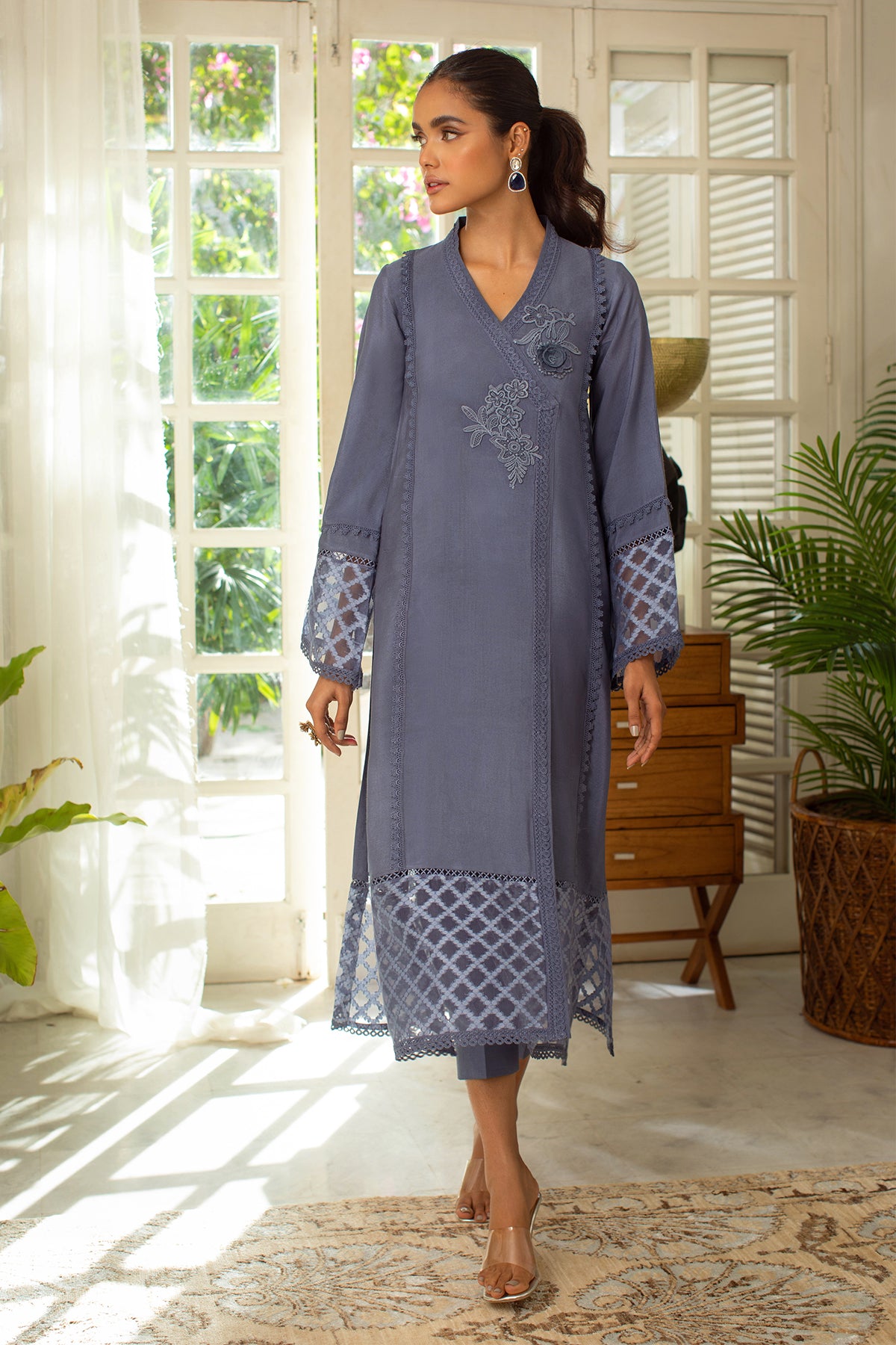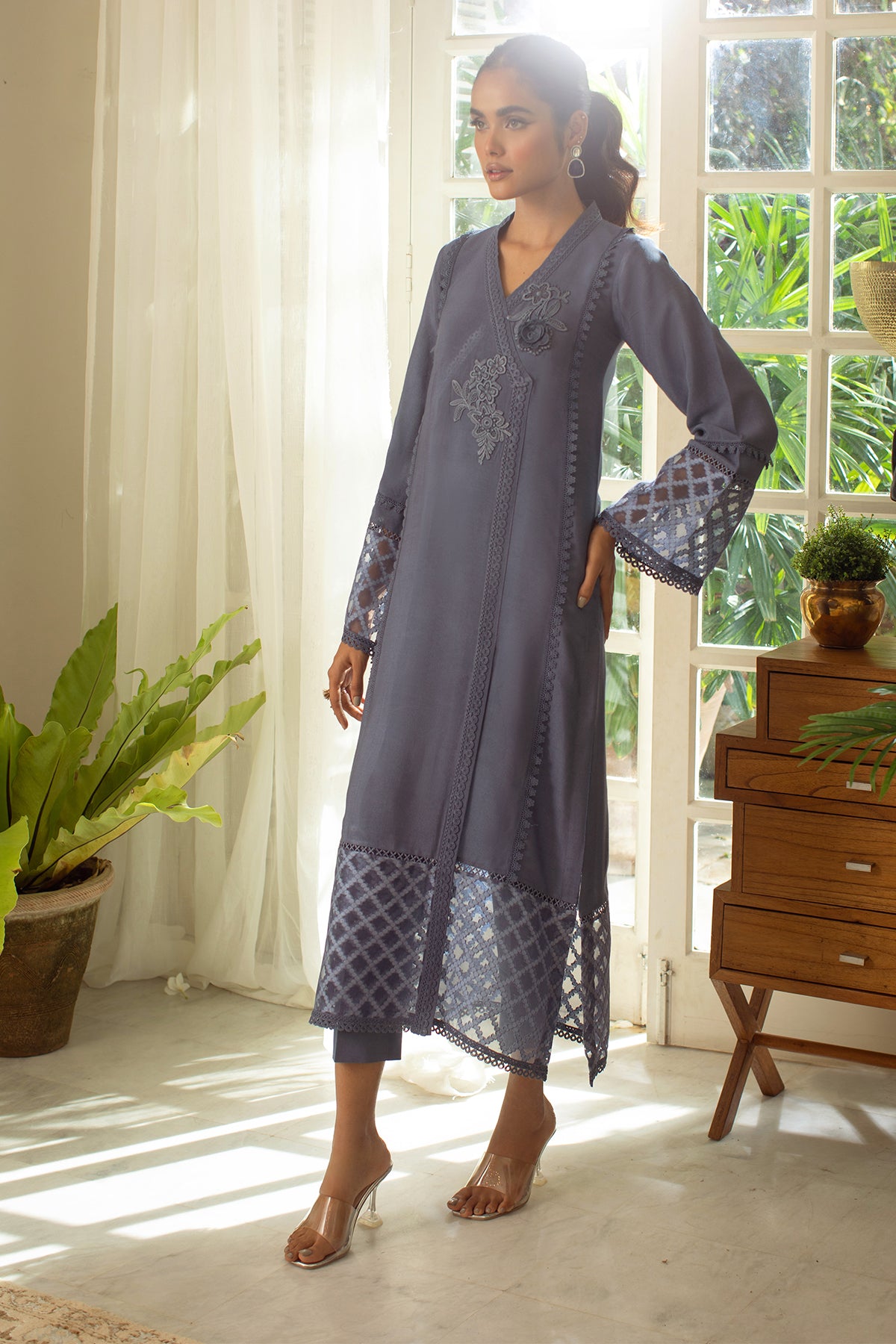 Straight and long silhouette angharka on gorgeous baby blue cotton net canvas featuring lace and appliqué details on centre front, the hemline is adorned with pure embossed organza details, the shirt can be paired with matching straight pants.
