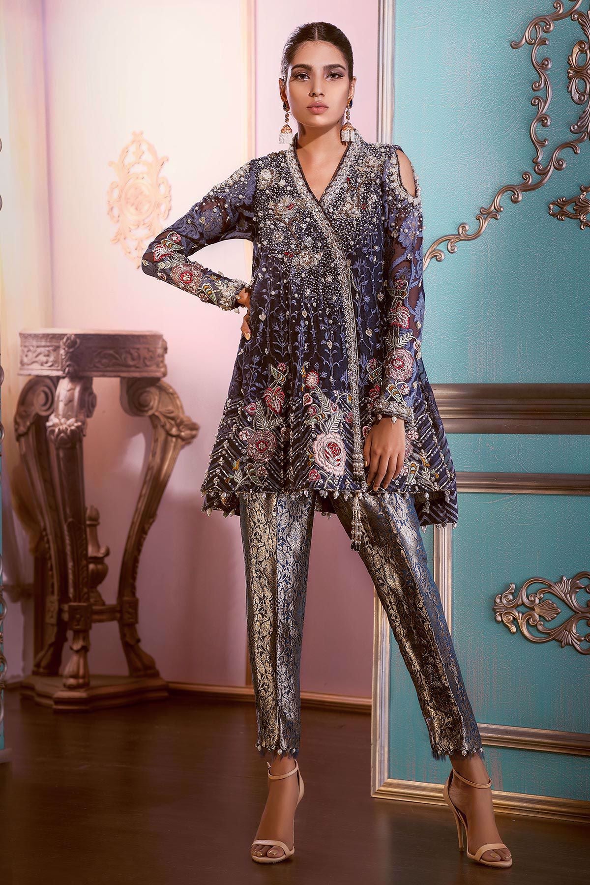 Here's presenting a moment of flawless tranquility- Bejewelled Blue. This masterpiece from Escapade offers a moment of zen in the confines of noise. Annus Abrar has created this design of such grace and royalty that it has a visual emotional effect. In Bejewelled Blue, nothing is jarring forced or contained.it takes you into a world of elegance and helps in elevating your inner beauty. Annus has shown a masterful control of volumes and has defined the embellishments that are chic and desirable. The little bit of structure that is there to enhance then light weights is a beautiful finish to the design.it doesn't stop there; complementing crafted damask pants adds to the imperial effect this outfit from Escapade creates. By entering the occasion in Bejewelled Blue, you will be giving an experience to your audience, of watching a royal procession of an Empress.