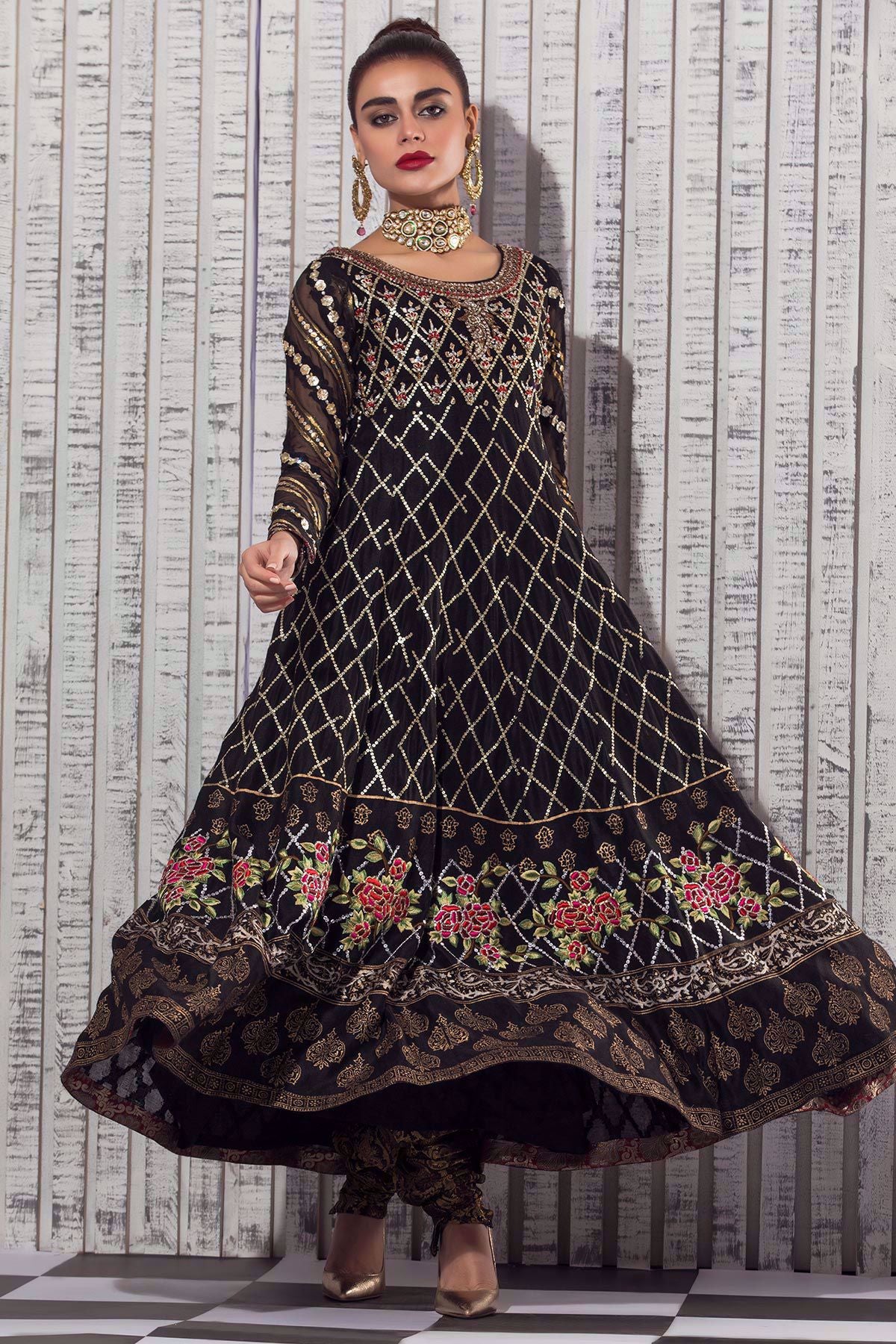 Elegant and old school, this black floor-length long peshwas decorated with floral embroideries, gotta work, antique dabka and block print will make you look glamorous on any occasion. This outfit is completed by a handmade tassel on the back, damask chooridar and weaved dupatta.