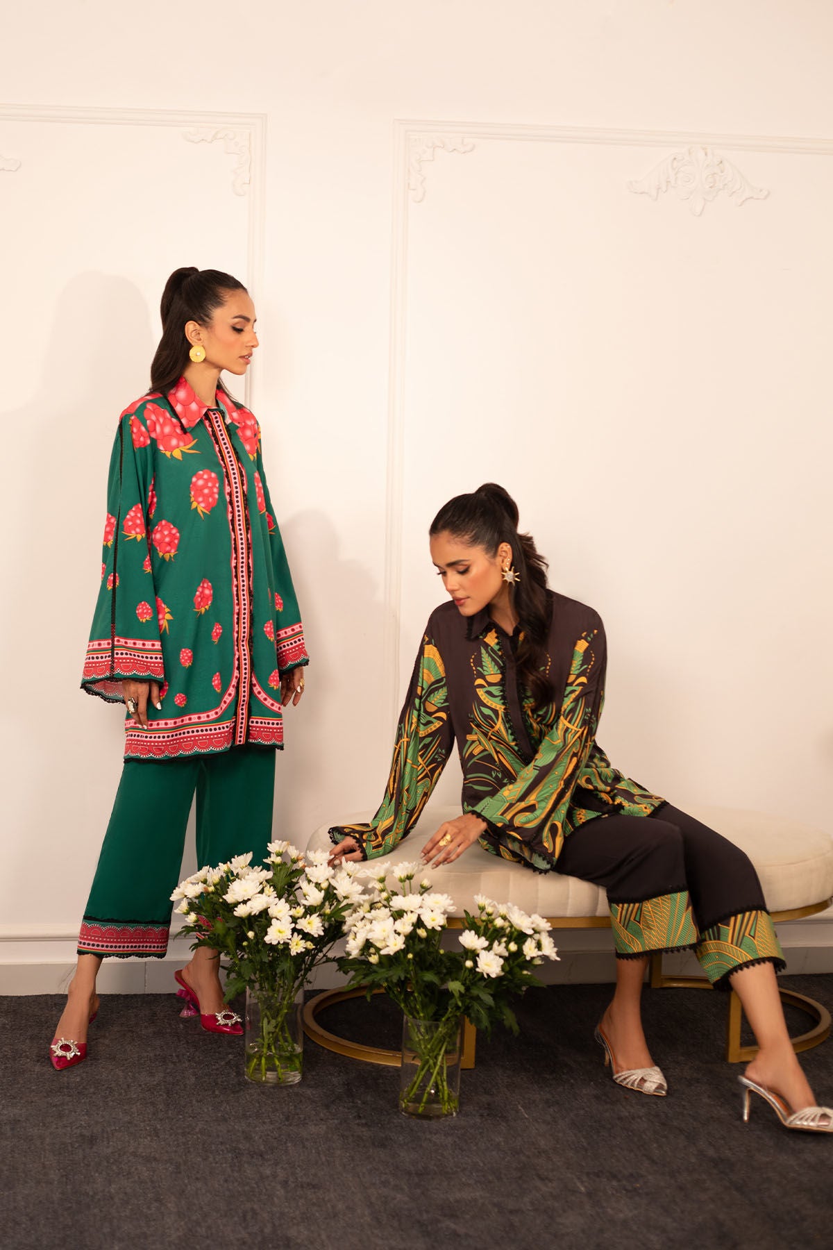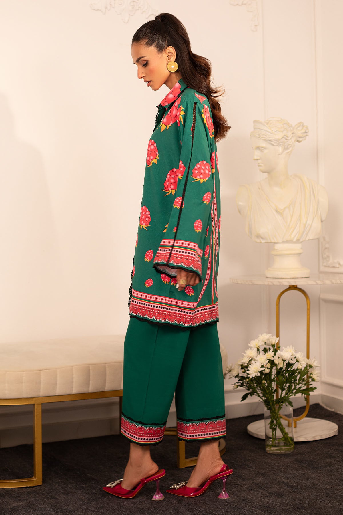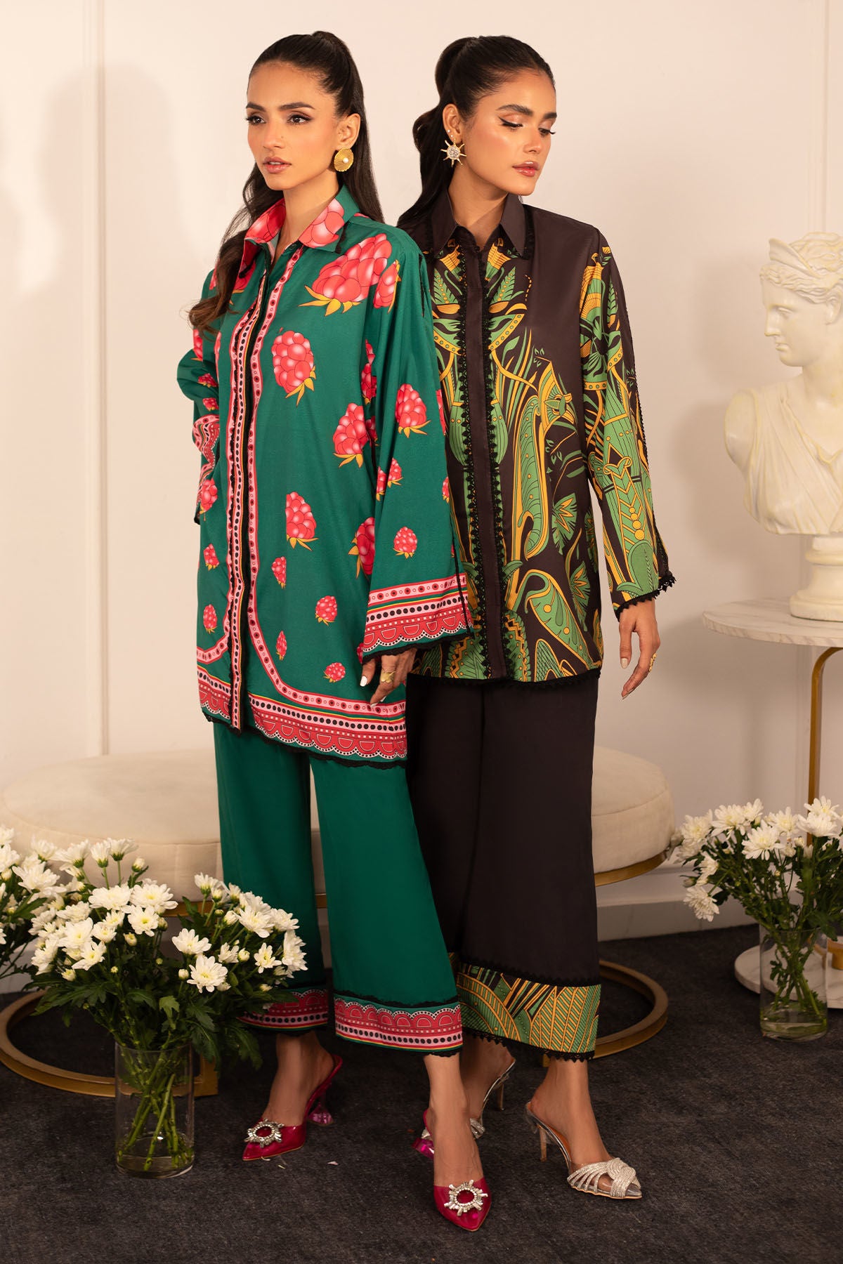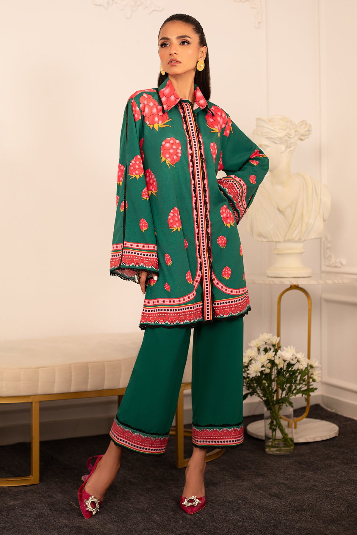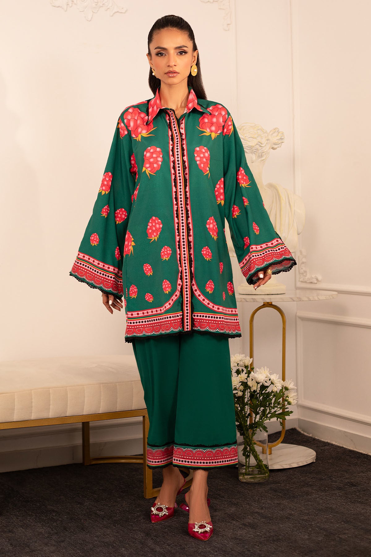 Quirky, trendy yet elegant co-ord set on crepe silk featuring balanced and carefully crafted prints, enhanced with lace details, is a must-have in your closet this summer.