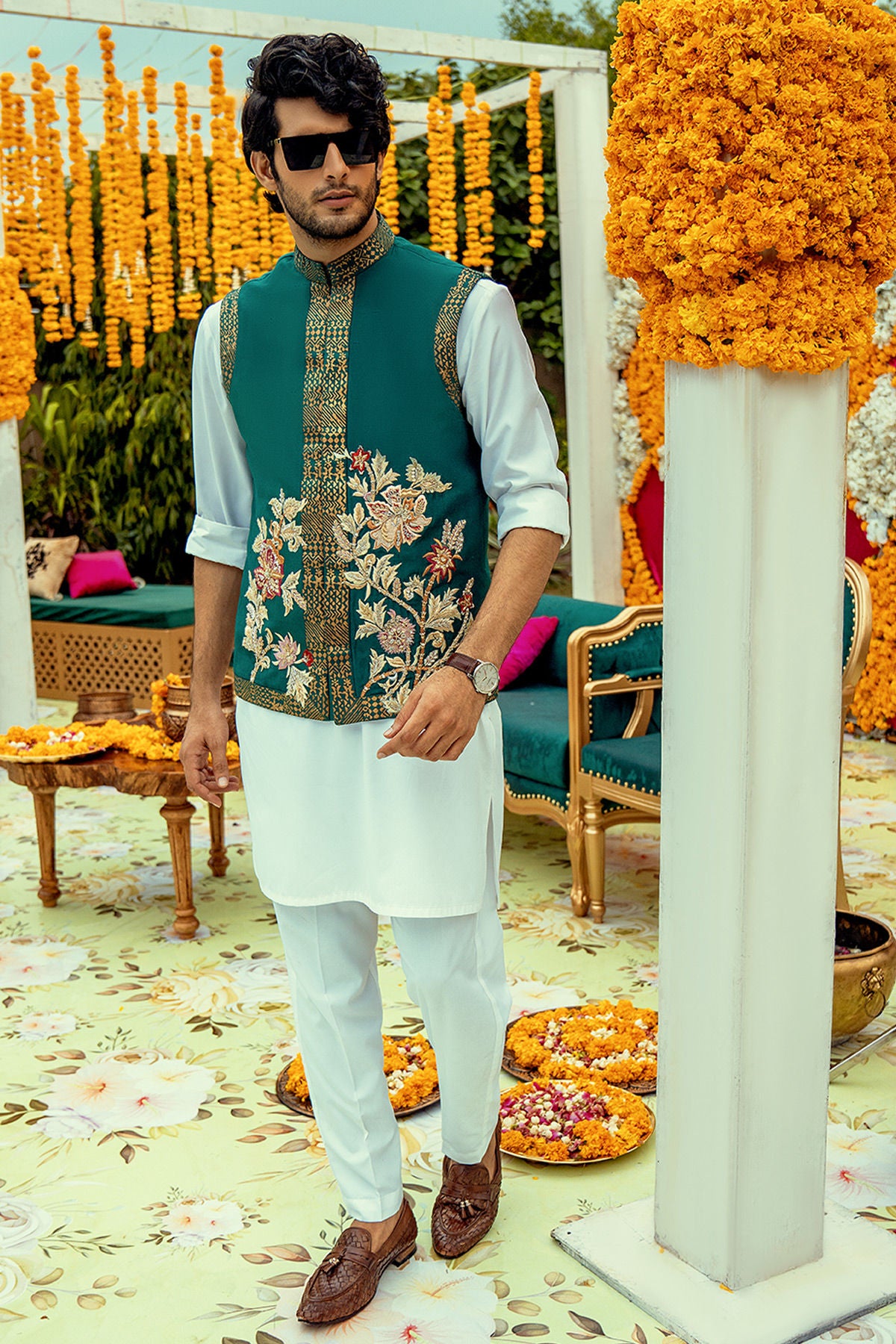 Emerald green pure raw silk waistcoat with hand block printed details which is further enhanced with silk thread embroidered motifs, the motifs are further adorned with light catching crystals and zardozi details. The waistcoat is paired with off white kurta shalwar.