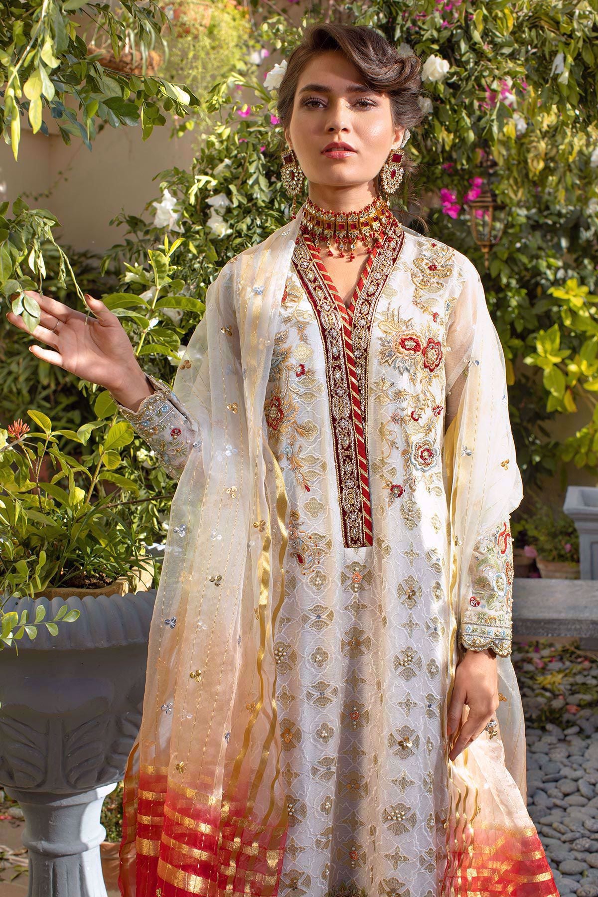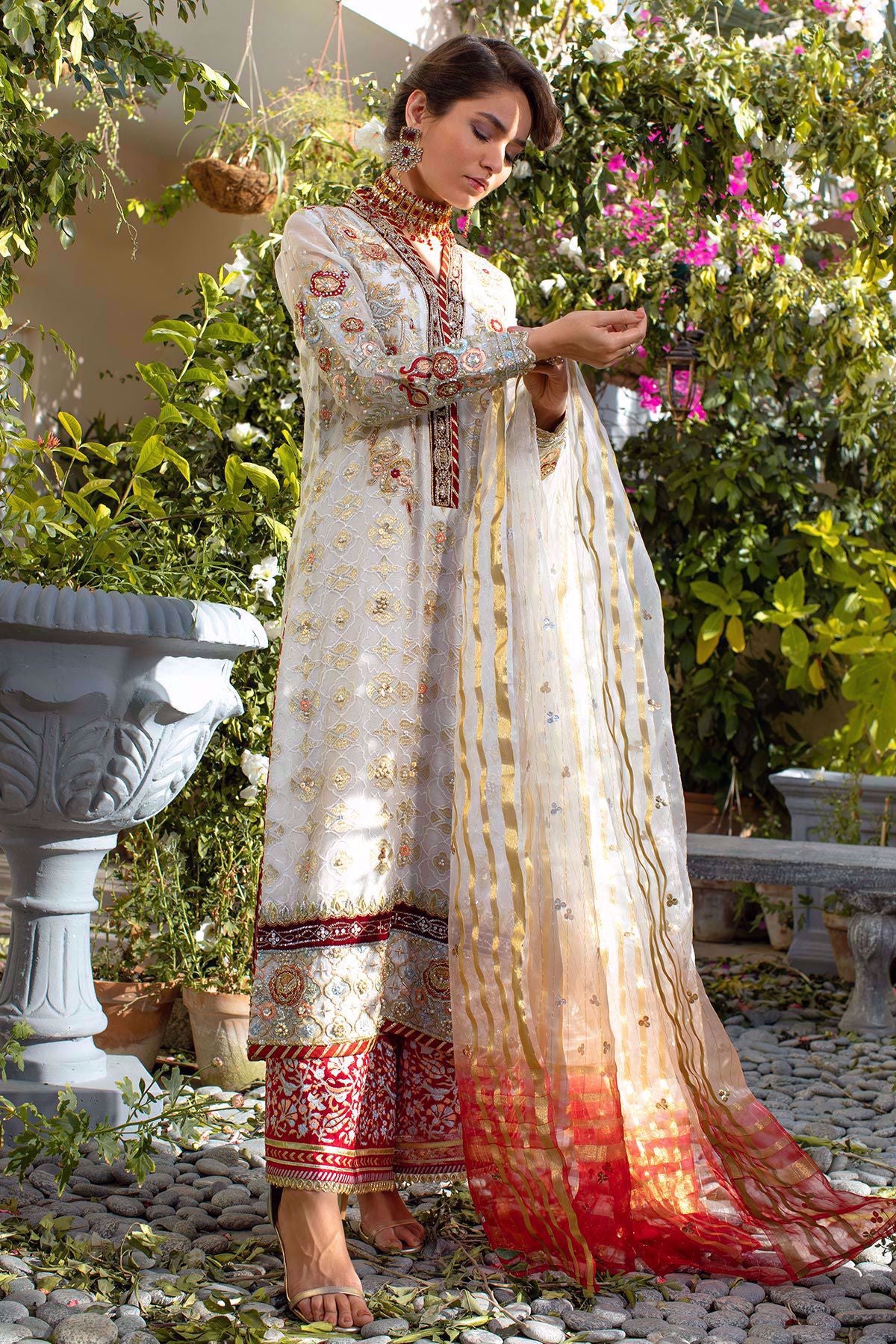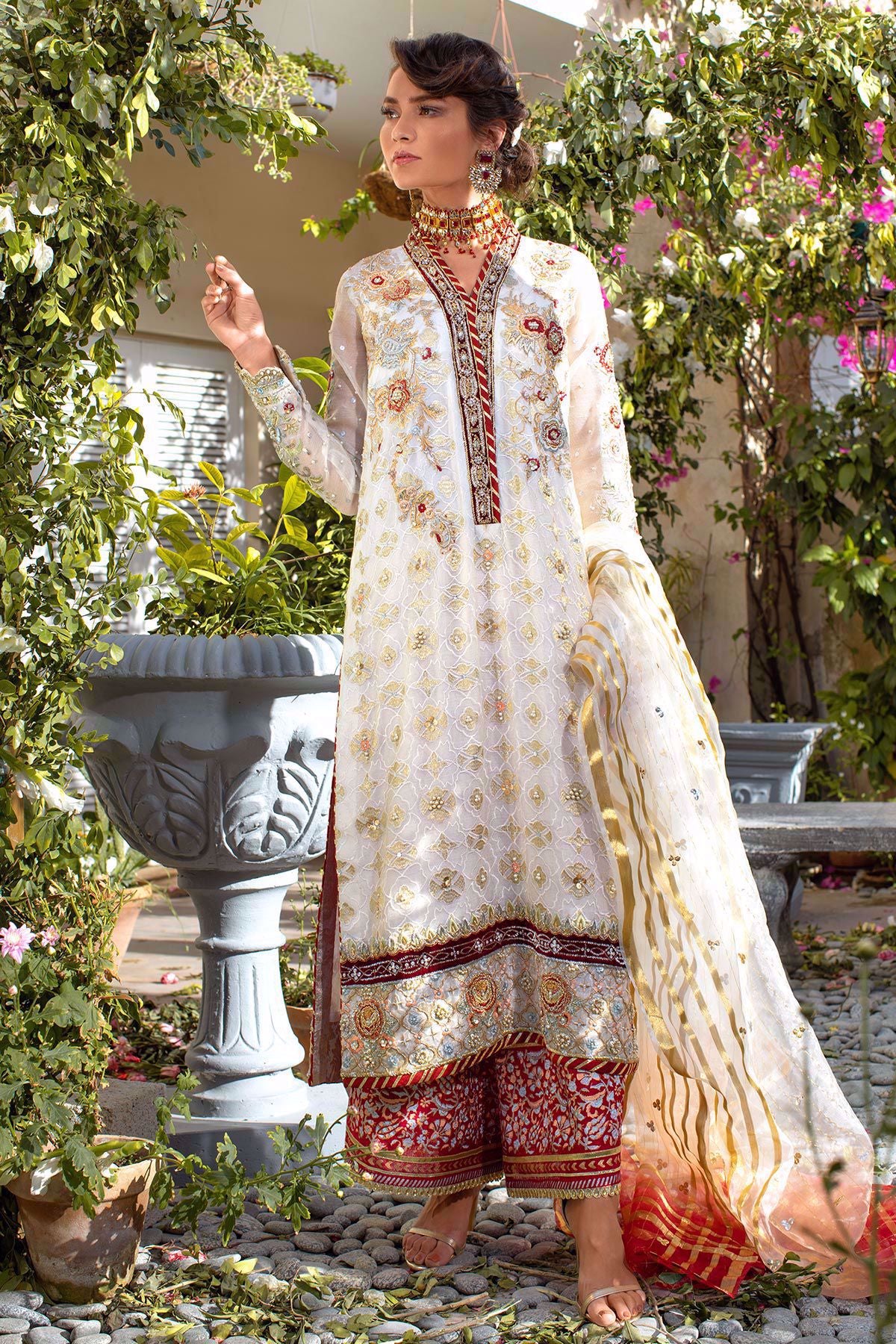 Zari net long shirt with silk thread rosettes details on neckline and hemline of the shirt. The neckline is further enhanced with dabka, kora, pearls and light catching crystals incorporated with dabka details on velvet canvas. The shirt comes with hand block printed izaar with gota finishing’s. Ombré organza dupatta with zari details incorporated with sequins completes this outfit.