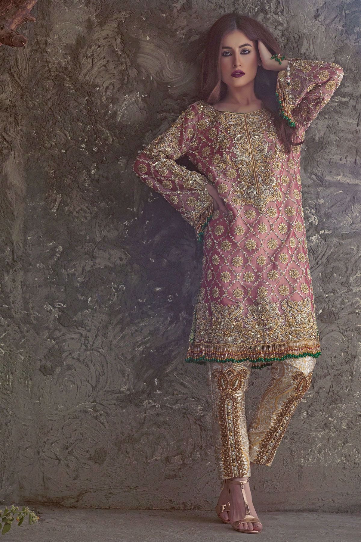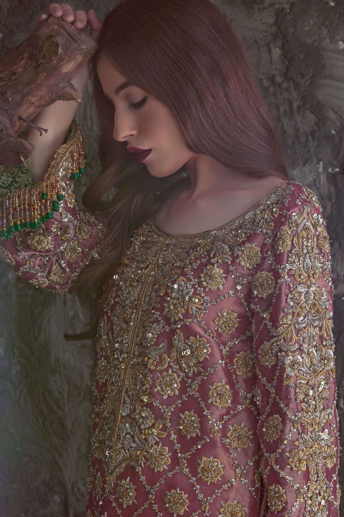 This super stunning deep pink Lame shirt is heavily worked with zardoze embroidery on the neckline and hemline. The shirt ha straight silhouette and the hemline is further enhanced with handmade tassels. The shirt comes with hand embroidered damask straight pants.